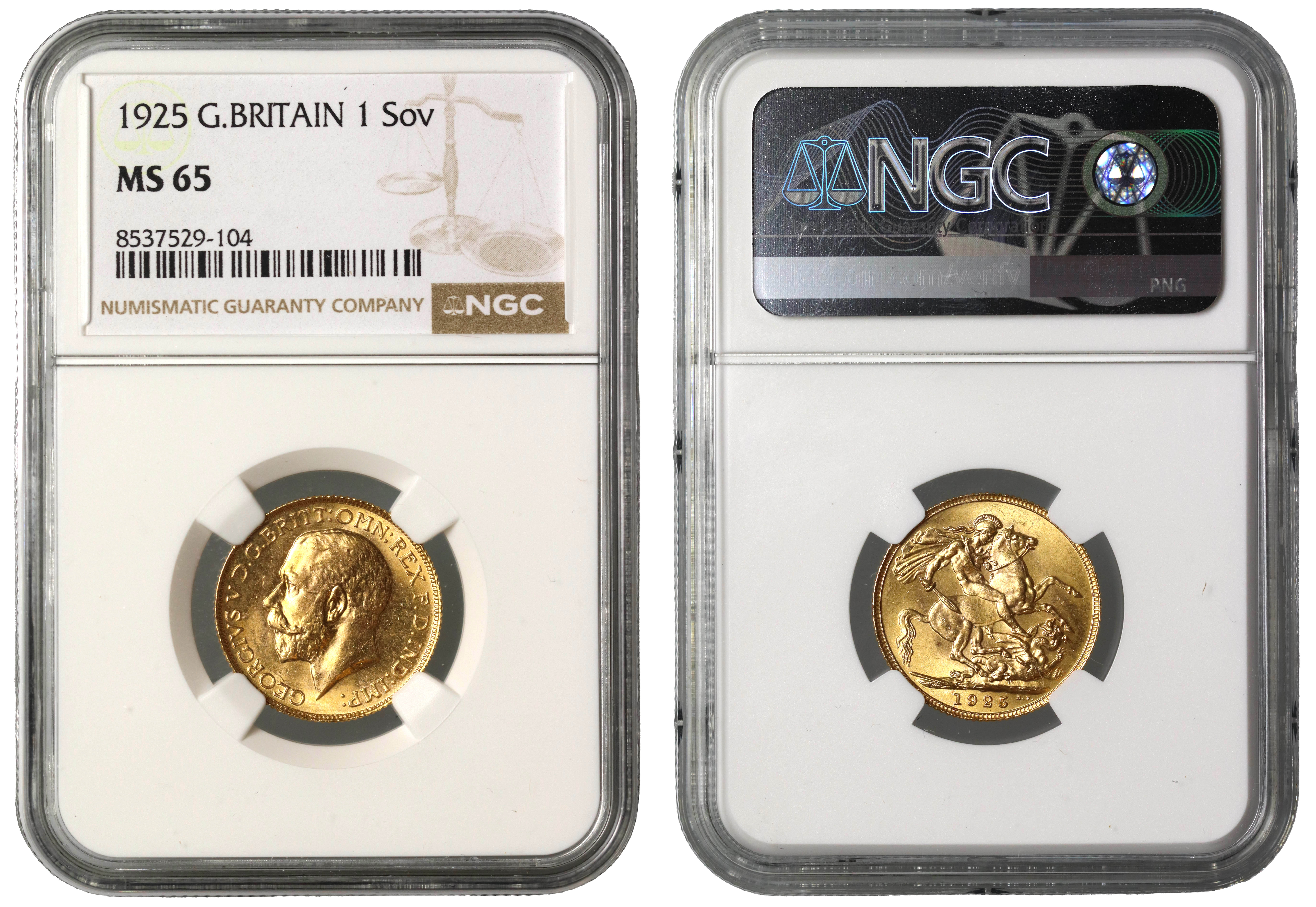 g George V (1910-36), gold Sovereign, 1925, bare head left, B.M. on truncation, GEORGIVS V D.G. BRITT: OMN: REX F.D. IND: IMP:, rev. St George slaying the dragon right, WWP under lance, date in exergue, B.P. to upper right of exergue (Marsh 220; S.4003). Slabbed and graded by NGC as MS65.