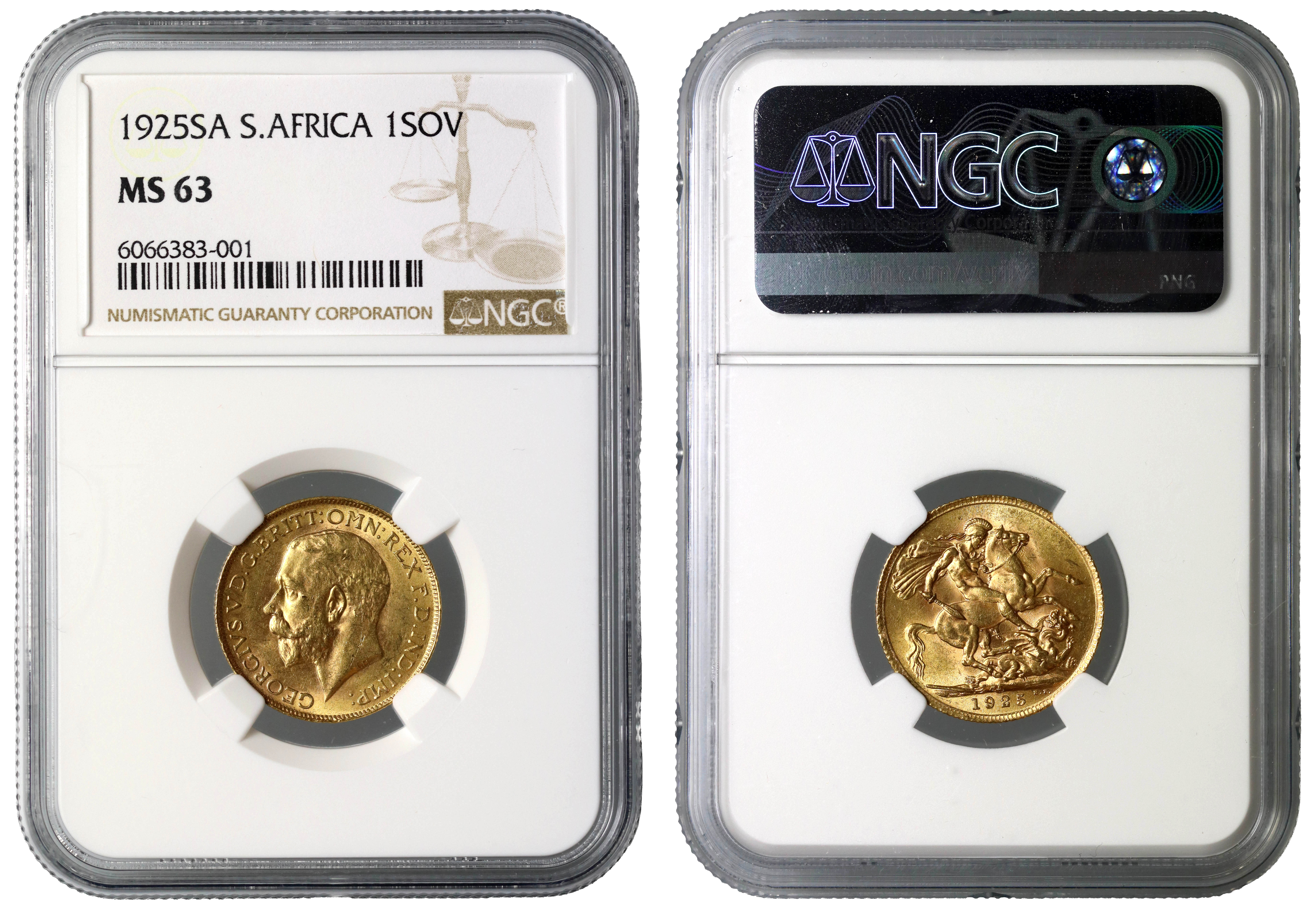 g George V (1910-36), gold Sovereign, 1925 SA, Pretoria, South Africa Mint, bare head left, B.M. on truncation, GEORGIVS V D.G. BRITT: OMN: REX F.D. IND: IMP:, rev. St George slaying the dragon right, WWP under lance, Mint letters SA at centre of ground-line, date in exergue, B.P. to upper right of exergue (Hill 289; S.4004). Slabbed and graded by NGC as MS63.