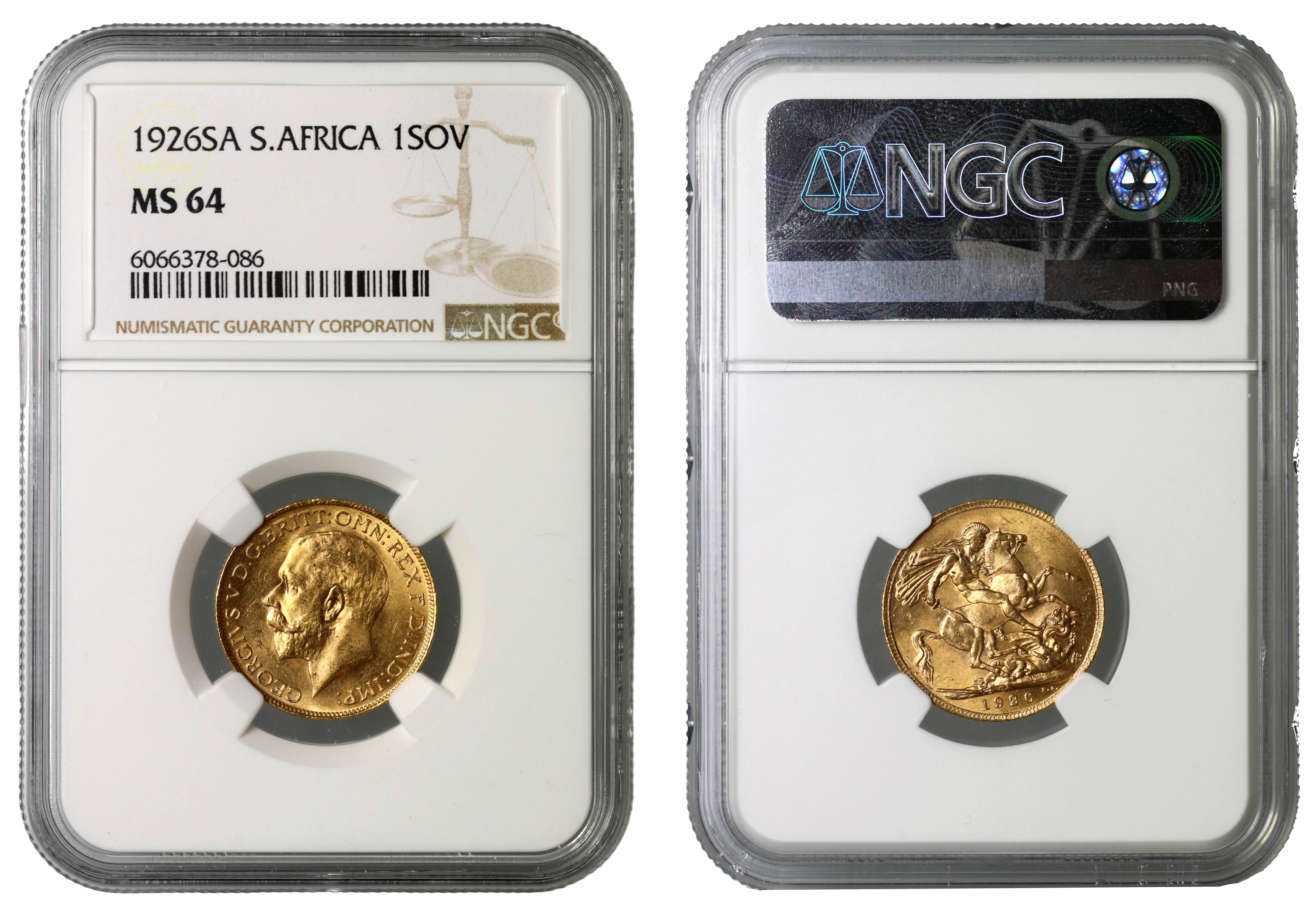 g George V (1910-36), gold Sovereign, 1926 SA, Pretoria, South Africa Mint, bare head left, B.M. on truncation, GEORGIVS V D.G. BRITT: OMN: REX F.D. IND: IMP:, rev. St George slaying the dragon right, WWP under lance, Mint letters SA at centre of ground-line, date in exergue, B.P. to upper right of exergue (Hill 290; S.4004). Slabbed and graded by NGC as MS64.