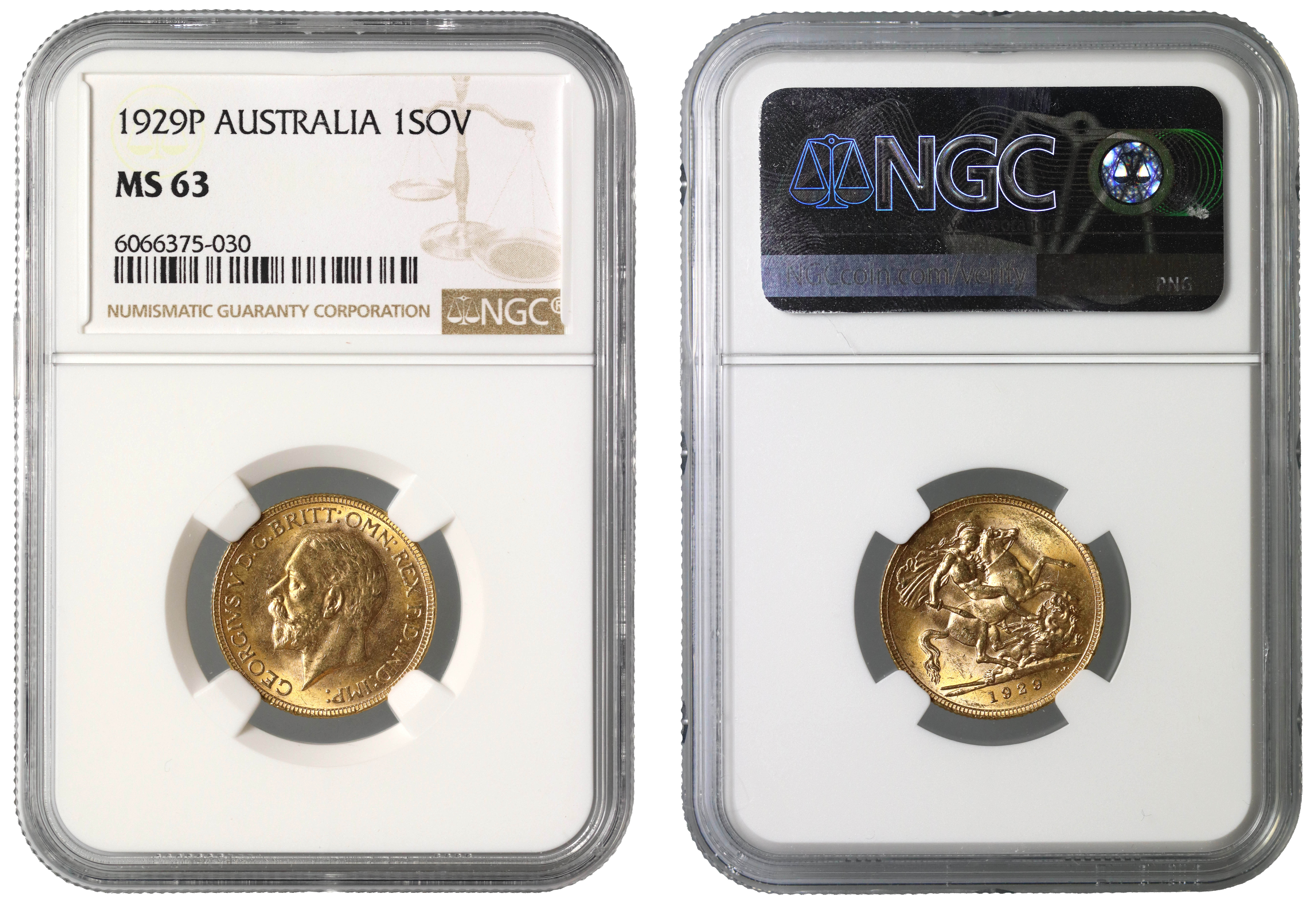 g George V (1910-36), gold Sovereign, 1929 P, Perth Mint, Australia, second smaller bare head left, B.M. on truncation, GEORGIVS V D.G. BRITT: OMN: REX F.D. IND: IMP:, rev. St George slaying the dragon right, WWP under lance, Mint letter P at centre of ground-line, date in exergue, B.P. to upper right of exergue (Hill 268; S.4002). Slabbed and graded by NGC as MS63.