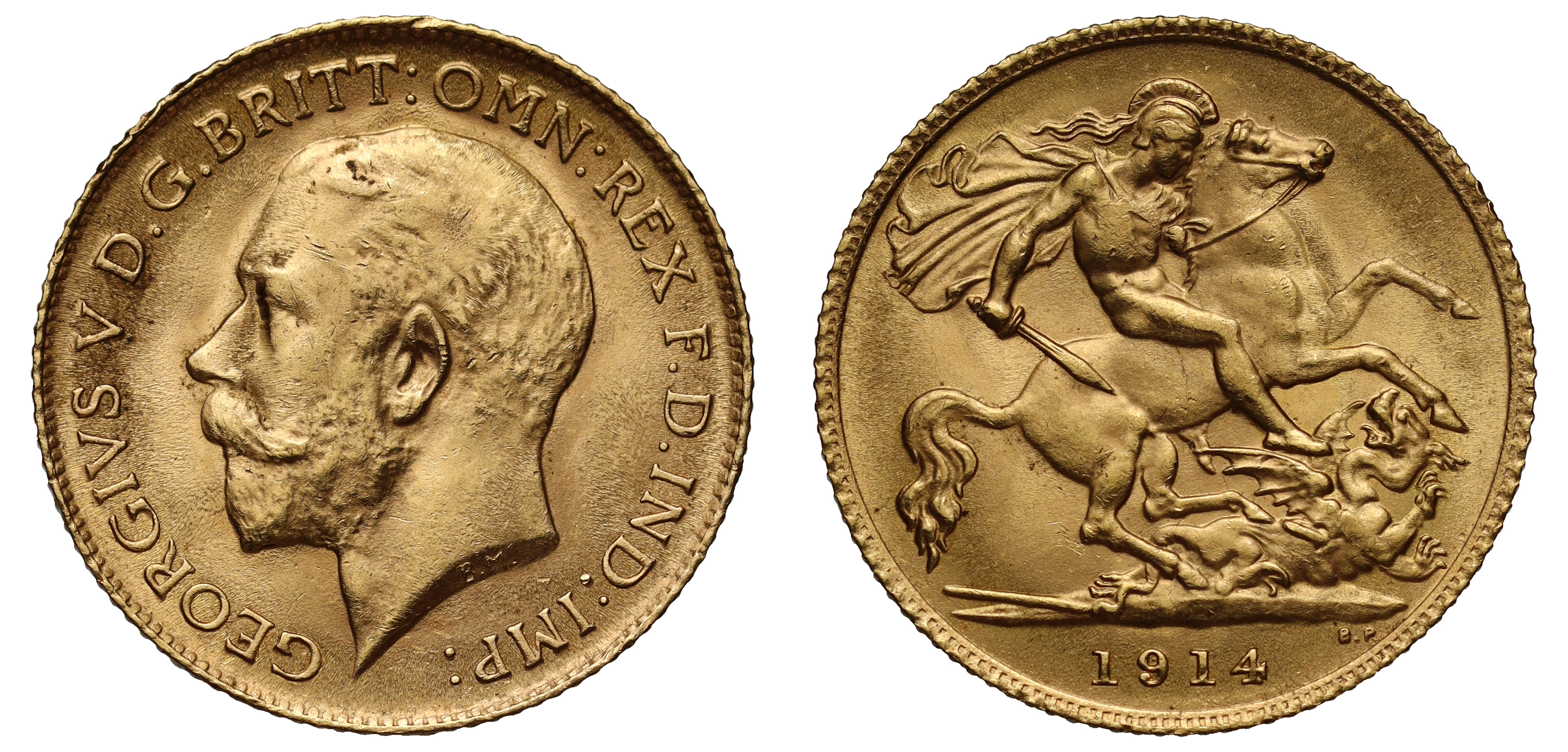g George V (1910-36), gold Half Sovereign, 1914, bare head left, BM on truncation for engraver Bertram Mackennal, Latin legend and toothed border surrounding, GEORGIVS V D. G. BRITT: OMN: REX F. D. IND: IMP:, rev. St. George slaying the dragon right, date in exergue, B.P. to upper right of exergue for designer Benedetto Pistrucci, 3.98g (Hill 529; Bull EGC 1447; MCE 650; S.4006). Toned, spot on top of head, practically extremely fine.