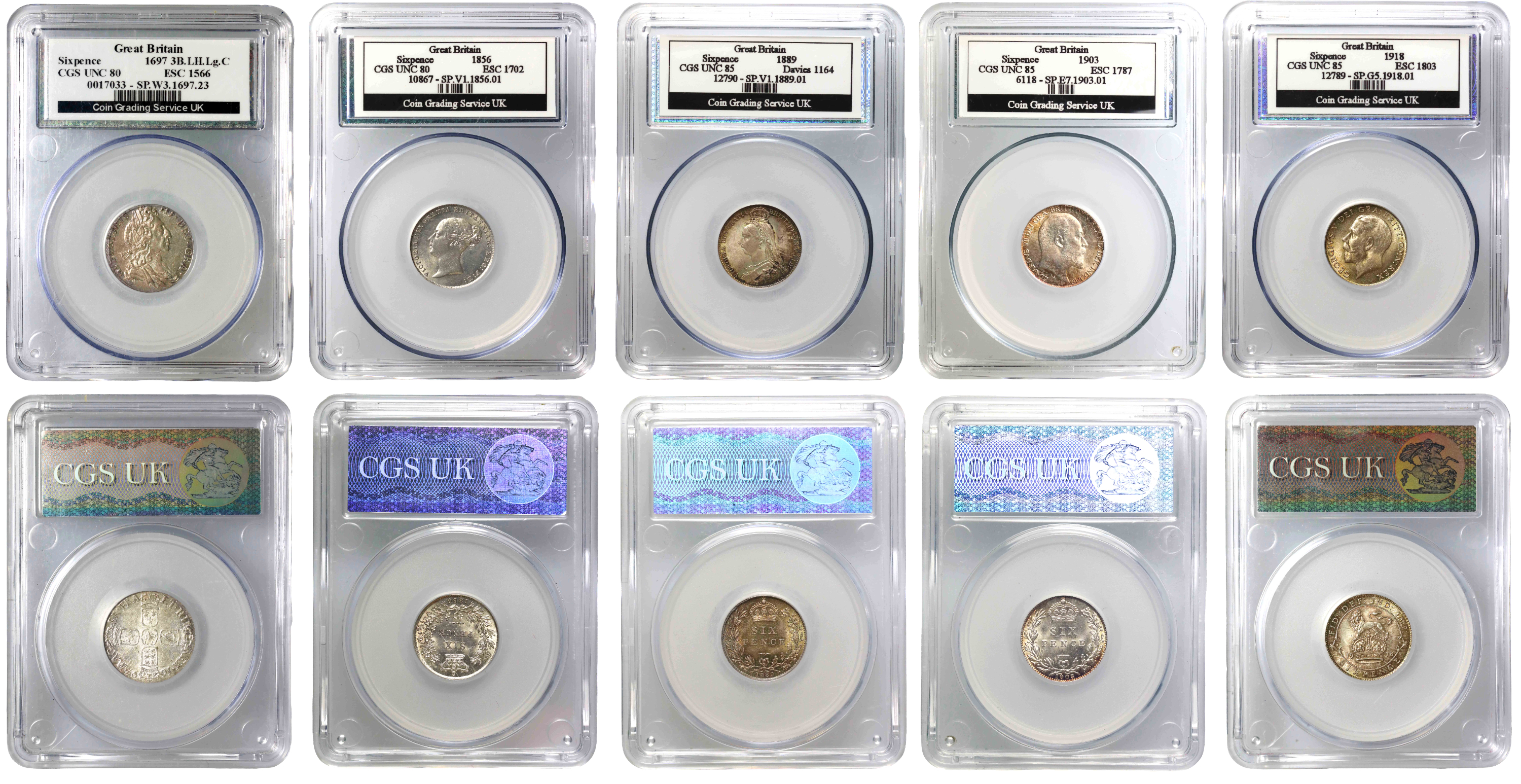 William III (1694-1702), silver Sixpence, 1697, third laureate and draped bust right, legend and toothed border surrounding, GVLIELMVS. III. DEI. GRA., rev. crowned cruciform shields, large crowns, Lion of Nassau at centre, date either side of top crown, .MAG BR.FRA ET.HIB REX. (Bull 1233; ESC 1566; S.3538). A superb example with strong residual mint lustre, graded by CGS as UNC 80. Victoria (1837-1901), silver Sixpence, 1856, First young head left, legend VICTORIA DEI GRATIA BRITANNIAR: REG: F: D:, toothed border surround, rev. crowned mark of value within oak wreath, date below, edge milled, (ESC 1702; Bull 3196; Davies 1053; S.3908). Lightly toned with much brilliance, slabbed and graded by CGS as UNC 80. Victoria (1837-1901), silver Sixpence, 1889, Jubilee crowned bust left, with initials J.E.B. in field below bust, Latin legend and toothed border surrounding, VICTORIA DEI GRATIA BRITT: REGINA F: D:, rev. crowned words of value within laurel and oak wreath, date below (ESC 1757; Bull 3279; Davies 1164; S.3929). Unevenly toned, slabbed and graded by CGS as UNC 85. Edward VII (1901-10), silver Sixpence, 1903, bare head right, DES below truncation for engraver George William De Saulles, Latin legend and toothed border surrounding, EDWARDVS VII D: G: BRITT: OMN: REX F: D: IND: IMP: rev. crowned mark of value within laurel and oak wreath, date below (ESC. 1787; Bull 3599; Davies 1571; S.3983). Some toning, slabbed and graded by CGS as UNC 85. George V (1910-36), silver Sixpence, 1918, bare head left, BM on truncation for engraver Bertram MacKennal, Latin legend and toothed border surrounding, GEORGIVS V DEI GRA: BRITT: OMN: REX, rev. lion standing left on crown, date either side, linear circle around with Latin legend in upper half, FID: DEF: IND: IMP:, denomination SIXPENCE in lower periphery, (ESC 1803; Bull 3879; Davies 1870; S.4014). Toned, slabbed and graded by CGS as UNC85.