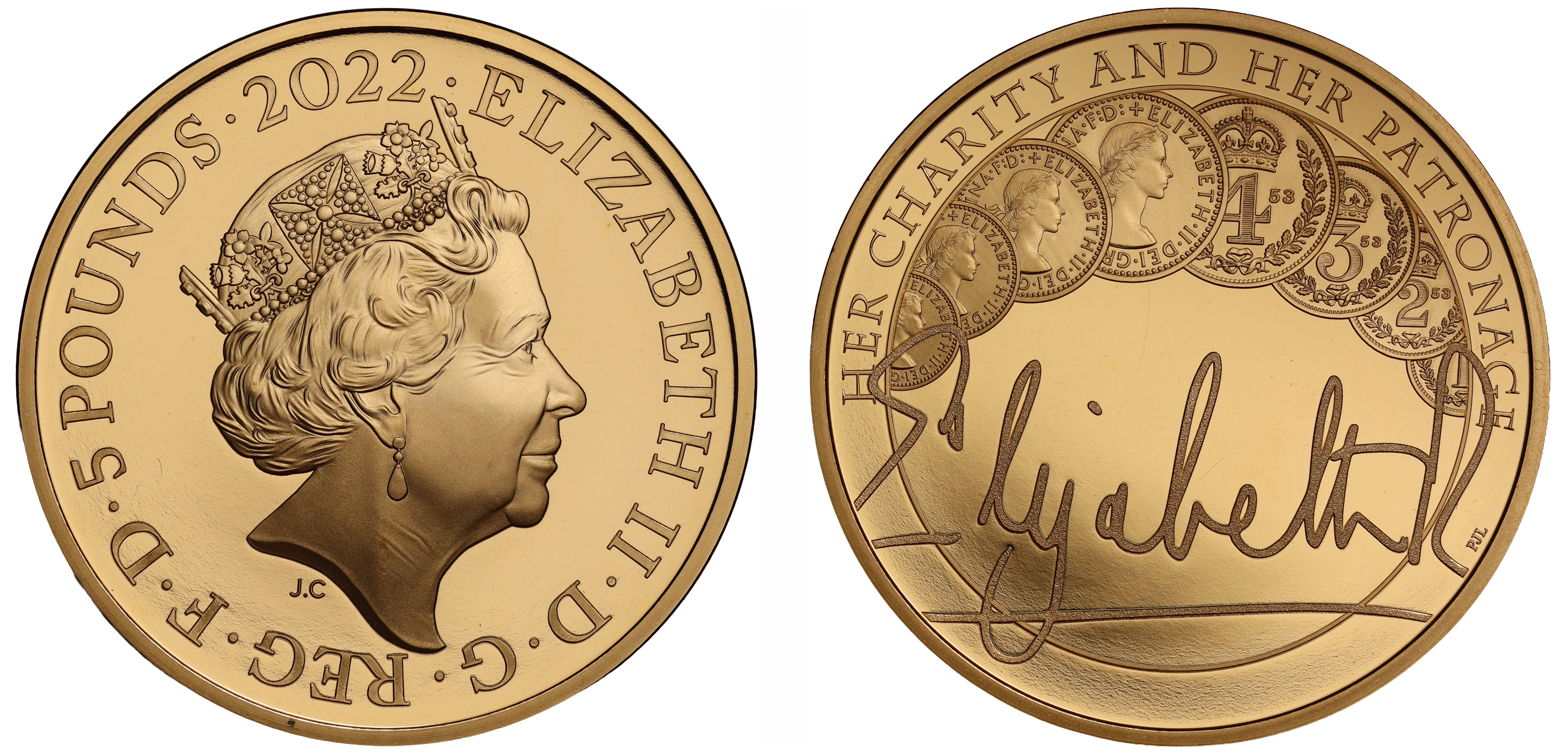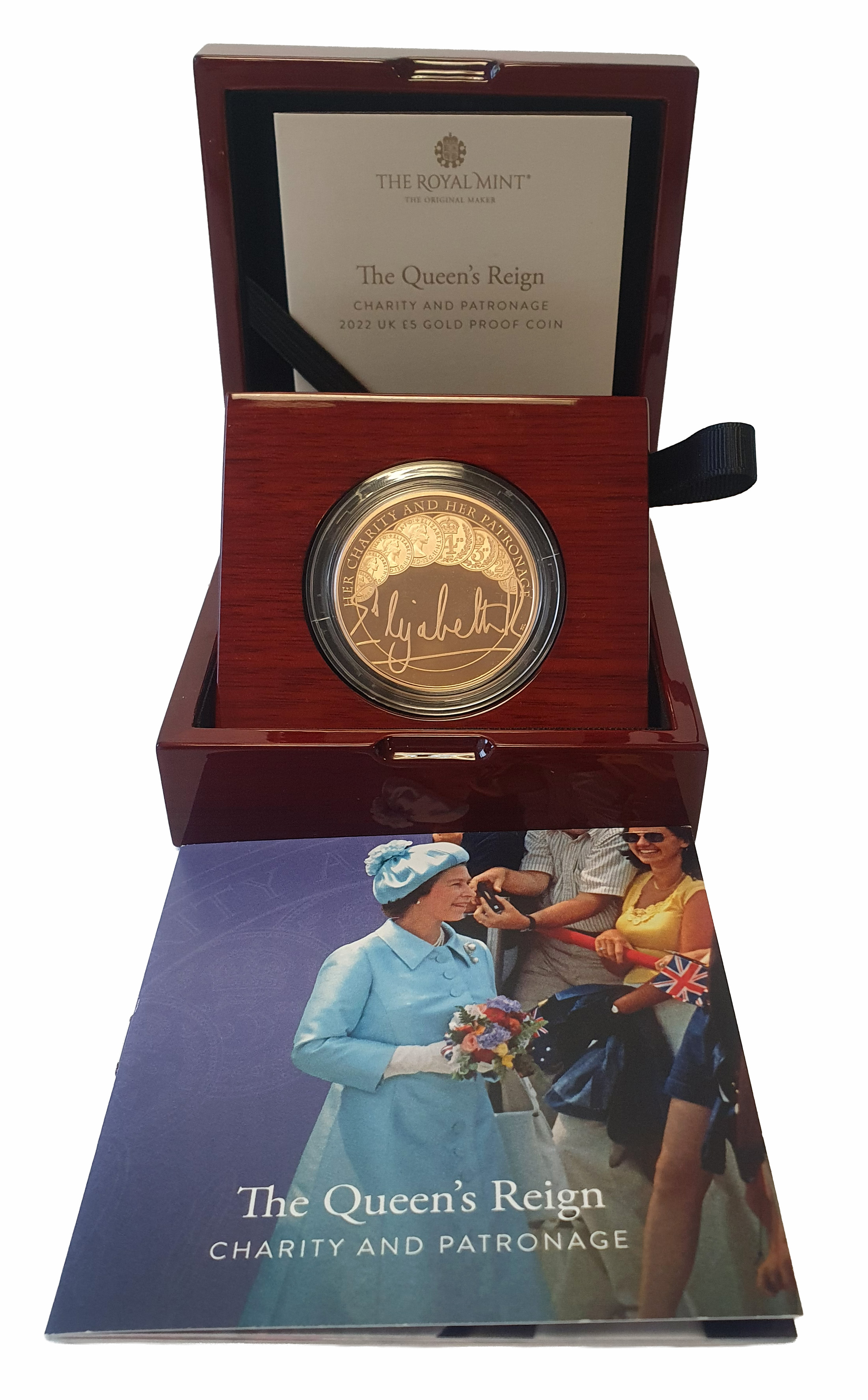 g Elizabeth II (1952-2022), gold proof Five Pounds, 2022, struck to celebrate the Queen’s Reign, Charity and Patronage, crowned head right, JC initials below for designer Jody Clark, Latin legend surrounding, ELIZABETH II. D. G. REG. F. D. 5 POUNDS 2022, rev. design by P. J. Lynch featuring Maundy Money, a symbol of service, The Queen’s signature below, HER CHARITY AND HER PATRONAGE surrounding, edge inscription ‘DEVOTED TO YOUR SERVICE’, 39.94g (S.L127). Light marks to reverse field, otherwise proof state, accompanied by Royal Mint box and Certificate of Authenticity.