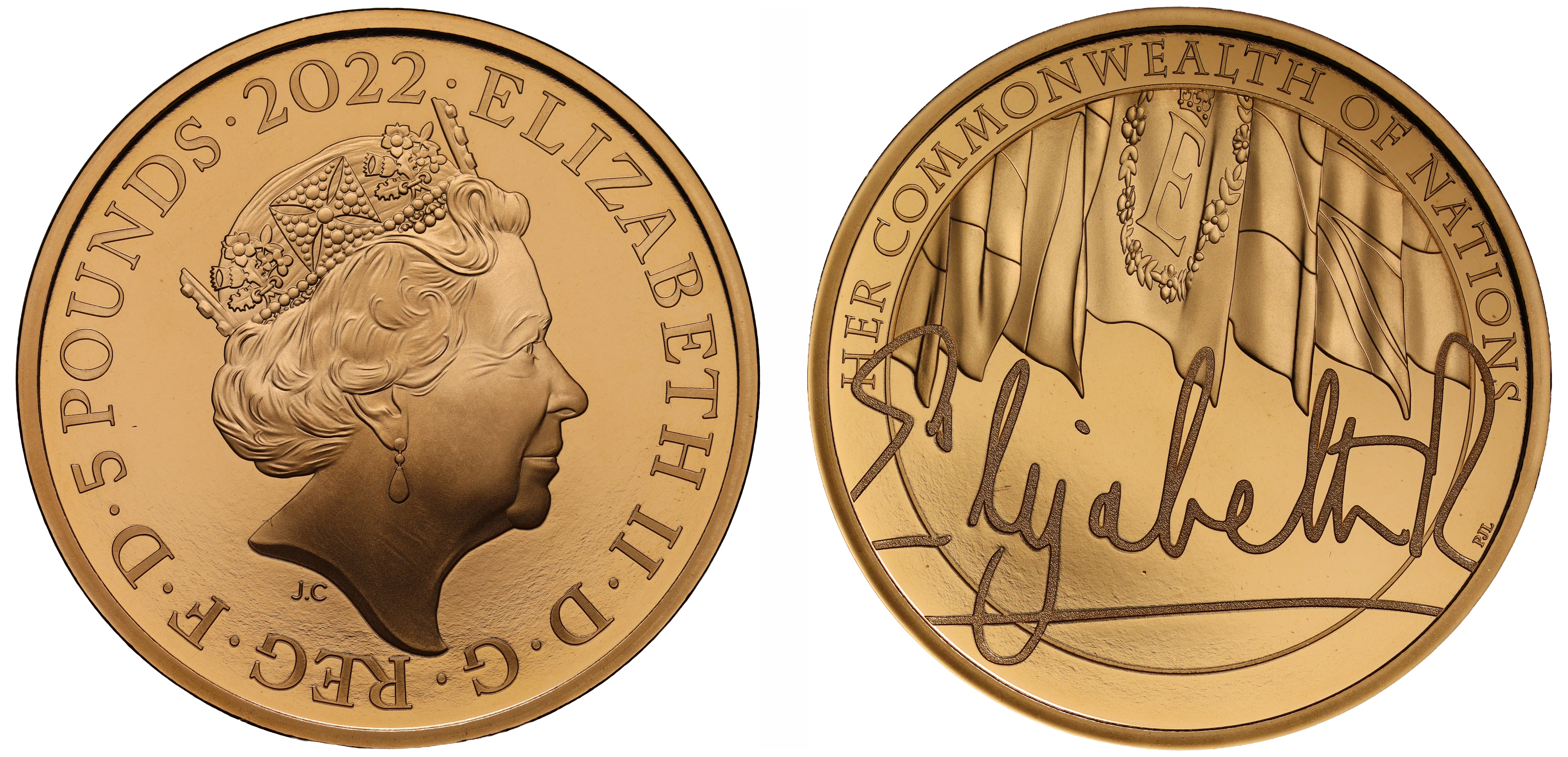 g Elizabeth II (1952-2022), gold proof Five Pounds, 2022, struck to celebrate the Queen’s reign, The Commonwealth, crowned head right, JC initials below for designer Jody Clark, Latin legend surrounding, ELIZABETH II. D. G. REG. F. D. 5 POUNDS 2022, rev. design by P. J. Lynch featuring a background of Commonwealth of flags, The Queen’s signature below, THE COMMONWEALTH OF NATIONS surrounding, edge inscription ‘DEVOTED TO YOUR SERVICE’, 39.94g (S. L128). Proof state, lightly toned accompanied by Royal Mint box and Certificate of Authenticity.