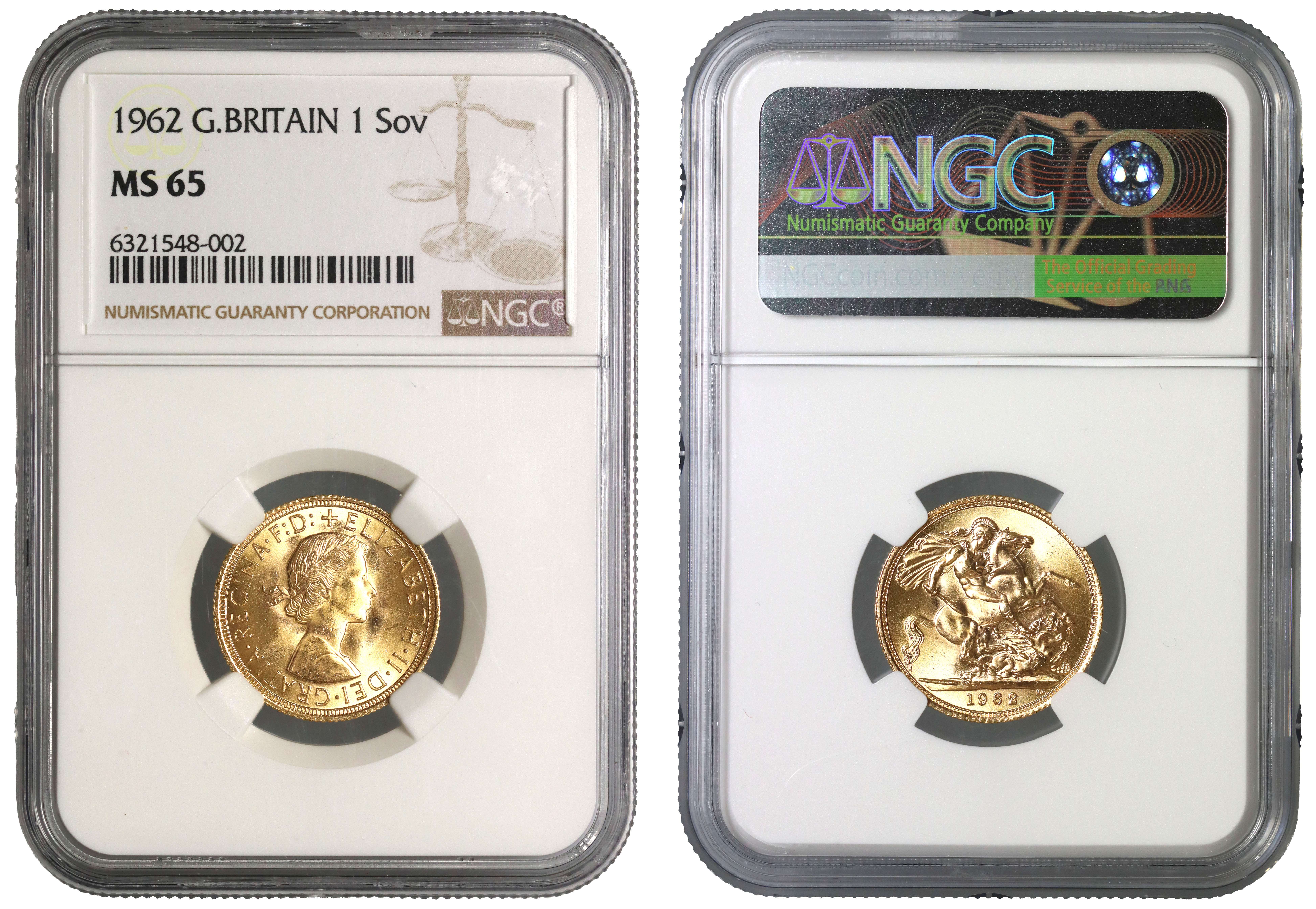 g Elizabeth II (1952-2022), gold Sovereign, 1962, young laureate head right, MG on truncation for designer Mary Gillick, Latin legend and toothed border surrounding, +ELIZABETH. II. DEI. GRATIA. REGINA. F: D:, rev. St. George and dragon right, date in exergue, B.P to upper right of exergue for engraver Benedetto Pistrucci (Bentley 372; Hill 300; Bull EGC 1478; S.4125). Slabbed and graded by NGC as MS65.