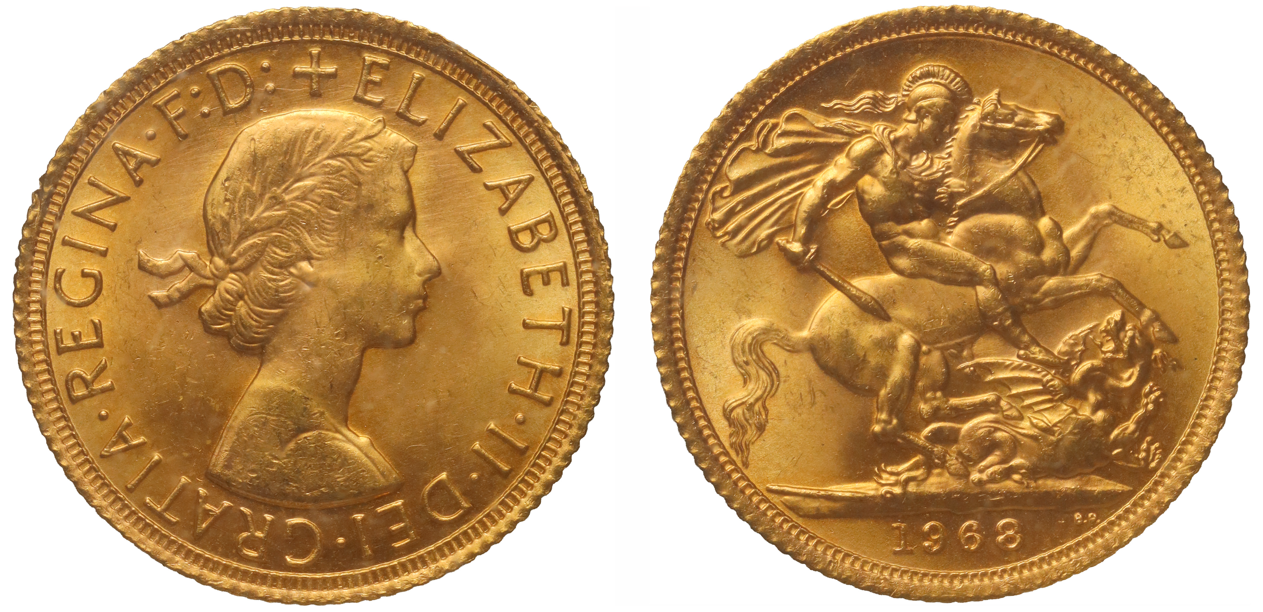 g Elizabeth II (1952-2022), gold Sovereign, 1968, young laureate head right, MG on truncation for designer Mary Gillick, Latin legend and toothed border surrounding, +ELIZABETH. II. DEI. GRATIA. REGINA. F: D:, rev. St. George and dragon right, date in exergue, B.P to upper right for engraver Benedetto Pistrucci, 7.98g (Bentley 379; Hill 306; Bull EGC 1487; S.4125). An excellent example, retaining full mint lustre, good extremely fine, housed in Royal Mint Collector Services capsule and card with certificate.
