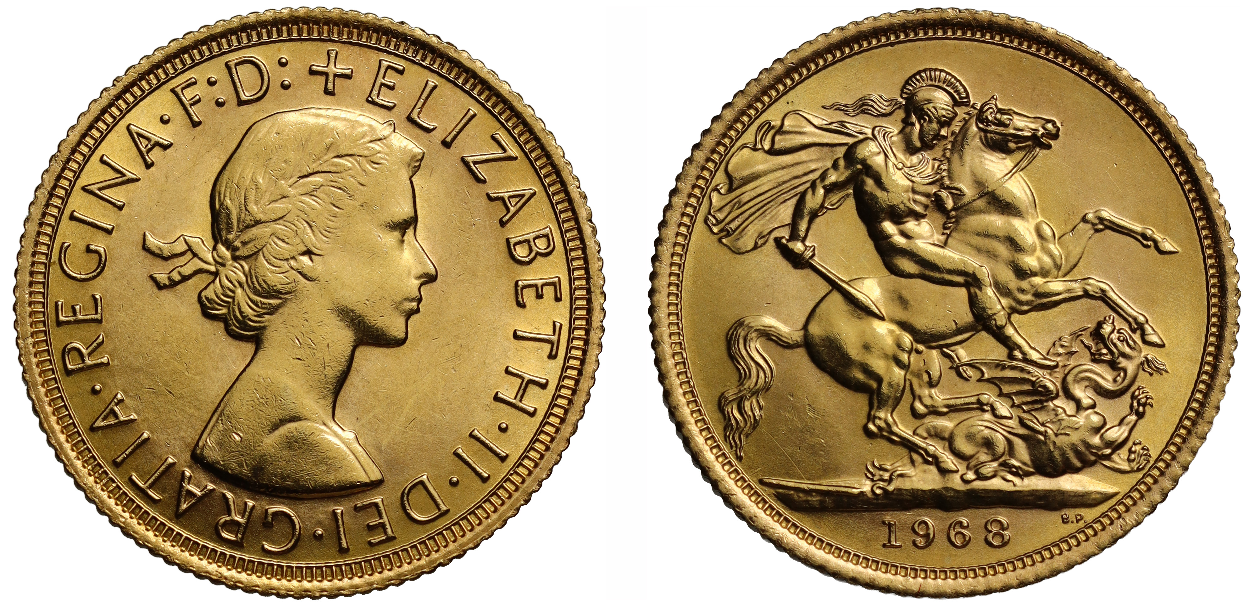 g Elizabeth II (1952-2022), gold Sovereign, 1968, young laureate head right, MG on truncation for designer Mary Gillick, Latin legend and toothed border surrounding, +ELIZABETH. II. DEI. GRATIA. REGINA. F: D:, rev. St. George and dragon right, date in exergue, B.P to upper right for engraver Benedetto Pistrucci, 7.98g (Bentley 379; Hill 306; Bull EGC 1487; S.4125). Light surface marks, extremely fine.