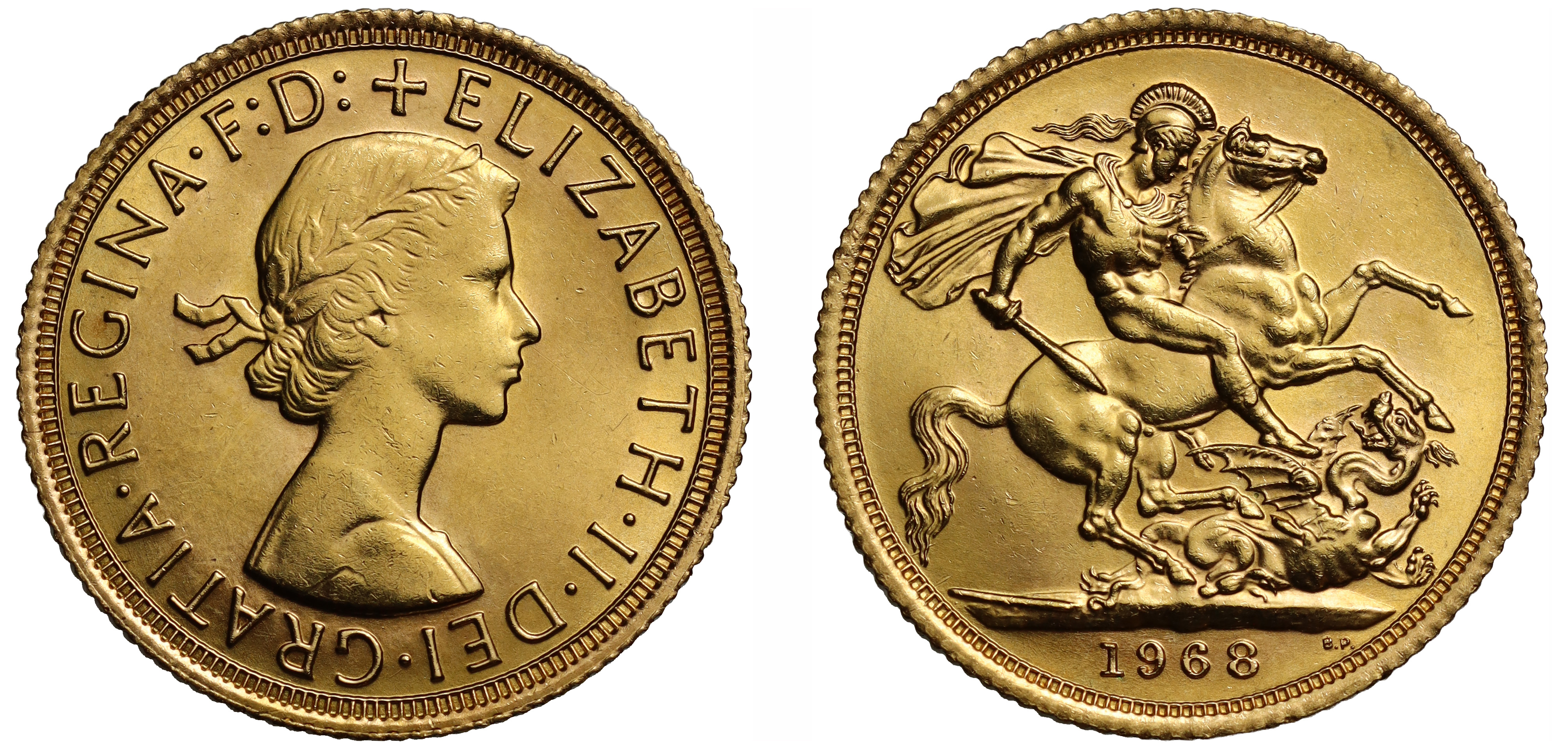g Elizabeth II (1952-2022), gold Sovereign, 1968, young laureate head right, MG on truncation for designer Mary Gillick, Latin legend and toothed border surrounding, +ELIZABETH. II. DEI. GRATIA. REGINA. F: D:, rev. St. George and dragon right, date in exergue, B.P to upper right for engraver Benedetto Pistrucci, 7.98g (Bentley 379; Hill 306; Bull EGC 1487; S.4125). Light surface marks, extremely fine.