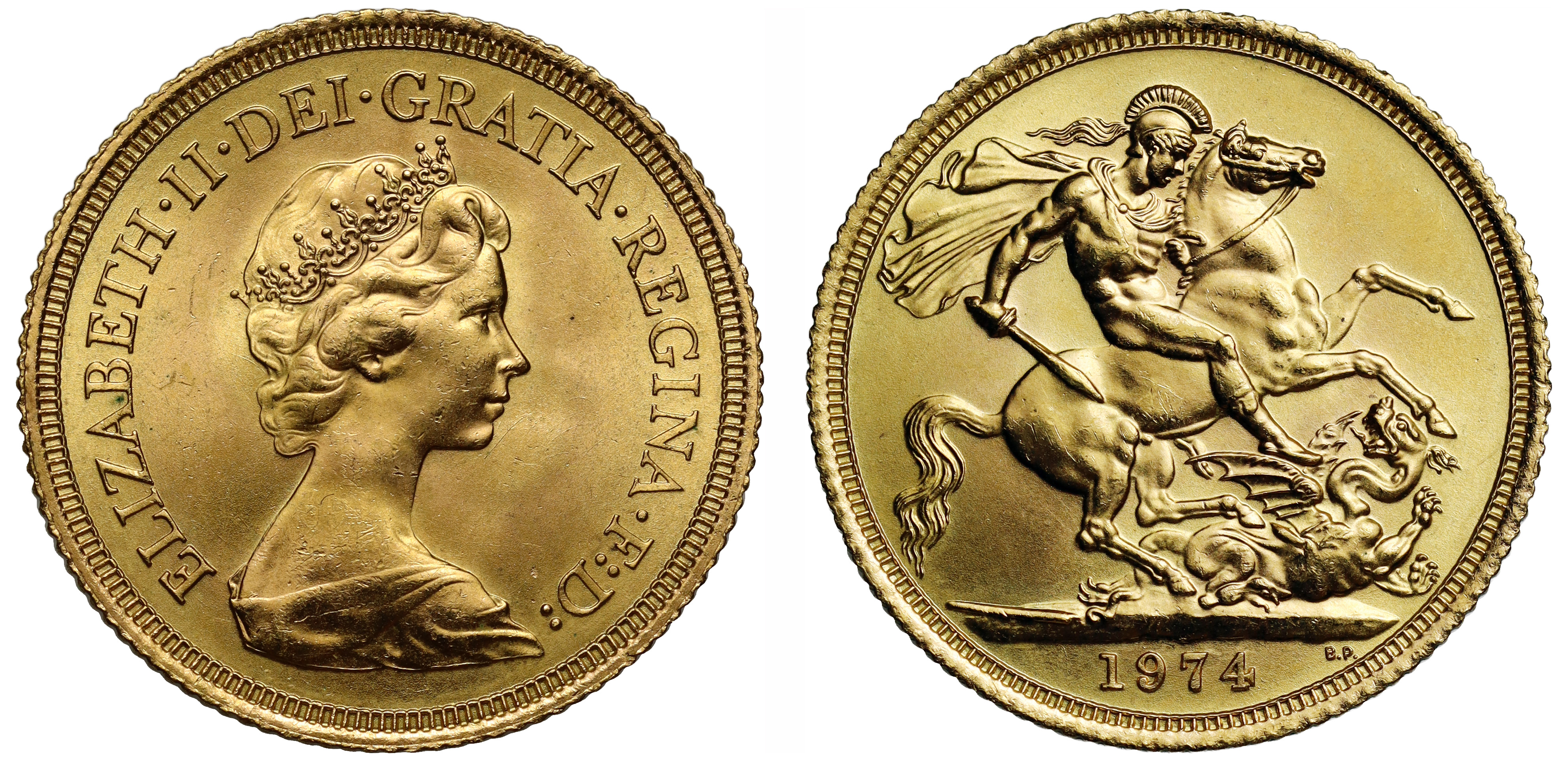 g Elizabeth II (1952-2022), gold Sovereign, 1974, crowned head right, design by Arnold Machin, Latin legend and toothed border surrounding, ELIZABETH. II. DEI. GRATIA. REGINA. F: D:, rev. St George and dragon right, date in exergue, B.P. to upper right of exergue for designer Benedetto Pistrucci, 7.99g (Hill 307; S.SC1). Toned, good extremely fine.