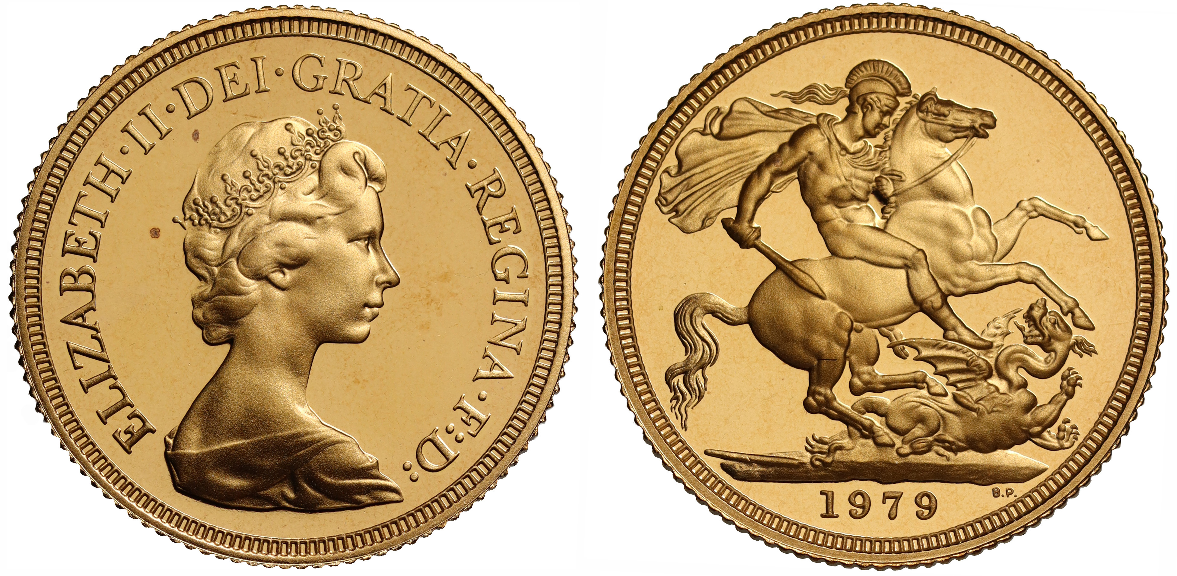 g Elizabeth II (1952-2022), gold proof Sovereign, 1979, crowned head right, design by Arnold Machin, Latin legend and toothed border surrounding, ELIZABETH. II. DEI. GRATIA. REGINA. F: D, rev. St. George and dragon right, date in exergue, B.P. to upper right of exergue for designer Benedetto Pistrucci, 7.98g (Marsh 310; S.SC1). Toning spots, accompanied by Royal Mint box.