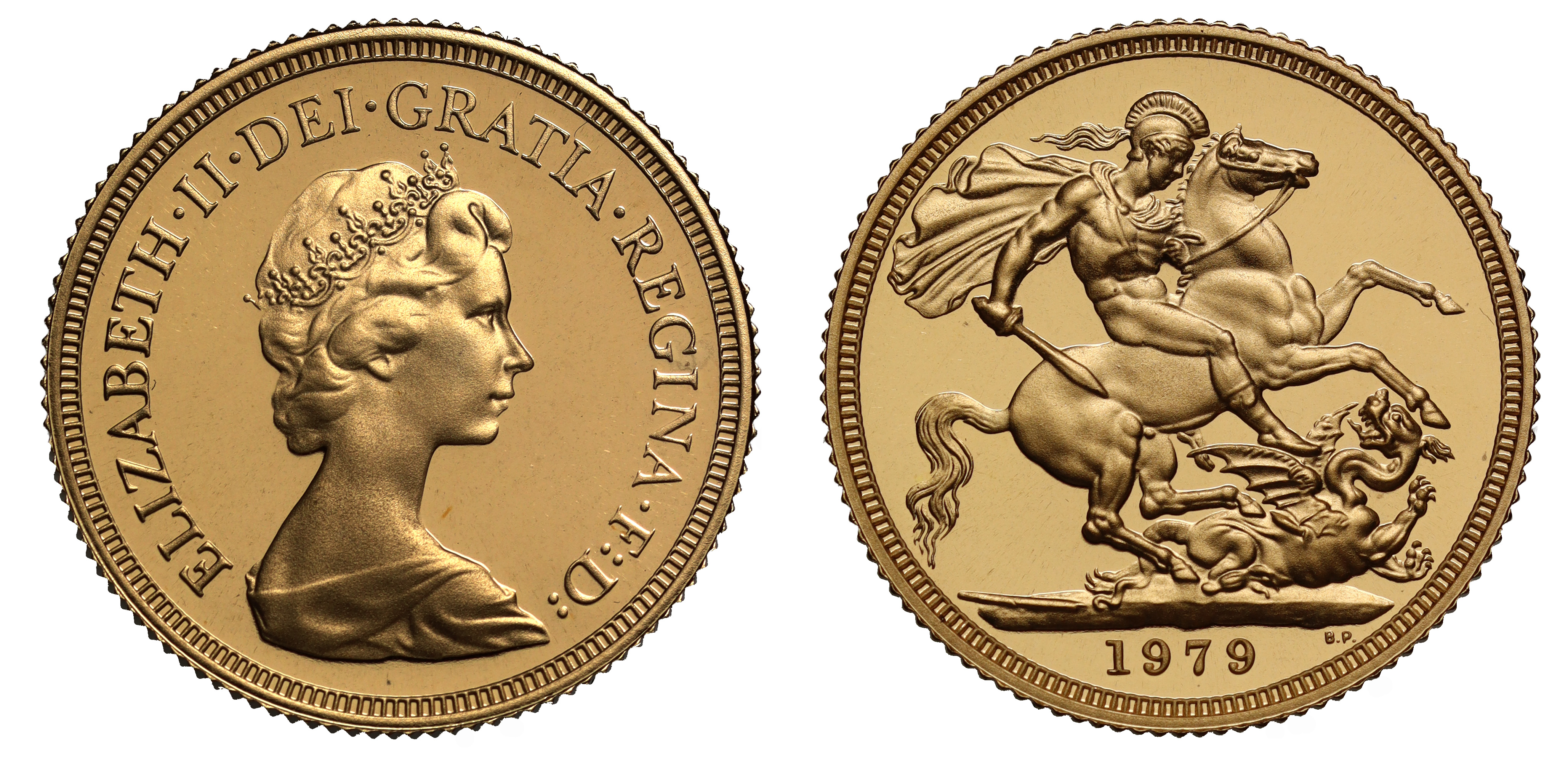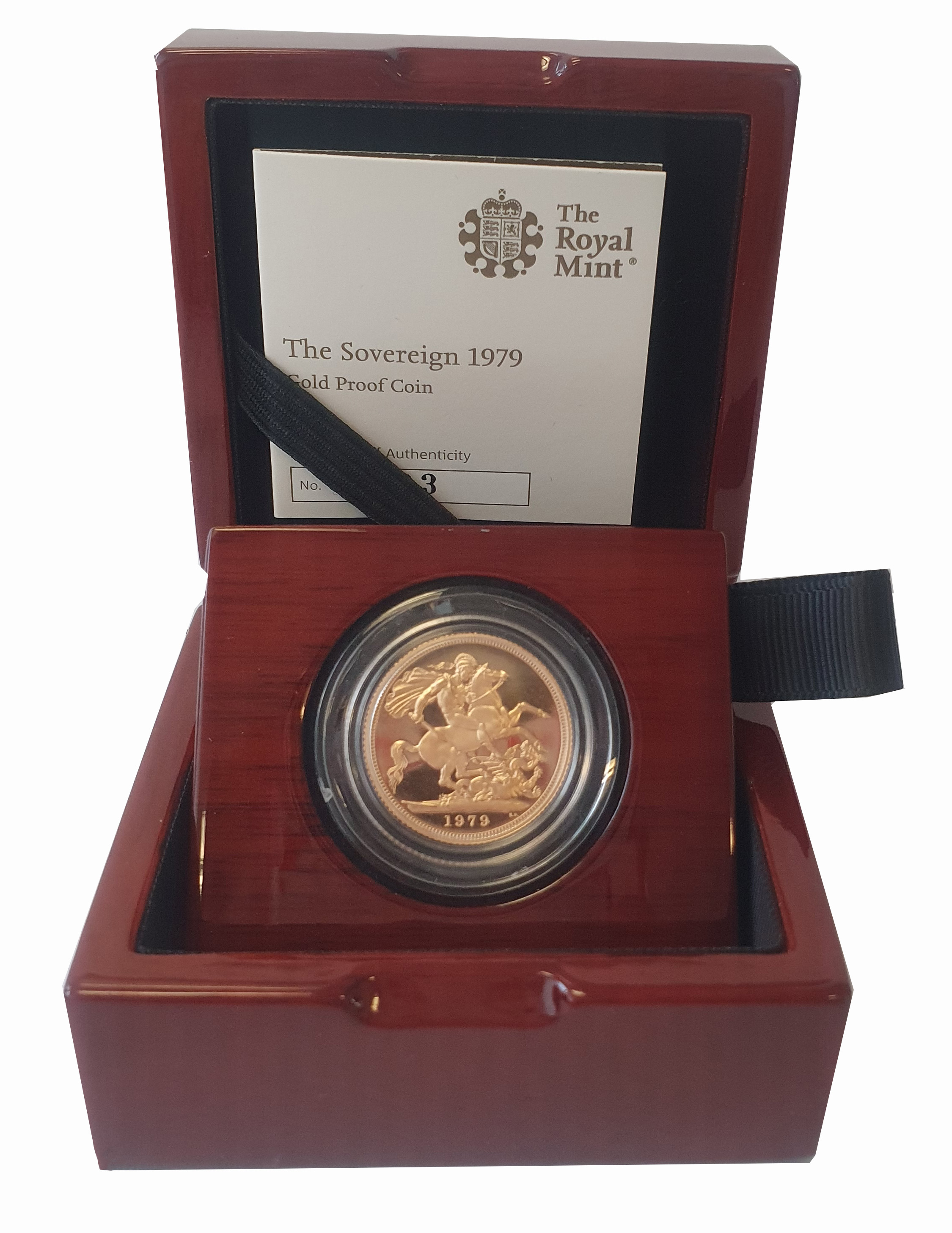 g Elizabeth II (1952-2022), gold proof Sovereign, 1979, crowned head right, design by Arnold Machin, Latin legend and toothed border surrounding, ELIZABETH. II. DEI. GRATIA. REGINA. F: D, rev. St. George and dragon right, date in exergue, B.P. to upper right of exergue for designer Benedetto Pistrucci, 7.98g (Marsh 310; S.SC1). Proof state, minor haze to fields, accompanied by Royal Mint wooden box and Certificate of Authenticity.