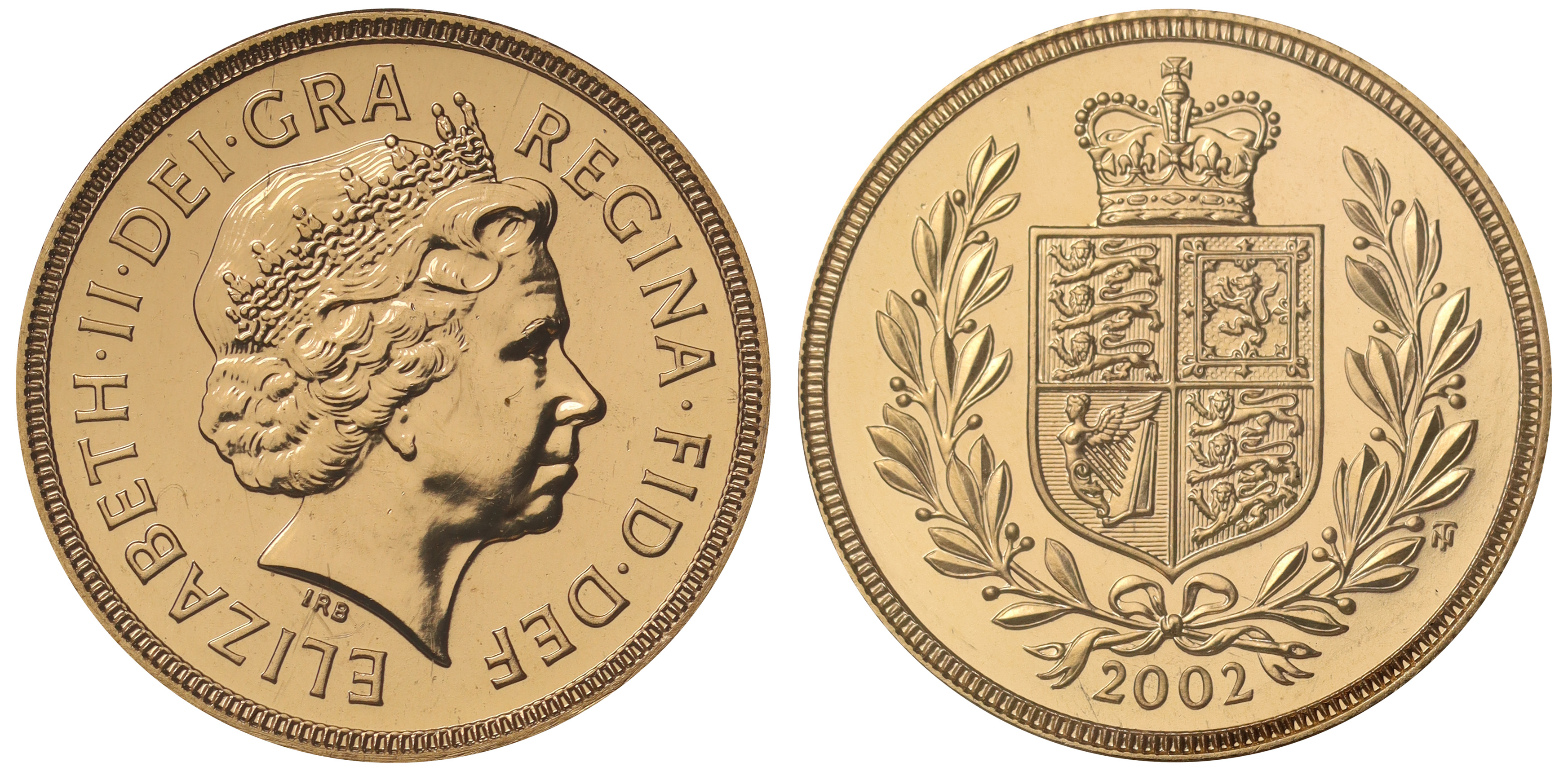 g Elizabeth II (1952-2022), gold Sovereign, 2002, special design for the Queen’s Golden Jubilee, crowned head right, IRB initials below for designer Ian Rank-Broadley, Latin legend and toothed border surrounding, ELIZABETH. II. DEI. GRA REGINA. FID. DEF, rev. Shield of Arms within open laurel wreath, date below, designer Timothy Noad’s monogram to the right, 7.98g (S.SC5). Uncirculated, in original Royal Mint sealed plastic packaging.