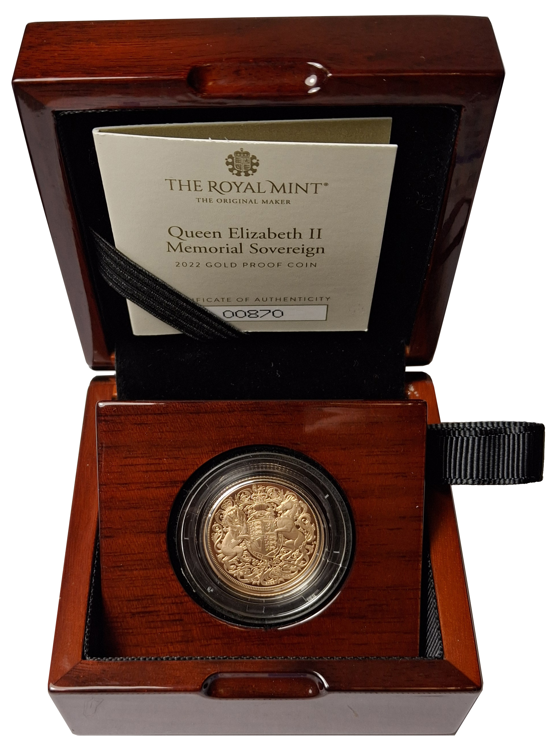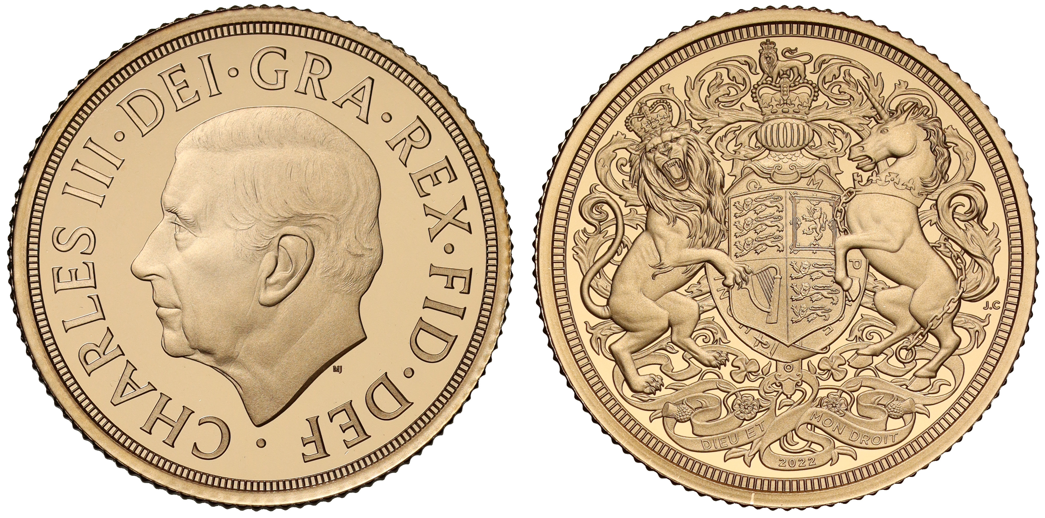 g Charles III (2022-), gold proof Sovereign, 2022, Memorial Issue honouring the life and legacy of Queen Elizabeth II, bare head left, MJ initials below for designer Martin Jennings, legend and toothed border surrounding, CHARLES III. DEI. GRA. REX. FID. DEF., rev. a special interpretation of the Royal Arms by Jody Clark, the designer of Her Majesty’s final definitive portrait, date below, designers’ monogram J.C. to the right, 7.98g (S.SC13). Proof state with minor residue to obverse, accompanied by Royal Mint box and Certificate of Authenticity.