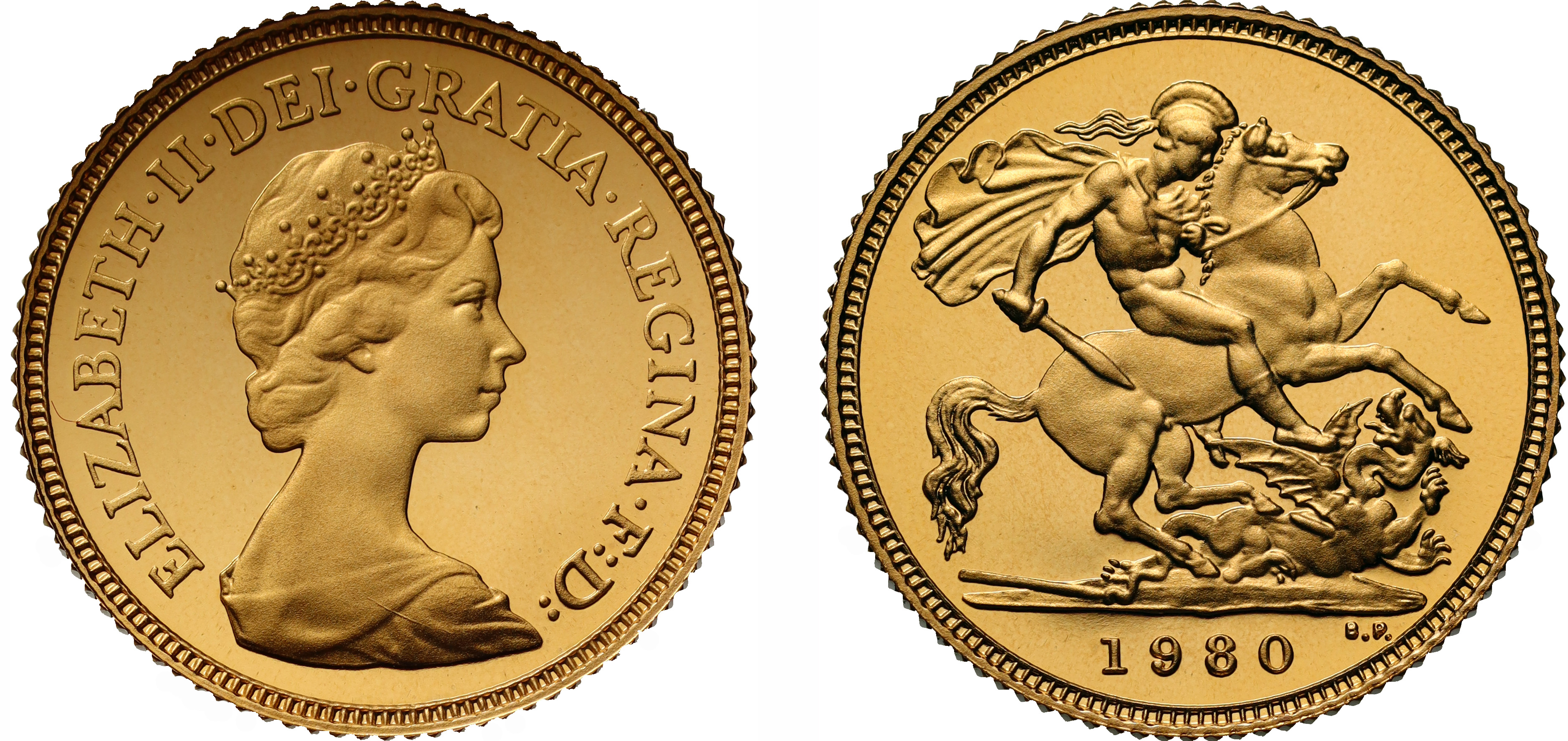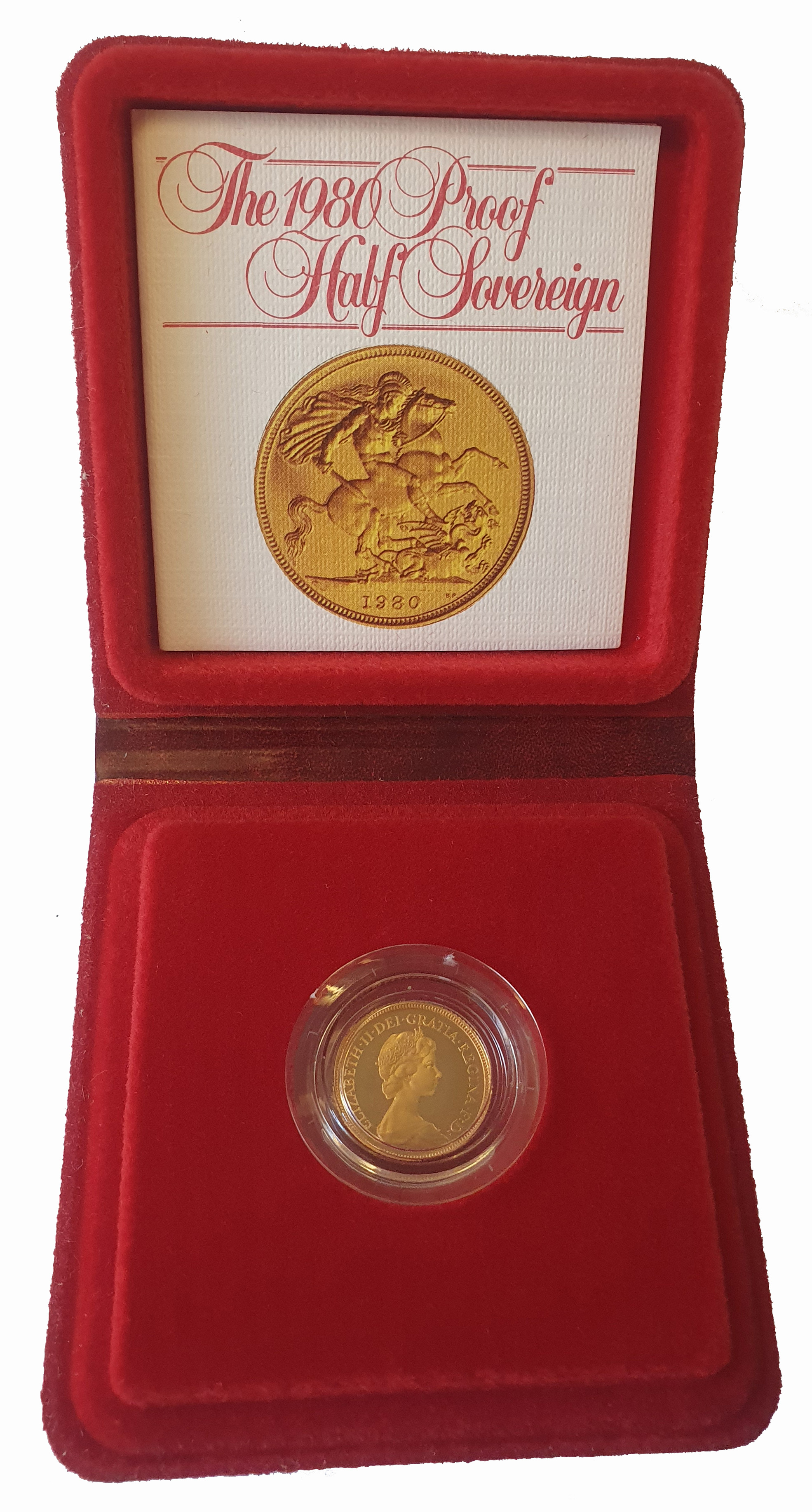 g Elizabeth II (1952-2022), gold proof Half-Sovereign, 1980, crowned head right, design by Arnold Machin, Latin legend and toothed border surrounding, ELIZABETH. II. DEI. GRATIA. REGINA. F: D, rev. St. George and dragon right, date in exergue, B.P. to upper right of exergue for designer Benedetto Pistrucci, 3.99g (S.SB1). Light handling marks, accompanied by Royal Mint box and Certificate of Authenticity.