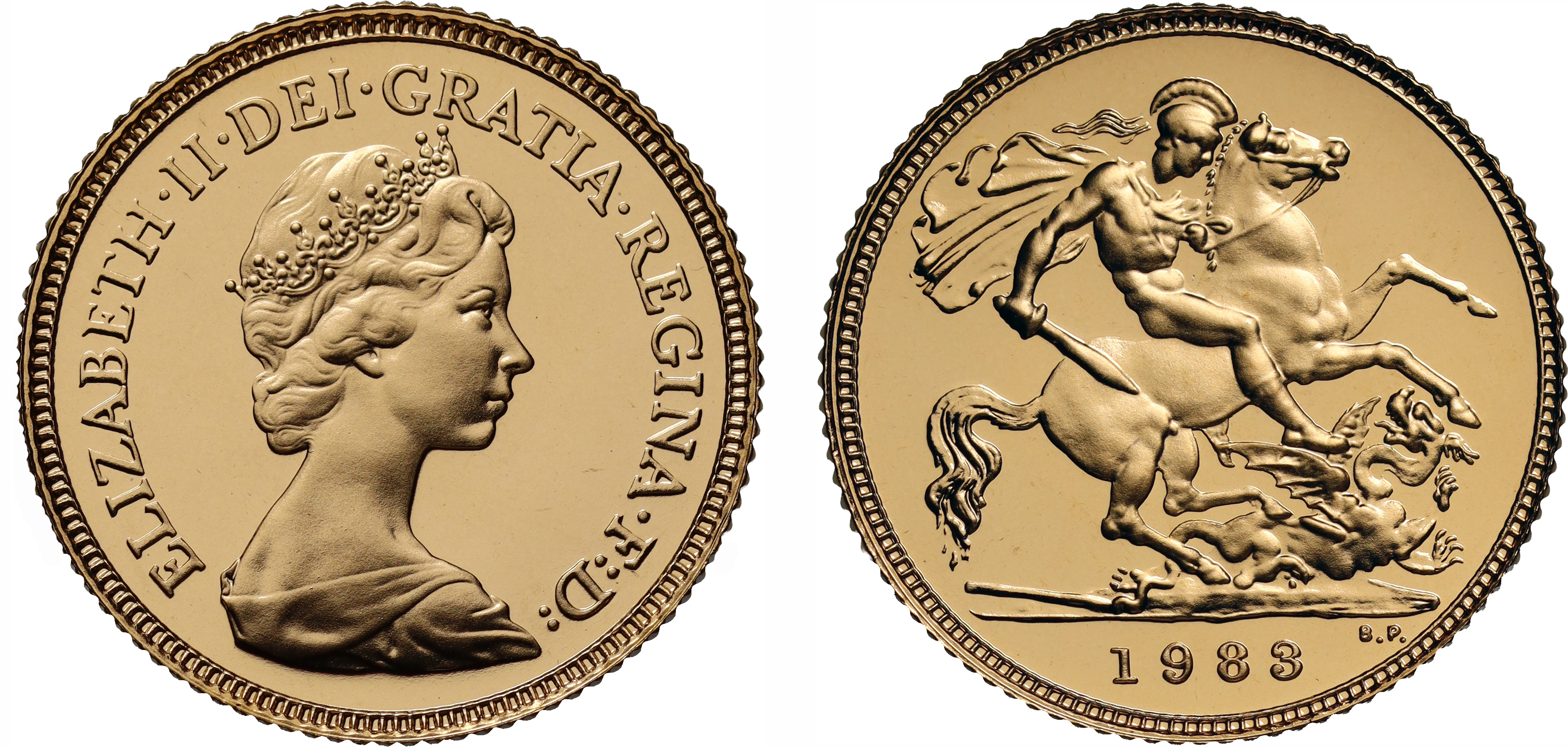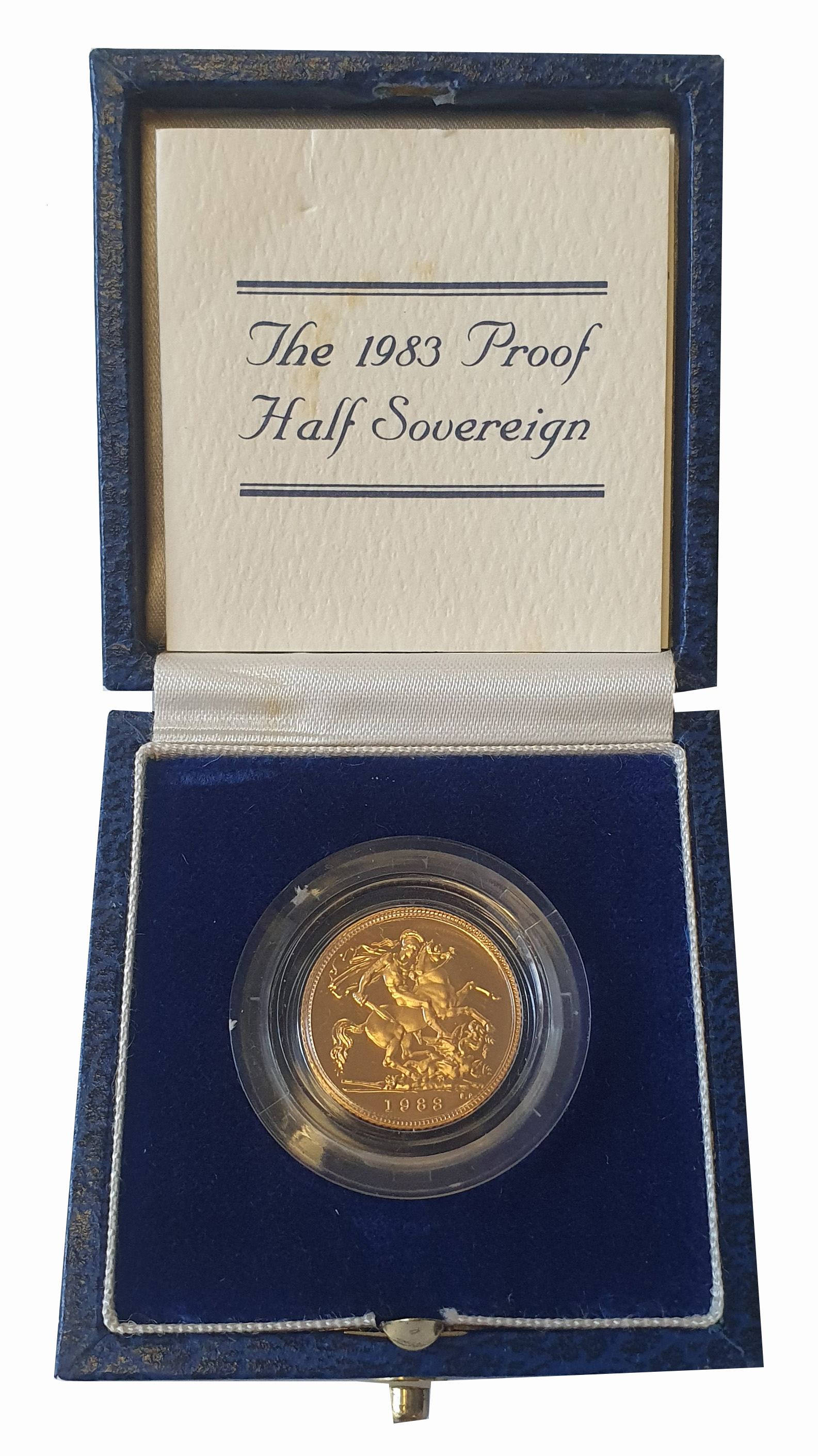 g Elizabeth II (1952-2022), gold proof Half-Sovereign, 1983, crowned head right, design by Arnold Machin, Latin legend and toothed border surrounding, ELIZABETH. II. DEI. GRATIA. REGINA. F: D, rev. St. George and dragon right, date in exergue, B.P. to upper right of exergue for designer Benedetto Pistrucci, 3.99g (S.SB1). Faint surface marks, accompanied by original Royal Mint box and Certificate of Authenticity.