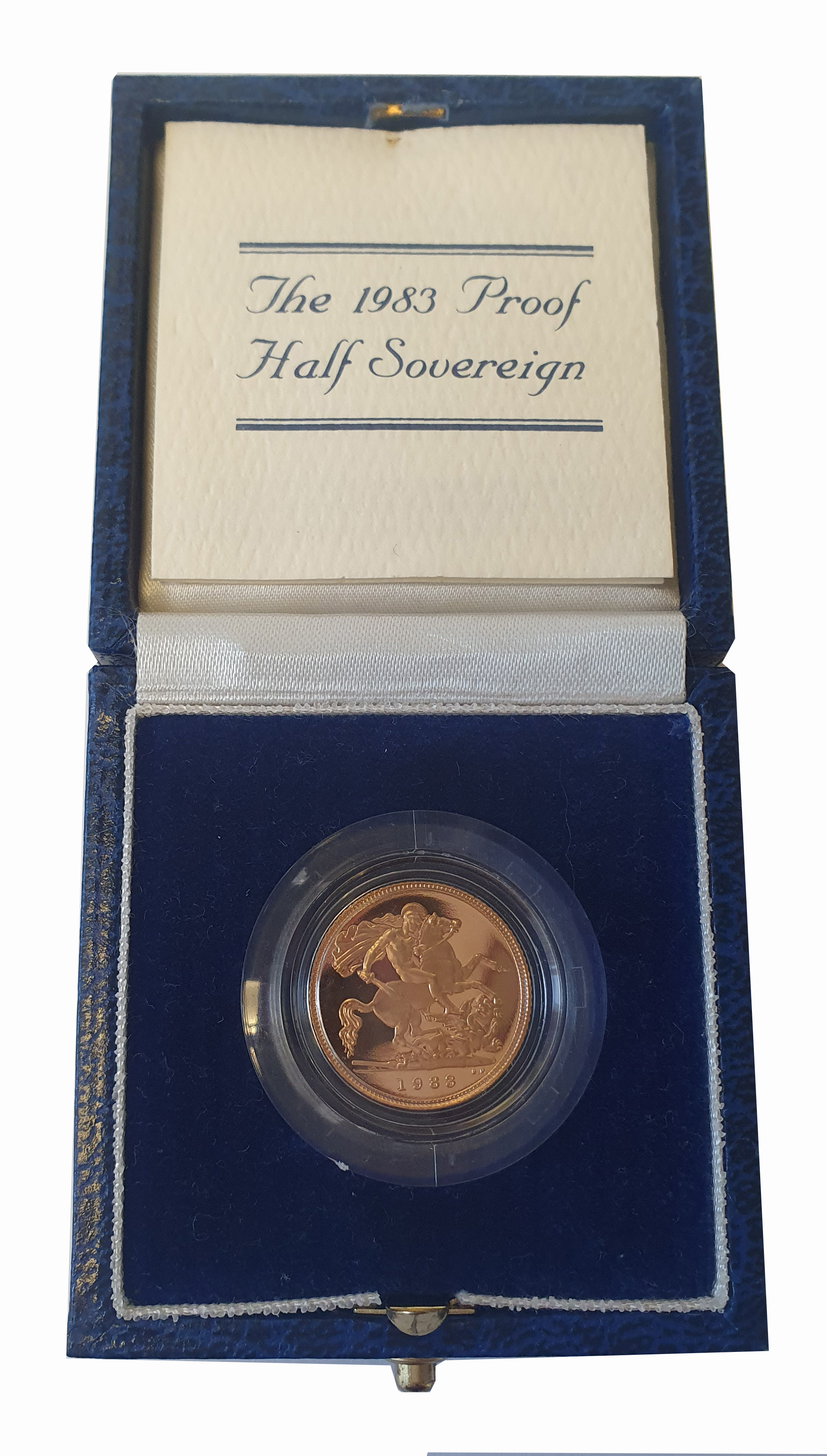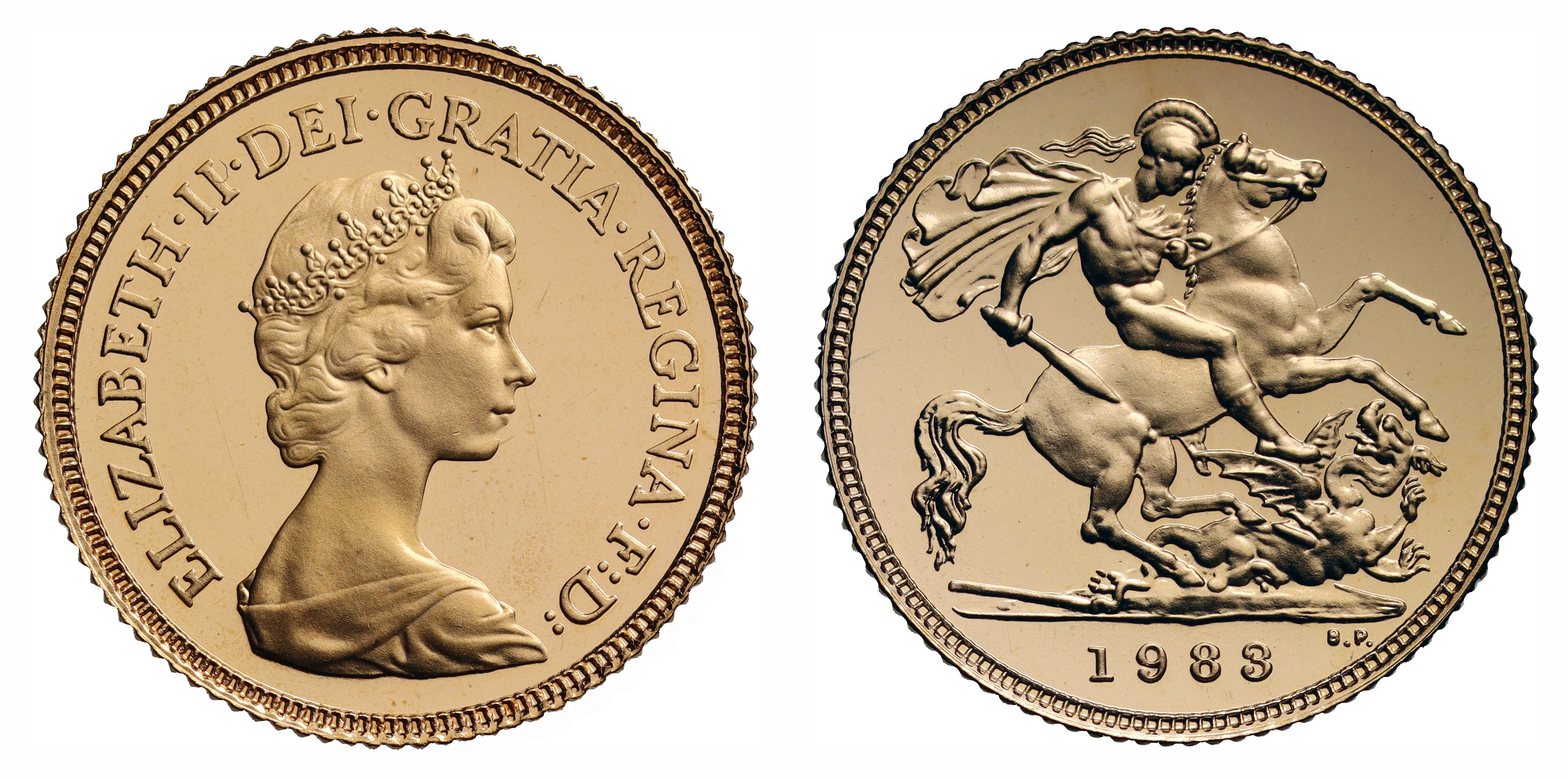 g Elizabeth II (1952-2022), gold proof Half-Sovereign, 1983, crowned head right, design by Arnold Machin, Latin legend and toothed border surrounding, ELIZABETH. II. DEI. GRATIA. REGINA. F: D:, rev. St. George and dragon right, date in exergue, B.P. to upper right of exergue for designer Benedetto Pistrucci, 3.99g (S.SB1). Marks to fields and toning spots, accompanied by Royal Mint box and Certificate of Authenticity.