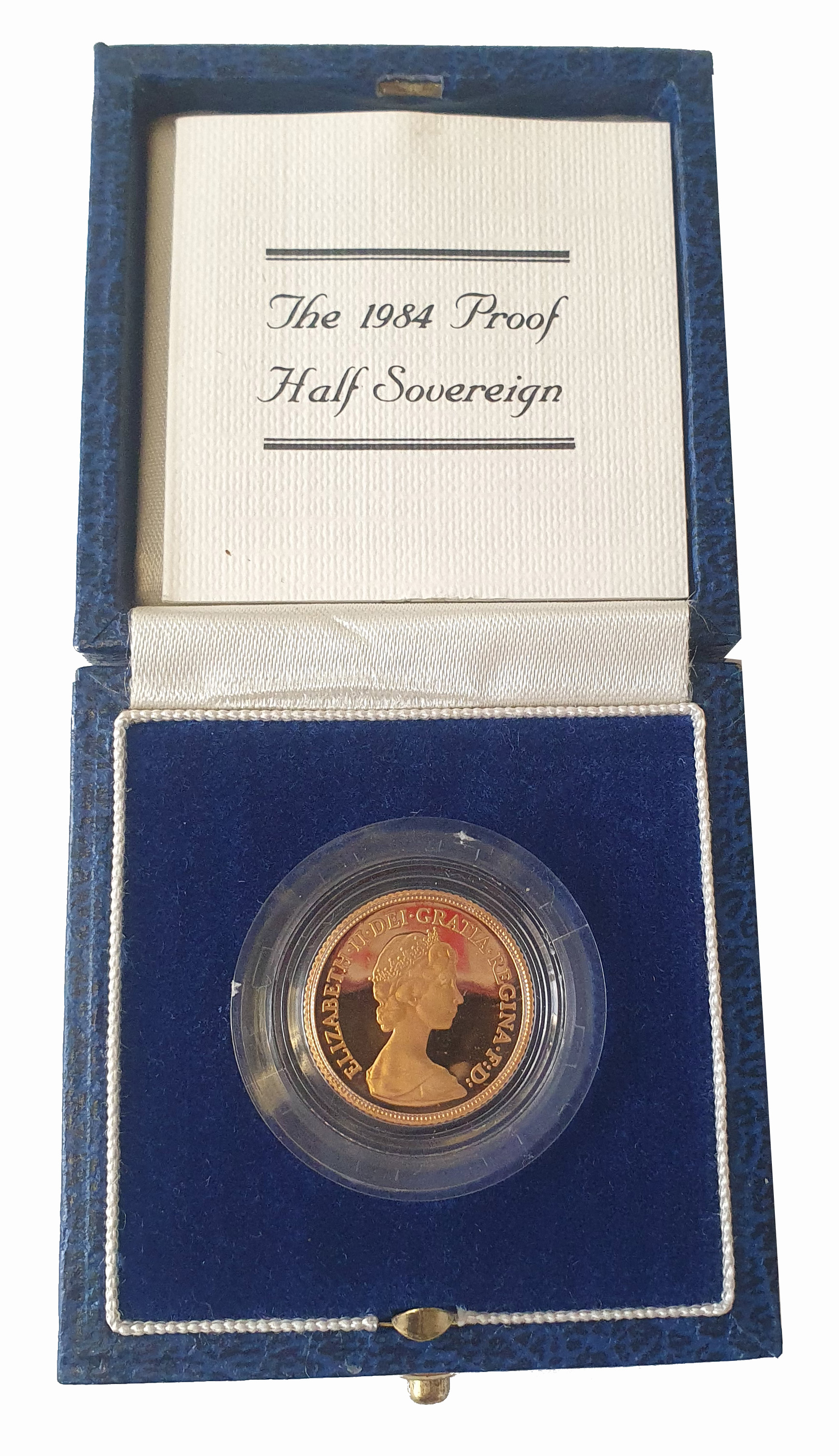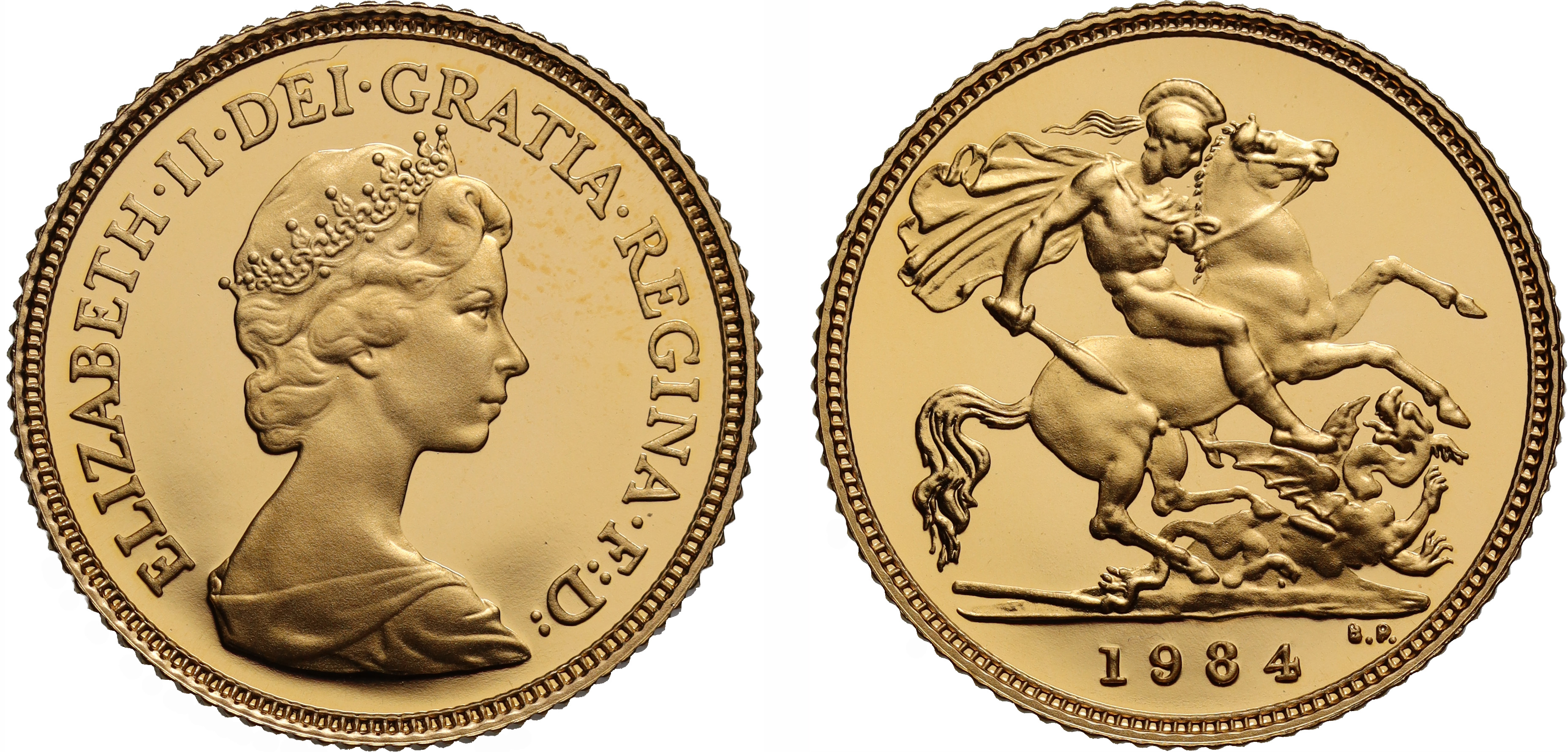 g Elizabeth II (1952-2022), gold proof Half-Sovereign, 1984, crowned head right, design by Arnold Machin, Latin legend and toothed border surrounding, ELIZABETH. II. DEI. GRATIA. REGINA. F: D, rev. St. George and dragon right, date in exergue, B.P. to upper right of exergue for designer Benedetto Pistrucci, 3.99g (S.SB1). Light surface marks and toning, accompanied by original Royal Mint box and Certificate of Authenticity.