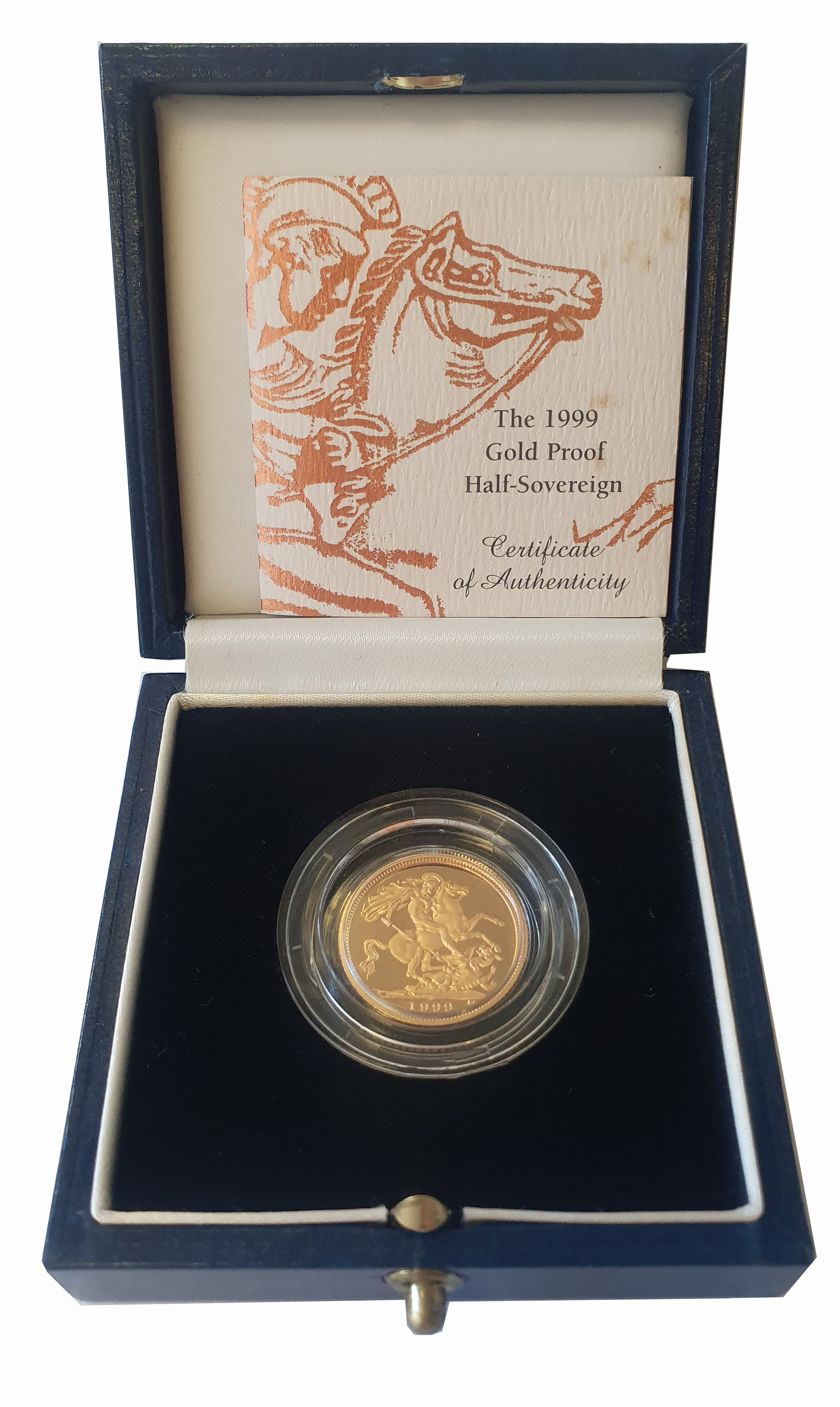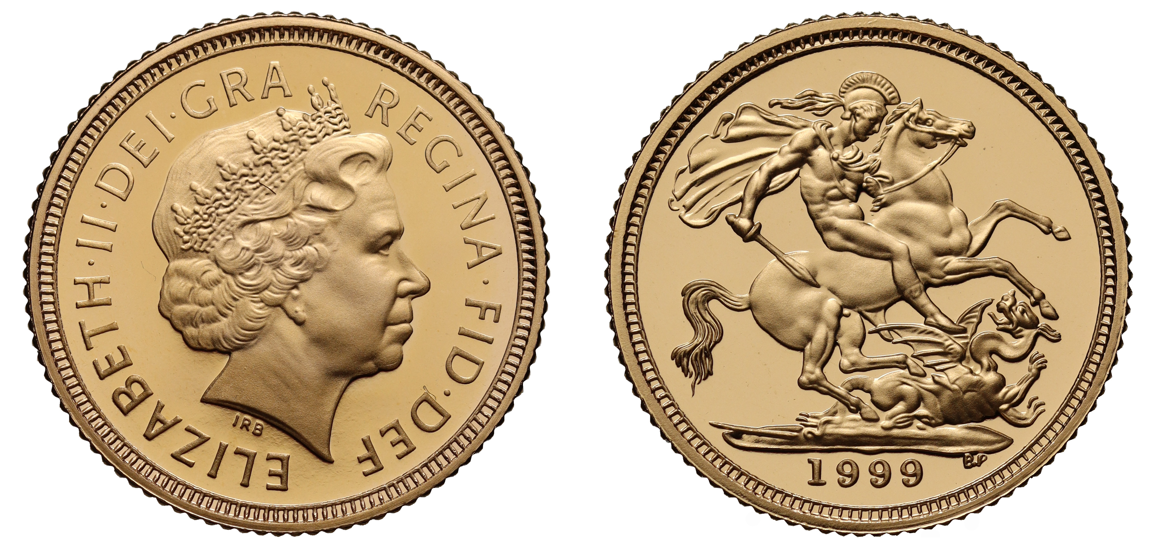g Elizabeth II (1952-2022), gold proof Half-Sovereign, 1999, crowned head right, IRB below for designer Ian Rank-Broadley, Latin legend and toothed border surrounding, ELIZABETH II DEI. GRA. REGINA. FID. DEF, rev. St. George and dragon right, date in exergue, B.P. to upper right of exergue for designer Benedetto Pistrucci, 3.99g (S.SB4). Proof state, accompanied by Royal Mint box and Certificate of Authenticity.