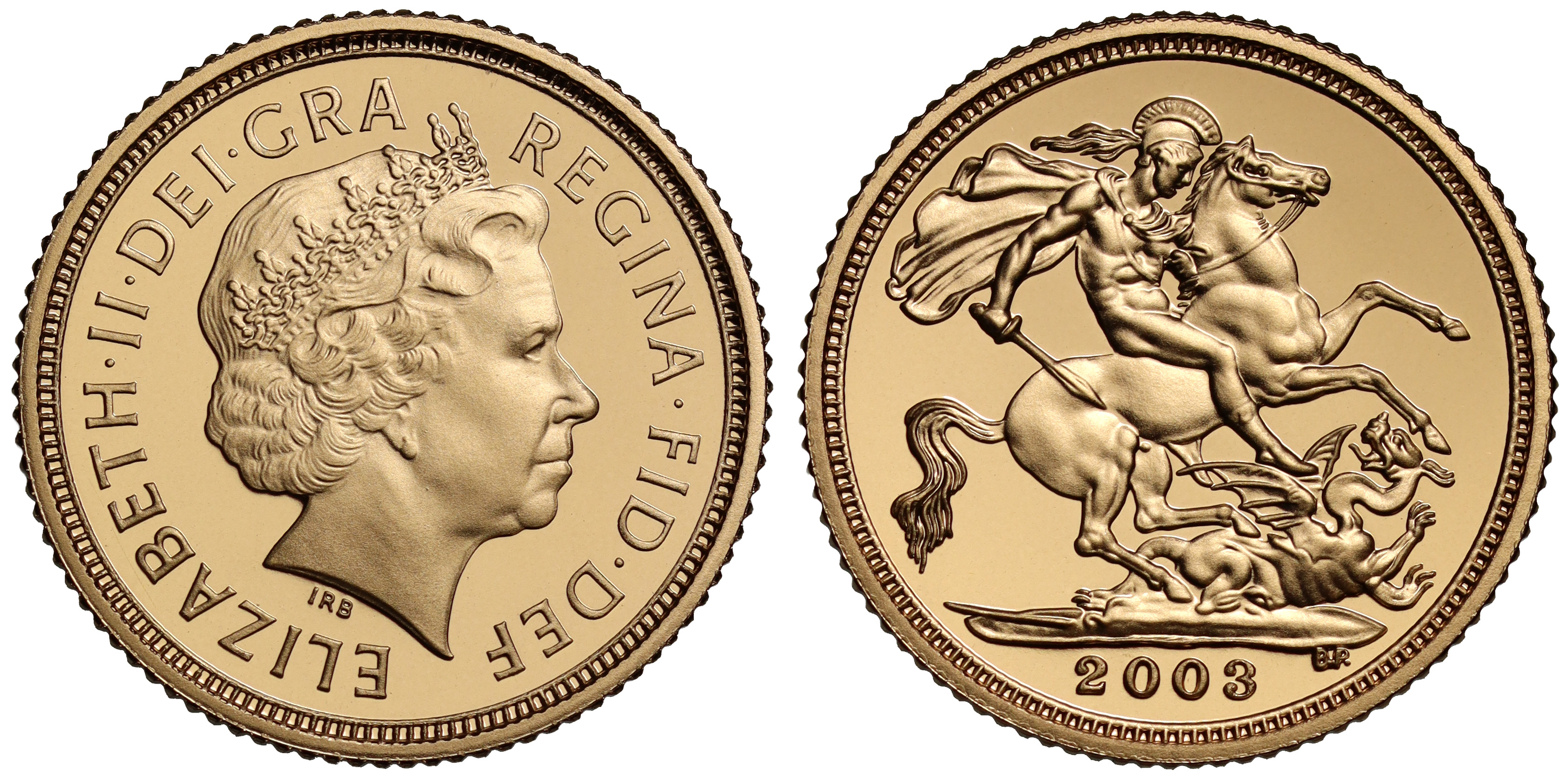 g Elizabeth II (1952-2022), gold proof Half-Sovereign, 2003, crowned head right, IRB initials below for designer Ian Rank-Broadley, Latin legend and toothed border surrounding, ELIZABETH. II. DEI. GRA. REGINA. FID: DEF, rev. St. George and dragon right, date in exergue B.P. to upper right of exergue for designer Benedetto Pistrucci, 3.99g (S.SB4). Proof state, accompanied by original Royal Mint box and Certificate of Authenticity.