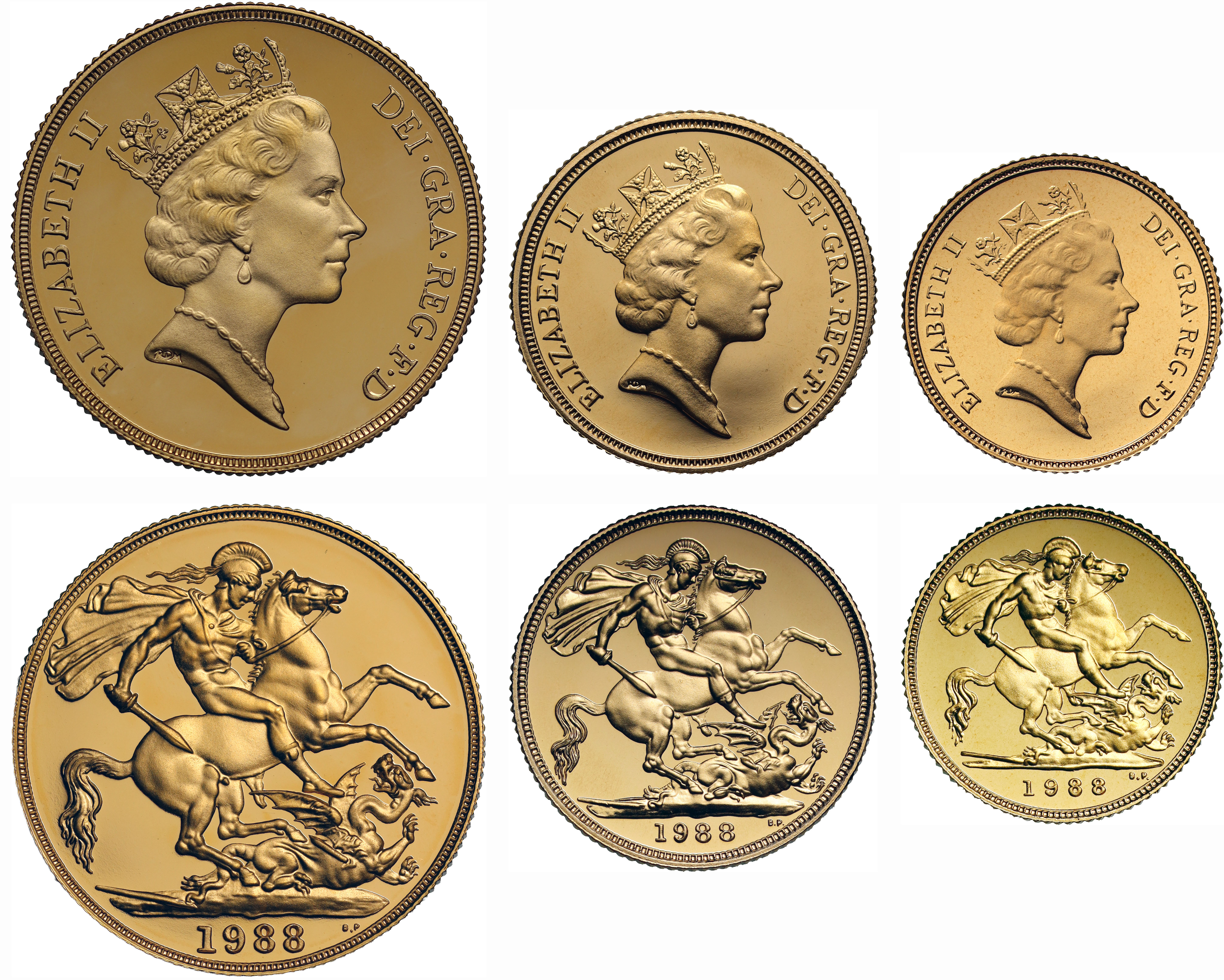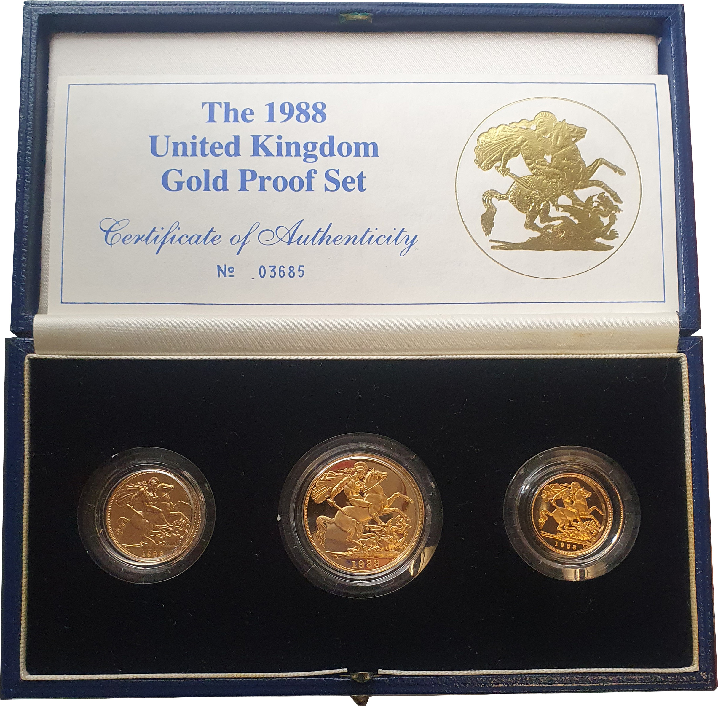 g Elizabeth II (1952-2022), gold proof 3-coin Sovereign Set, 1988, comprising Two Pounds, Sovereign, Half-Sovereign, crowned head right, RDM incuse on truncation for designer Raphael Maklouf, Latin legend and toothed border surrounding, ELIZABETH II DEI. GRA. REG. F.D, rev. St. George and dragon right, date in exergue, B.P. to upper right of exergue for designer Benedetto Pistrucci, 27.96g (PGS09-1988). Light signs of handling, accompanied by Royal Mint box and Certificate of Authenticity.