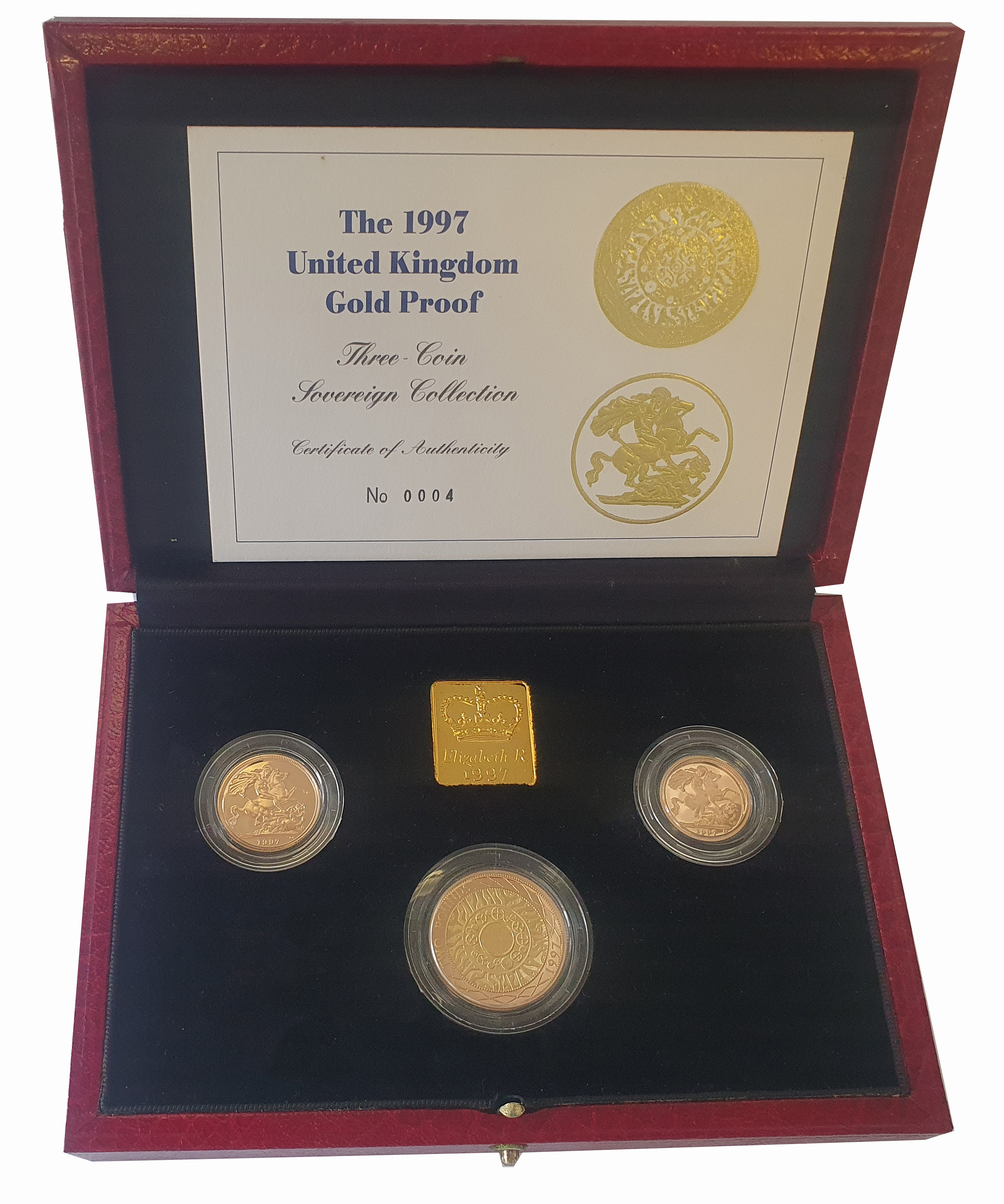 g Elizabeth II (1952-2022), gold proof 3-coin Set, 1997, Two Pounds, Sovereign, Half-Sovereign, crowned bust right, RDM incuse on truncation for designer Raphael Maklouf, Latin legend and toothed border surrounding, Two Pounds rev. design by Bruce Rushin of concentric circles, representing the Iron Age, 18th Century industrial development, and the Internet and Information Superhighway, edge inscribed STANDING ON THE SHOULDERS OF GIANTS, Sovereign and Half-Sovereign rev. St. George and dragon right, date in exergue, B.P. to upper right of exergue for designer Benedetto Pistrucci, 27.94g (S.PGS27). Lightly toned with minor signs of handling, accompanied by Royal Mint box and Certificate of Authenticity.