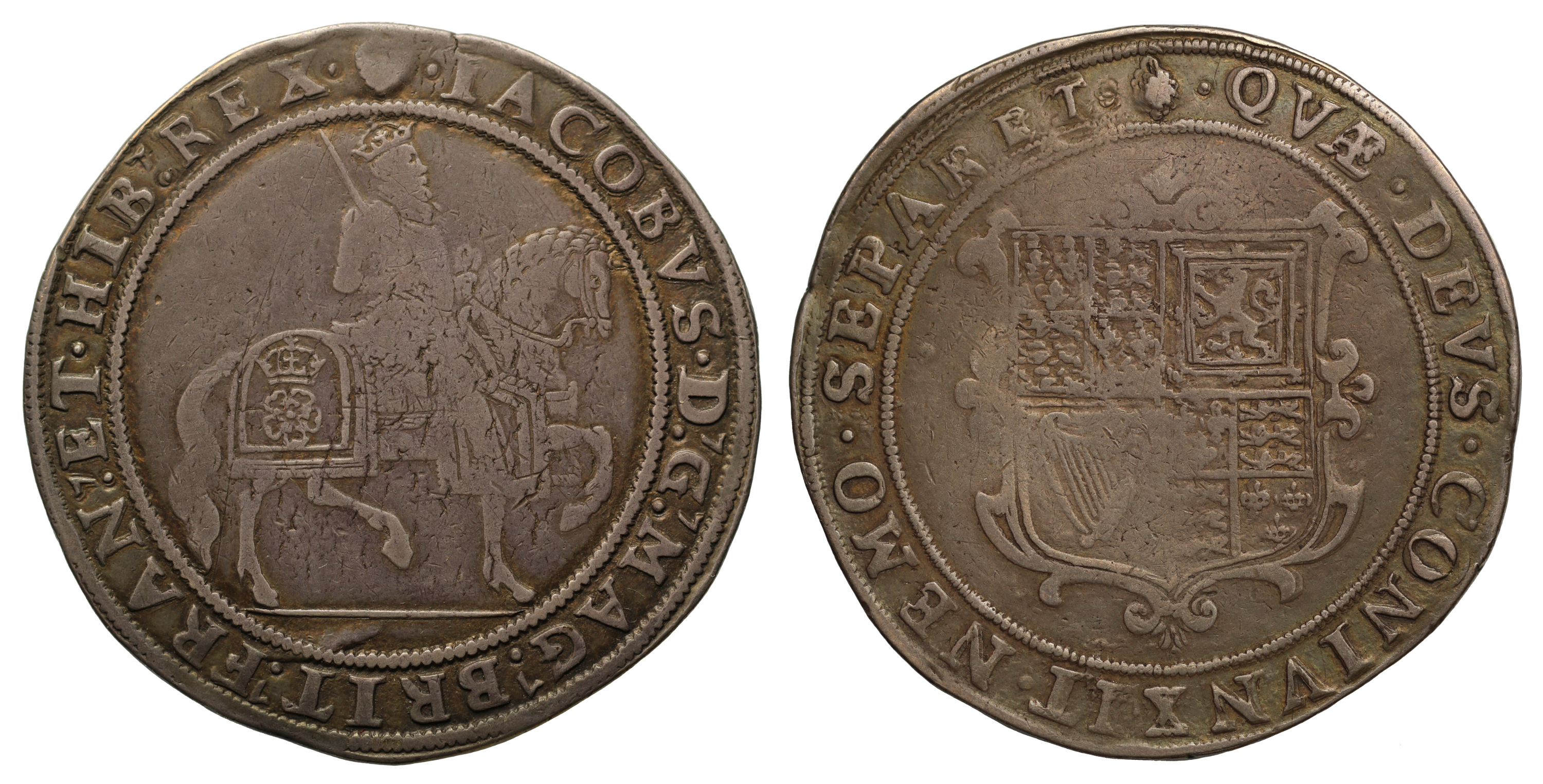 James I (1603-25), silver Crown, second coinage (1604-19), armoured King on horseback right, sword on shoulder, plain groundline below, Latin legend and beaded borders surrounding both sides, initial mark grapes over escallop (1607) both sides, .IACOBVS. D; G; MAG; BRIT; FRAN; ET. HIB; REX. rev. quartered shield of arms, .QVÆ. DEVS. CONIVNXIT. NEMO. SEPARET. 29.79g (Cooper dies V*/IX*; N.2097; S.2652). A number of small flan striations on obverse, die flaw below groundline, toned, double struck on reverse, a bold fine and a very rare die combination and mint mark.