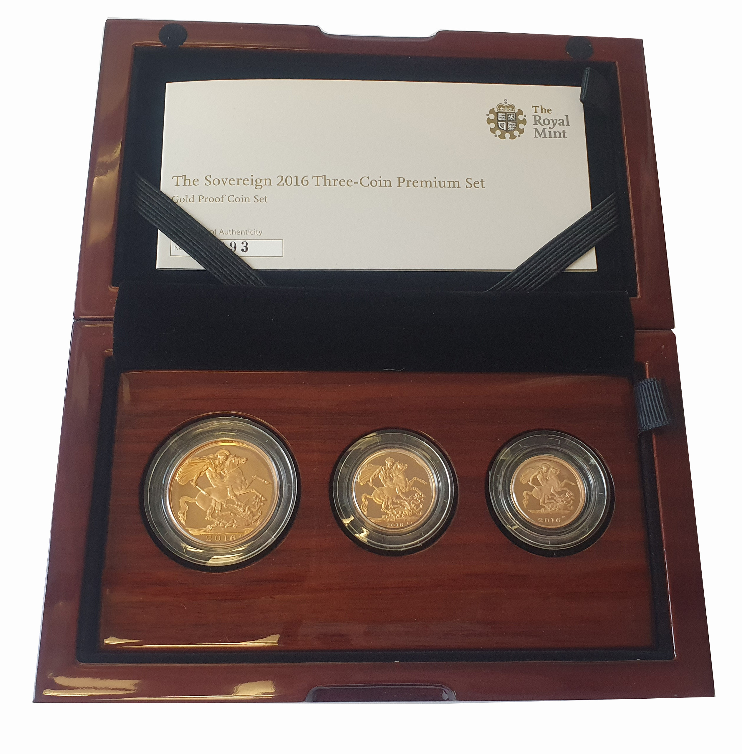 g Elizabeth II (1952-2022), gold proof 3-coin Set, 2016, comprising Two-Pounds, Sovereign, Half-Sovereign, crowned head right off centre on the obverse, special one year portrait to celebrate the 90th birthday of Her Majesty the Queen, JB initials to the left for designer James Butler, Latin legend and toothed border surrounding, ELIZABETH. II. DEI. GRA REGINA. FID. DEF, rev. St George and dragon right, 2016 in exergue, B.P. to upper right of exergue for designer Benedetto Pistrucci, 27.93g (S. PGS79). Strong residue, accompanied by Royal Mint box and Certificate of Authenticity.