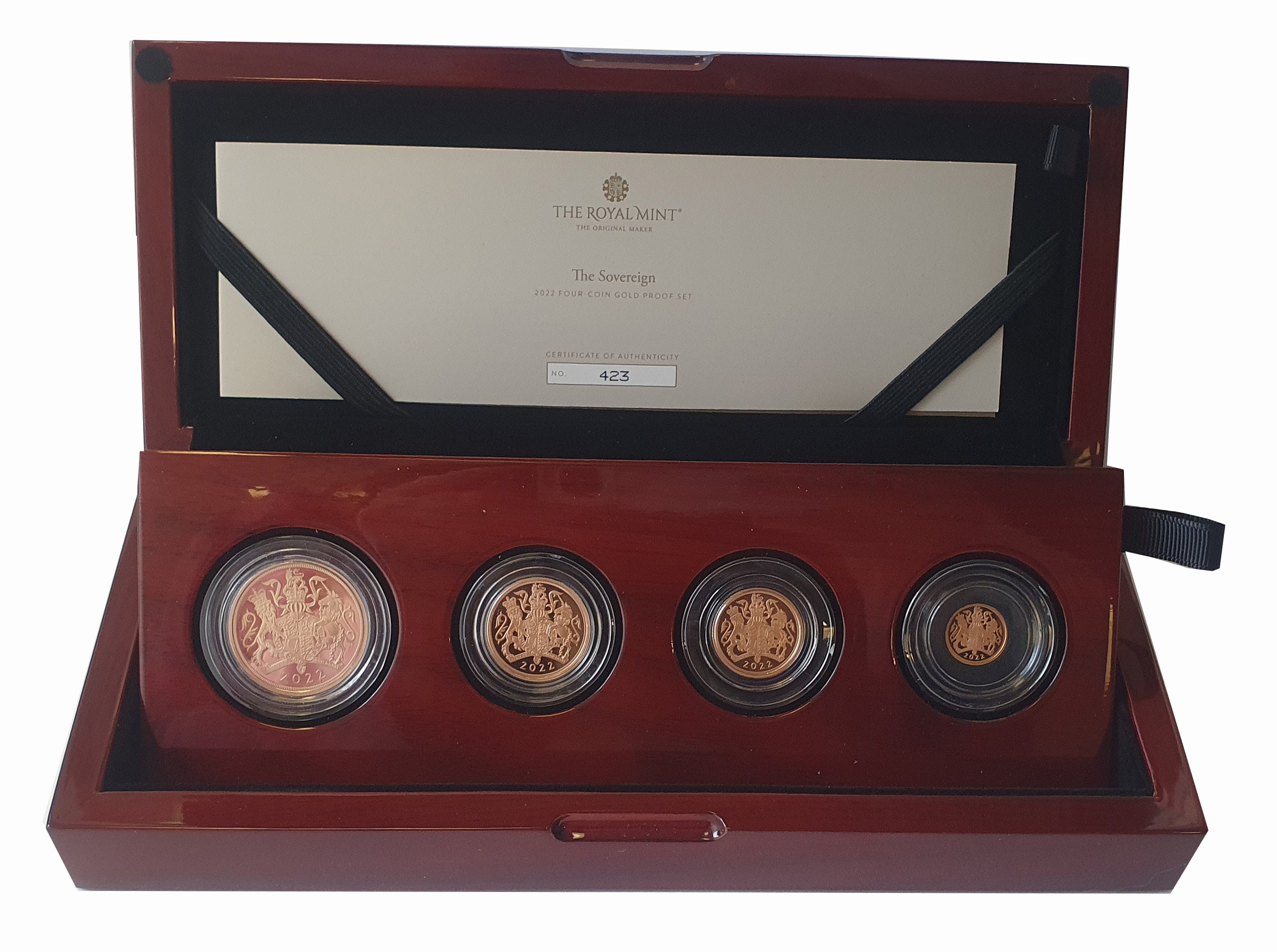 g Elizabeth II (1952-2022), gold proof 4-coin Set, 2022 comprising Two Pounds, Sovereign, Half-Sovereign and Quarter-Sovereign, crowned head right, JC initials below for designer Jody Clark, Latin legend and toothed border surrounding, ELIZABETH II. DEI. GRA. REGINA. FID. DEF., rev. by Timothy Noad, a special one-year design of the Royal Coat of Arms to commemorate the Platinum Jubilee of Her Majesty the Queen with date ‘2022’ in exergue, 29.96g (S. PGS99-2022). Proof state, accompanied by Royal Mint wooden box and Certificate of Authenticity.