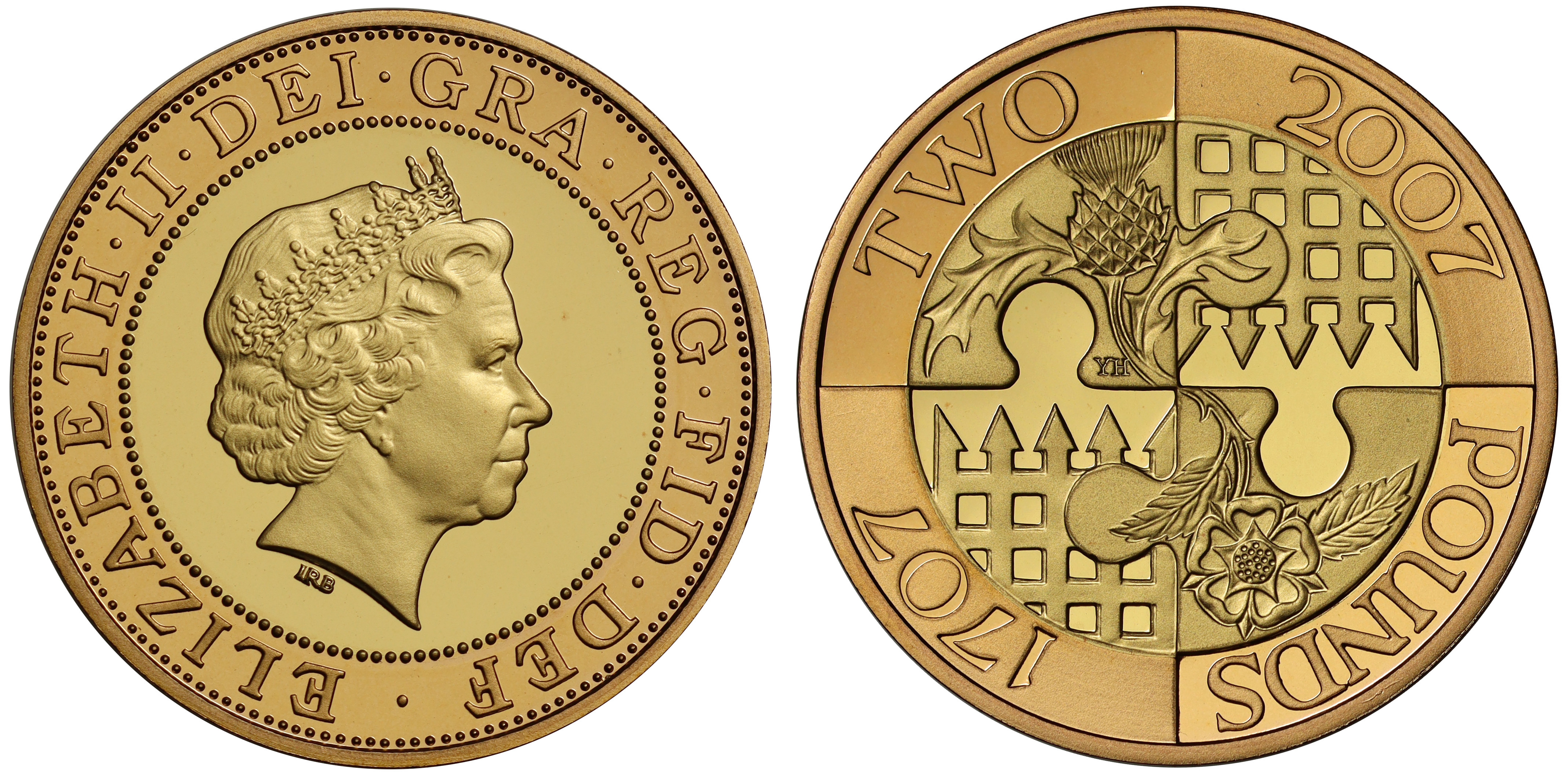 g Elizabeth II (1952-2022), gold proof Two Pounds, 2007, struck to commemorate the Tercentenary of the Act of Union between England and Scotland, crowned head right in 22 carat yellow gold inner with 22 carat red gold surround, IRB initials below for designer Ian Rank-Broadley, Latin legend surrounding, ELIZABETH II. DEI. GRA. REG. FID. DEF. rev. by Yvonne Holton a design dividing the coin into four quarters, with a rose and a thistle occupying two of the quarters, and a portcullis in each of the other two quarters, overlaid with a linking jigsaw motif and surrounded by the dates ‘1707’ and ‘2007’ and the denomination ‘TWO POUNDS’, edge inscription ‘ UNITED INTO ONE KINGDOM’ , 15.97g (S.K22). Scratches to obverse field, accompanied by Royal Mint box and Certificate of Authenticity.