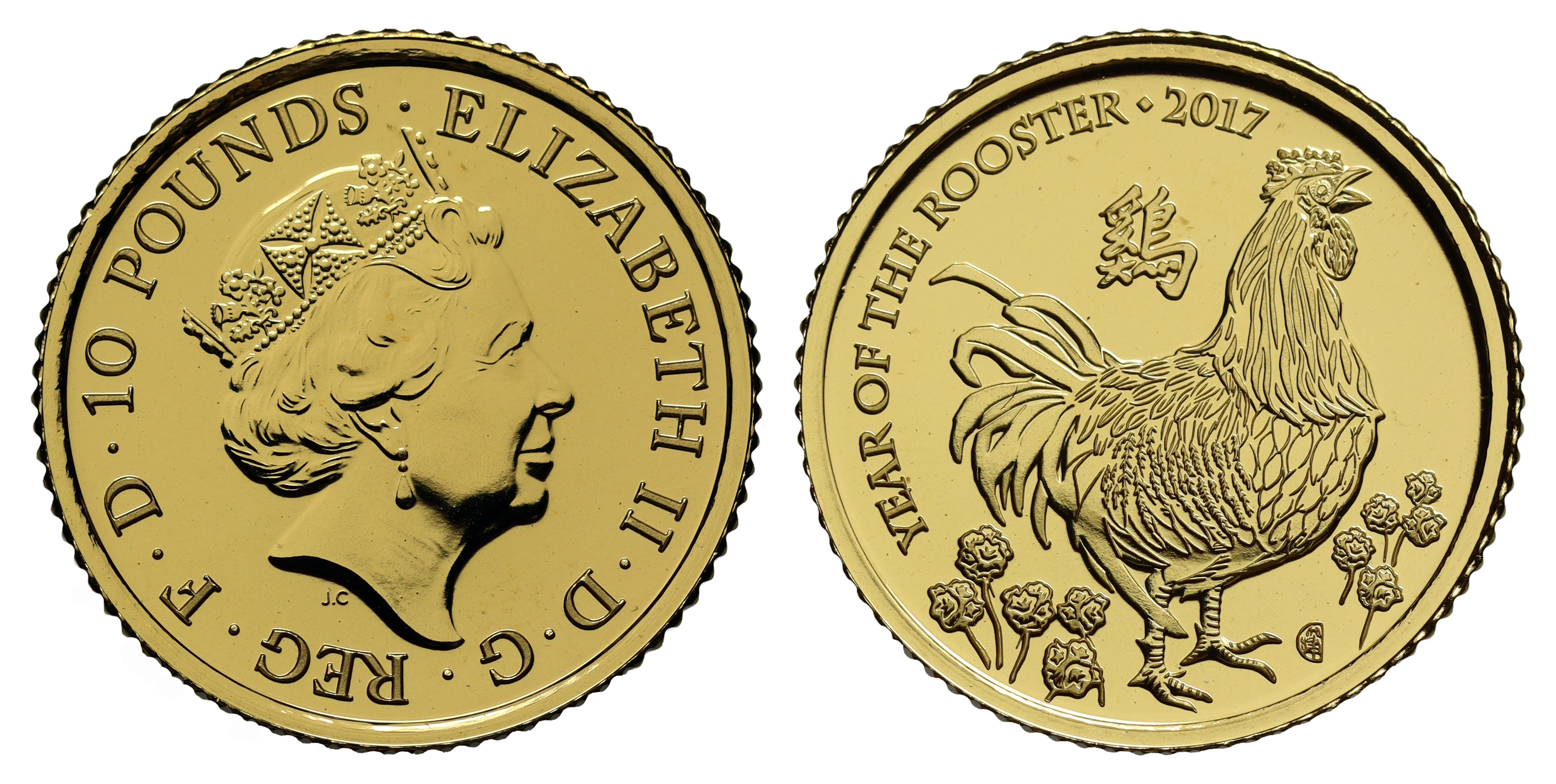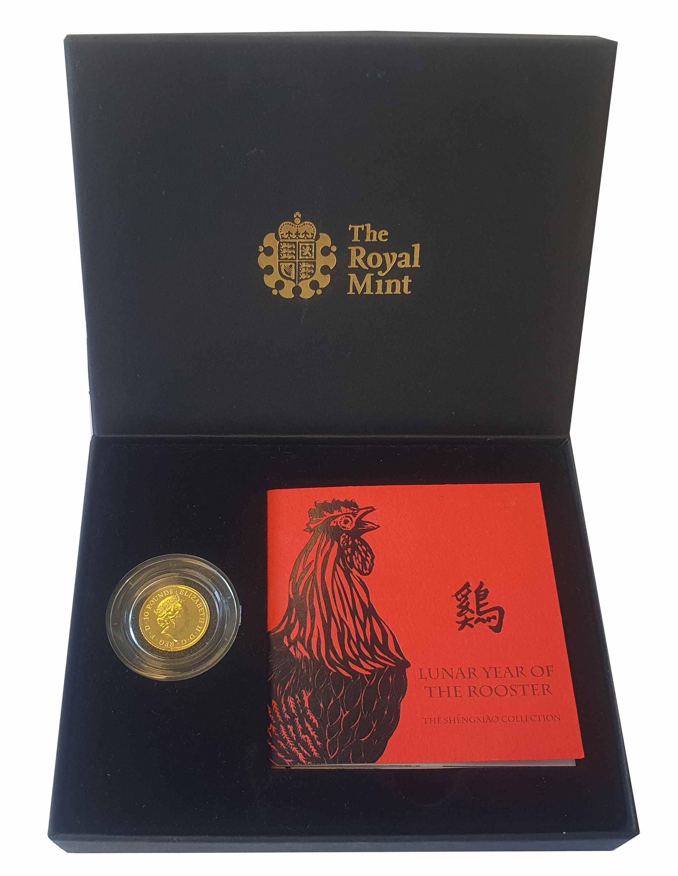 g Elizabeth II (1952-2022), gold Tenth Ounce of Ten Pounds, 2017, struck in 999.9 fine gold, Chinese year of the Rooster, crowned bust right, initials JC behind for designer Jody Clark, Latin legend surrounding, ELIZABETH II. D. G. REG. F.D. 10 POUNDS, rev. design by Wuon-Gean Ho, depiction of a crowing rooster amongst gladioli flowers, inscription YEAR OF THE ROOSTER 2017, Chinese symbol for rooster below, 3.14g (S.CLCE4). Mint state accompanied by Royal Mint box and Certificate of Authenticity.