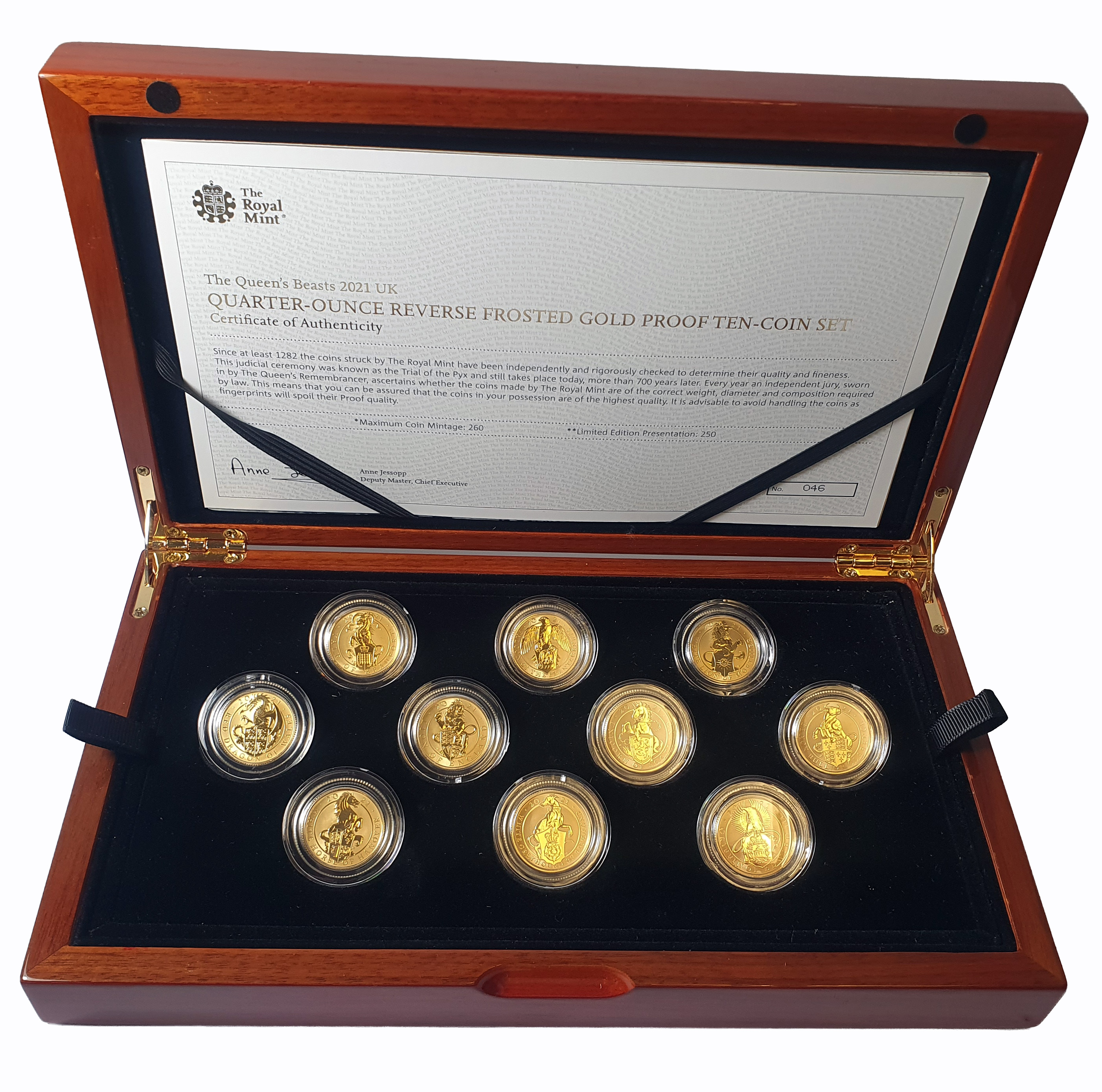 g Elizabeth II (1952-2022), gold Queen’s Beasts Quarter-Ounce 10-coin reverse proof Set, 2021, struck in 999.9 fine gold, featuring the ten beasts which featured on statues created by Sculptor James Woodford RA especially for the coronation of Her Majesty the Queen. Crowned head right, JC initials below for designer Jody Clark, Latin legend and toothed border surrounding, ELIZABETH II. D. G. REG F. D. 25 POUNDS., rev. by Jody Clark each coin has the image of each beast with its name below and date 2021 surrounding (S. QBCGS1). A stunning set in original Royal Mint case and presentation black box, with numbered certificate of authenticity.
