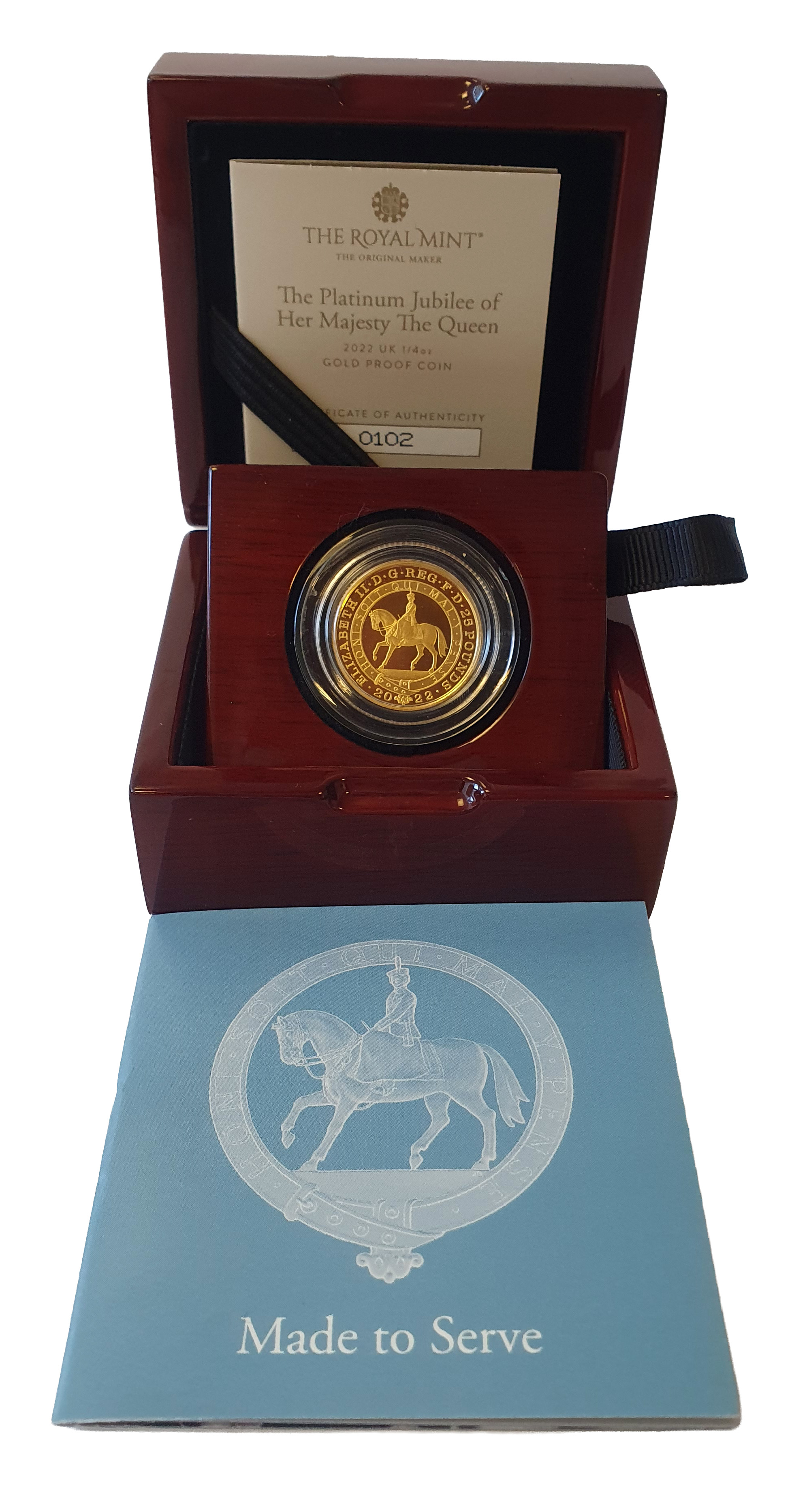 g Elizabeth II (1952-2022), gold proof Quarter-Ounce of Twenty Five Pounds, 2022, struck in 999.9 fine gold, to celebrate the Platinum Jubilee of Her Majesty the Queen, bearing the Queen on horseback in her role as Head of the Armed Forces, surrounded by the Order of the Garter with a buckle, HONI SOIT QUI MAL Y PENSE, JB below for designer John Bergdahl, Latin legend and toothed border surrounding, ELIZABETH. II. D. G. REG. F. D. 25 POUNDS., date below, rev. a crowned depiction of the Royal Arms in royal mantle accompanied by dates ‘1952’ and ‘2022’, 7.80g (S.OC5). Proof state accompanied by Royal Mint box and Certificate of Authenticity.
