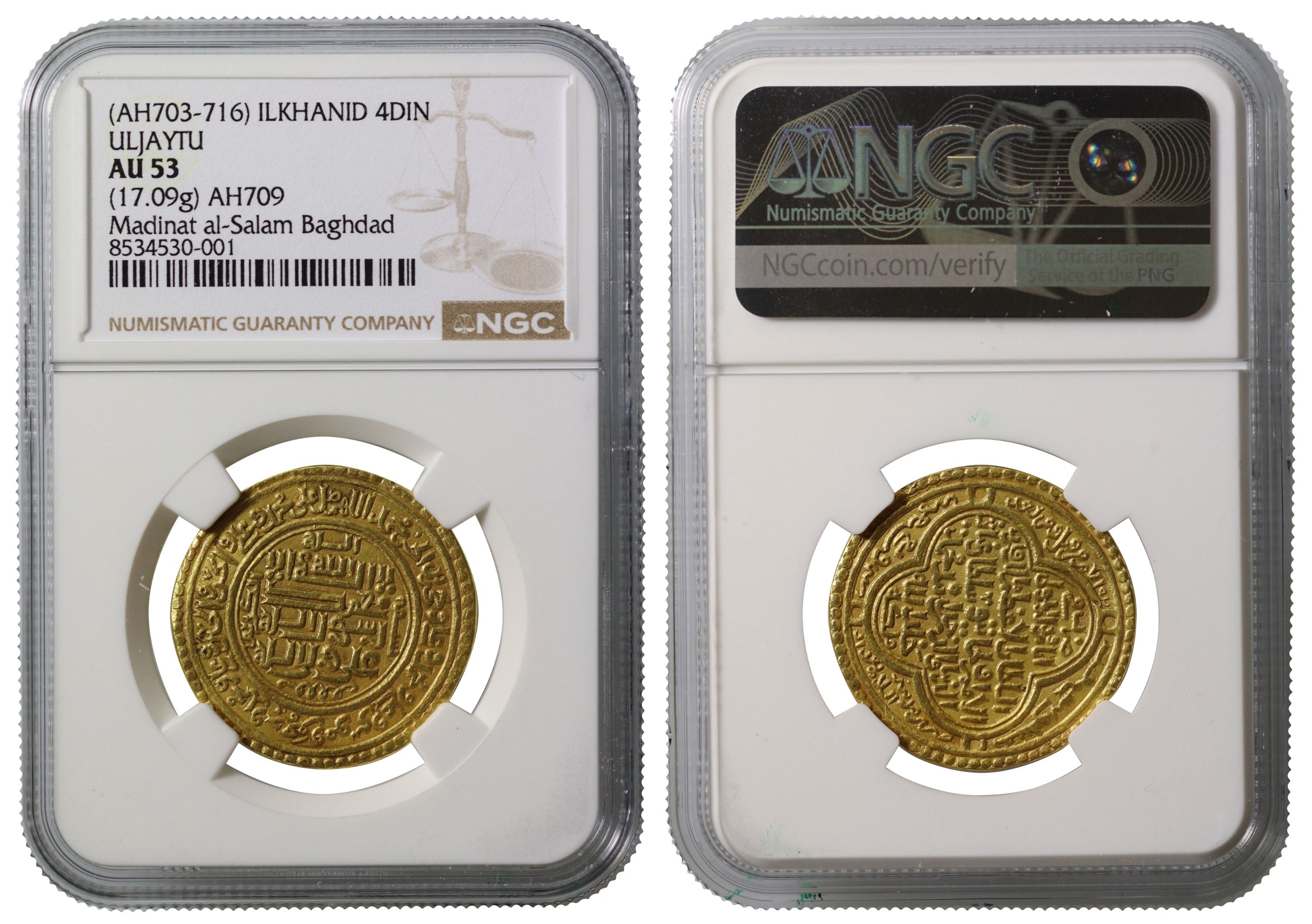 NGC Certification 8534530-001.Provenance:Ex NGSA Auction 10, 3 December 2018, lot 88. In this sale it was said to be the coin sold by Baldwin\'s Auctions in Islamic Coin Auction 19, 25 April 2012, lot 141, but according to the published photograph, they are not the same coin. A footnote in the NGSA catalogue describes the background to the piece very well and we quote it here in translation here rather than trying to rephrase it:The son of the fourth Ilkhan Arghun and a Nestorian princess, Uljaytu was baptized. However, he converted to Shi\'a Islam under the influence of one of his wives and made Shi\'ism the official religion of Persia. Shi\'a verses thus appear on his coins. This extremely rare multiple, minted in Baghdad, is a testament to Ilkhanic art at its zenith. It is likely a presentation piece intended to be presented to high-ranking officials or to be stored in the Khan\'s reserves. - NGSA Auction 10, 3 December 2018, lot 88.