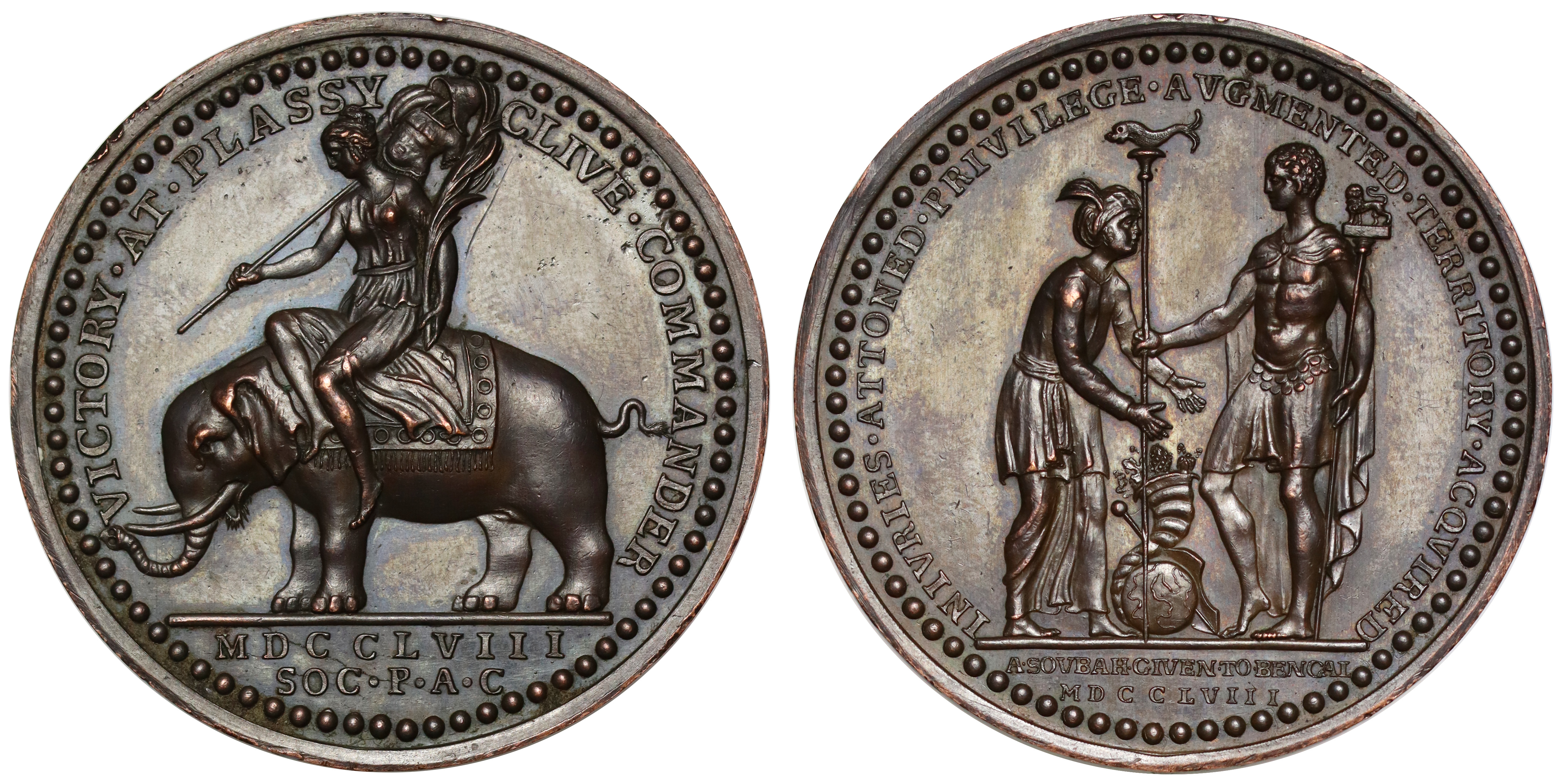 Victory of Lord Clive at Plassey, 1758, bronze medal by John Pingo, Victory riding an elephant left, VICTORY. AT. PLASSY. CLIVE. COMMANDER, in exergue, MDCCLVIII SOC. P.A.C., rev. Clive hands a dolphin-headed staff to Mir Jafar, INIVRIES. ATTONED. PRIVILEGE. AVGMENTED. TERRITORY. ACQVIRED. in exergue, A. SOVBAH. GIVEN. TO. BENGAL. MDCCLVIII, 40mm, 25.18g (MI ii 683/400; Eimer 655; Eimer Pingo 30; Puddester 757). Light cabinet wear to high points, the die crack in its early stages, extremely fine.