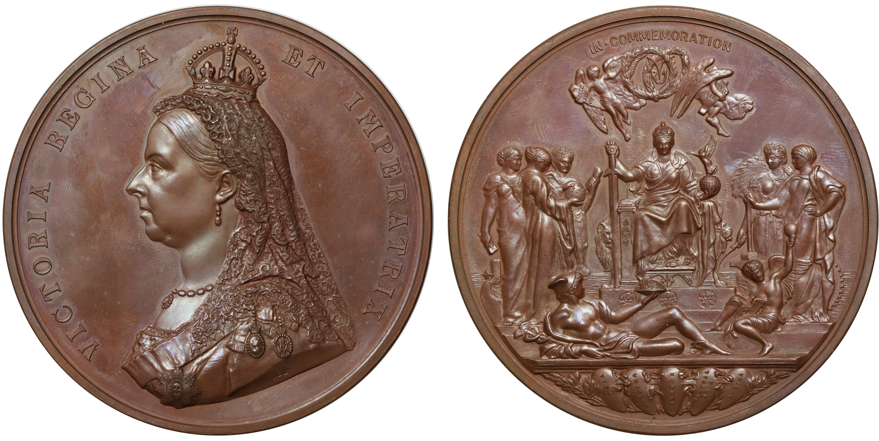 Golden Jubilee of Queen Victoria, 1887, bronze medal by Sir Joseph Edgar Boehm and Frederick, Lord Leighton, crowned and veiled bust left, J.E.B. incuse on truncation, VICTORIA REGINA ET IMPERATRIX, rev. enthroned figure of Empire facing, Mercury and Time at her feet, around her the figures of Science, Letters, Art, Industry and Agriculture, two cherubs above, IN. COMMEMORATION., diameter 78mm, with red leather case of issue and descriptive card (BHM 3219; Eimer 1733a). Toned with some light hairlines, has been slabbed and graded by NGC as MS64 BN.