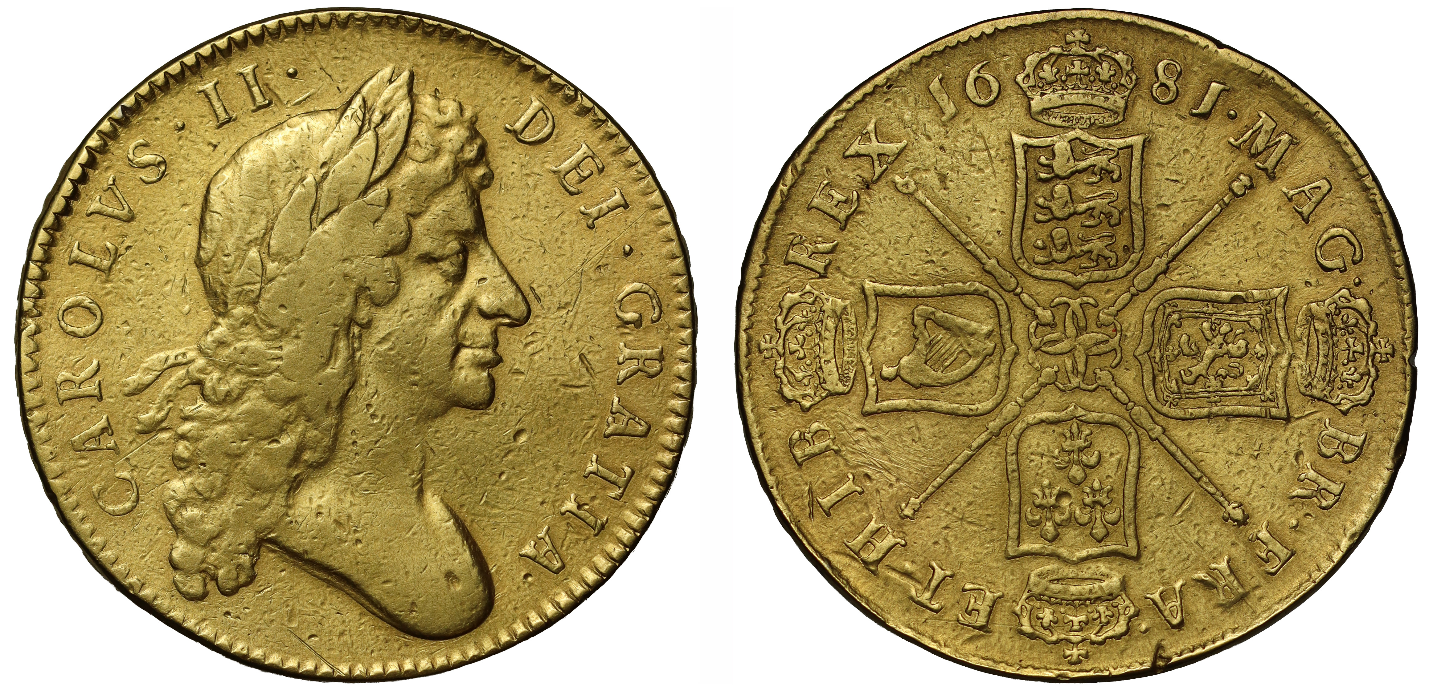 Charles II (1660-85), gold Five Guineas, 1681, second laureate bust right, Latin legend with pellet stops surrounding, CAROLVS. II. DEI. GRATIA., toothed border surrounding, rev. crowned cruciform emblematic shields, emblematic sceptres in angles, four interlinked C’s at centre, date either side of top crown, abbreviated Latin legend, .MAG. BR. FRA. ET.HIB REX.,toothed border surrounding, edge inscribed in raised letters DECVS ET TVTAMEN ANNO REGNI TRICESIMO TERTIO, 41.56g (Schneider -; Bull EGC 194 plate coin; King -; Holloway 31; M.C.E. 23; S. 3331). Removed from a mount, parts of edge inscription smoothed flat with residual solder in places, wear and attrition from circulation plus from being worn as jewellery with slight sweating, scratches and surface marks, fine.
