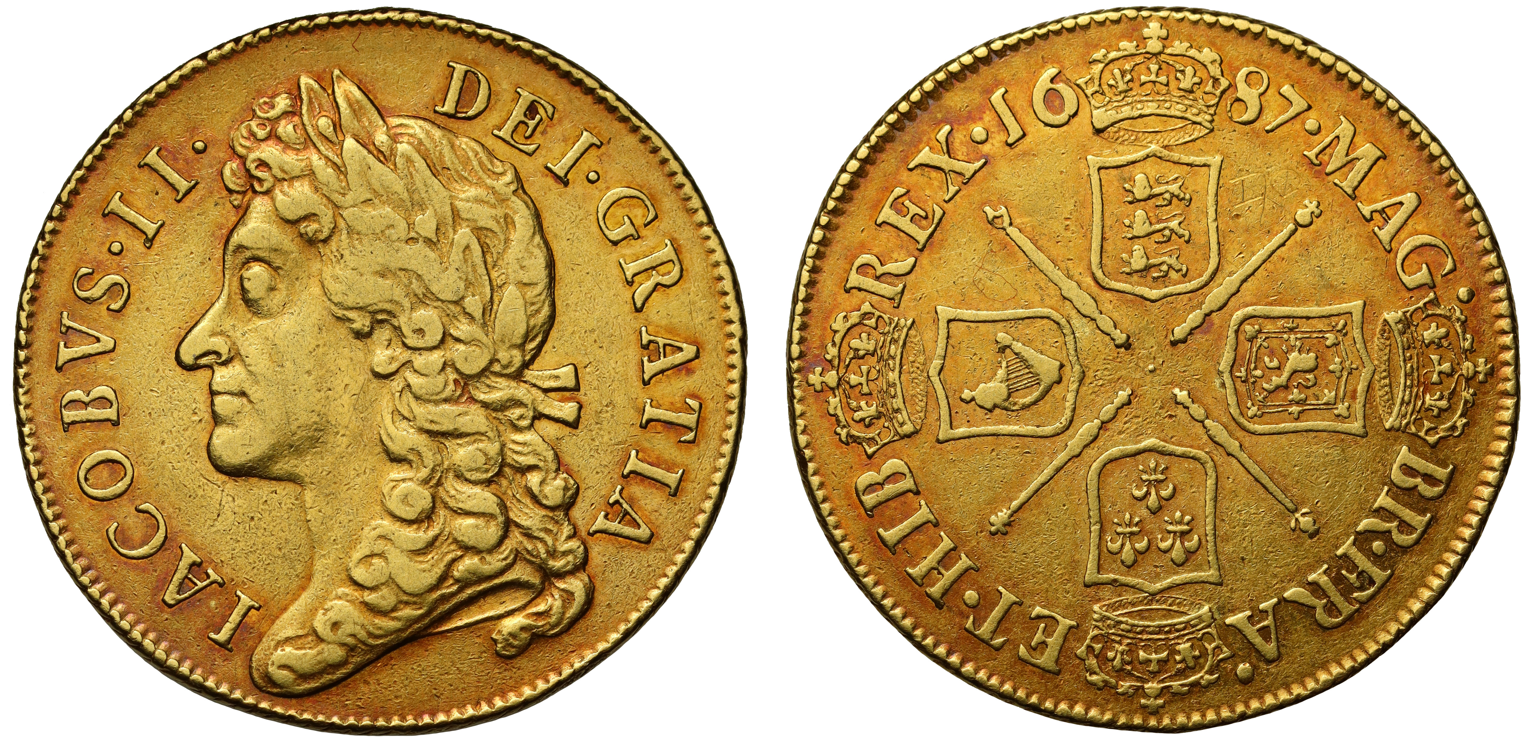 The Latin legends translate as on the obverse James the Second, by the Grace of God, and abbreviated on the reverse as King of Great Britain, France and Ireland.The total output of gold across all four denominations for the calendar year of 1687 was £401,301