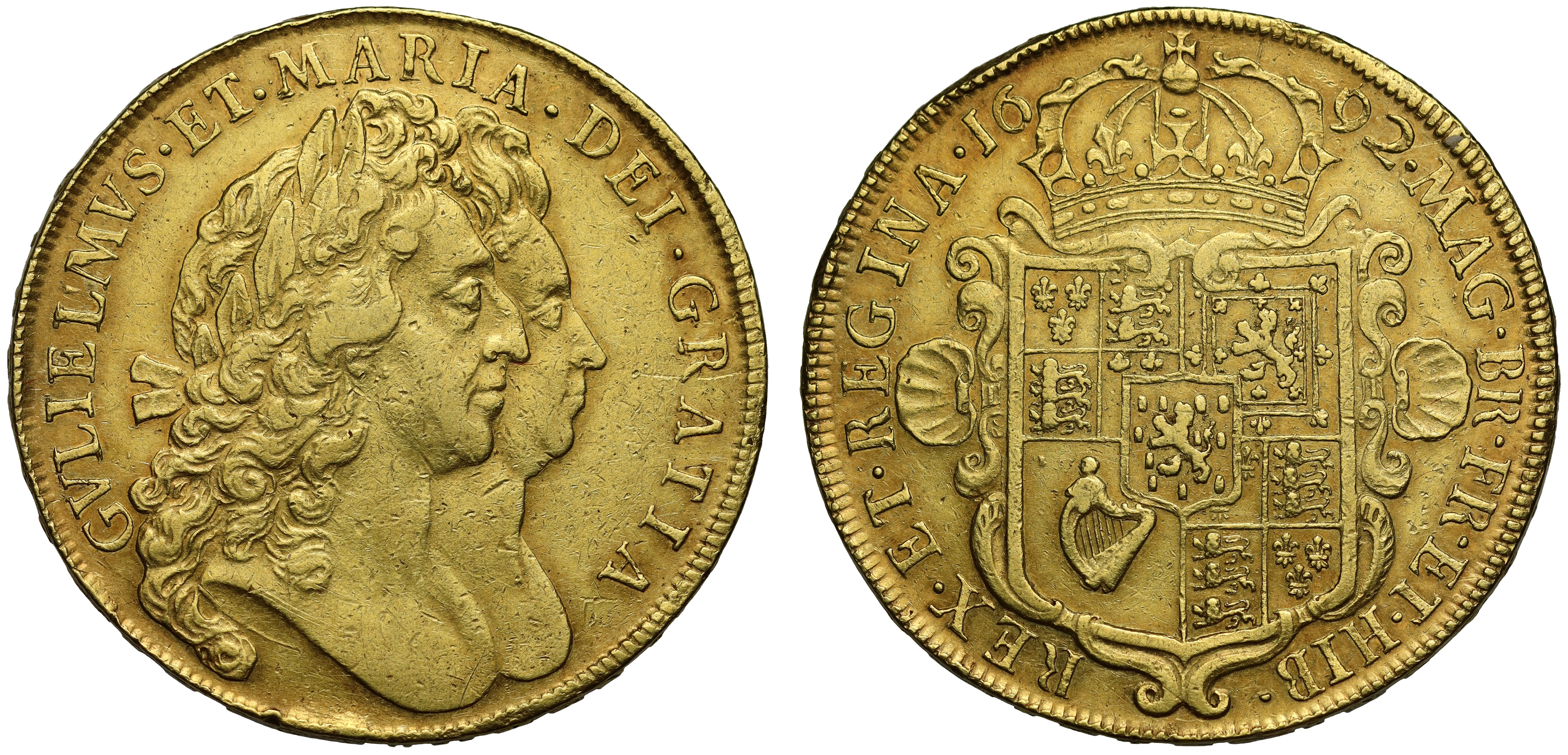William and Mary (1688-94), gold Five Guineas, 1692, conjoined laureate busts right, Latin legend with pellet stops surrounding, GVLIELMVS. ET. MARIA. DEI. GRATIA, toothed border surrounding, rev. crowned quartered shield of arms with scalloped frame, with an escutcheon of the Lion of Nassau, date either side of top crown, abbreviated Latin legend, .MAG. BR. FR. ET.HIB REX. ET. REGINA., toothed border surrounding, edge inscribed in raised letters DECVS ET TVTAMEN ANNO REGNI QVARTO, 41.73g (Schneider -; Bull EGC 347; King 127; Holloway 49; M.C.E. 138; S. 3422). Toned with some light surface marks and wear, rim bruise on reverse with some bubble and smoothing on edge at top of shield area, otherwise almost very fine.