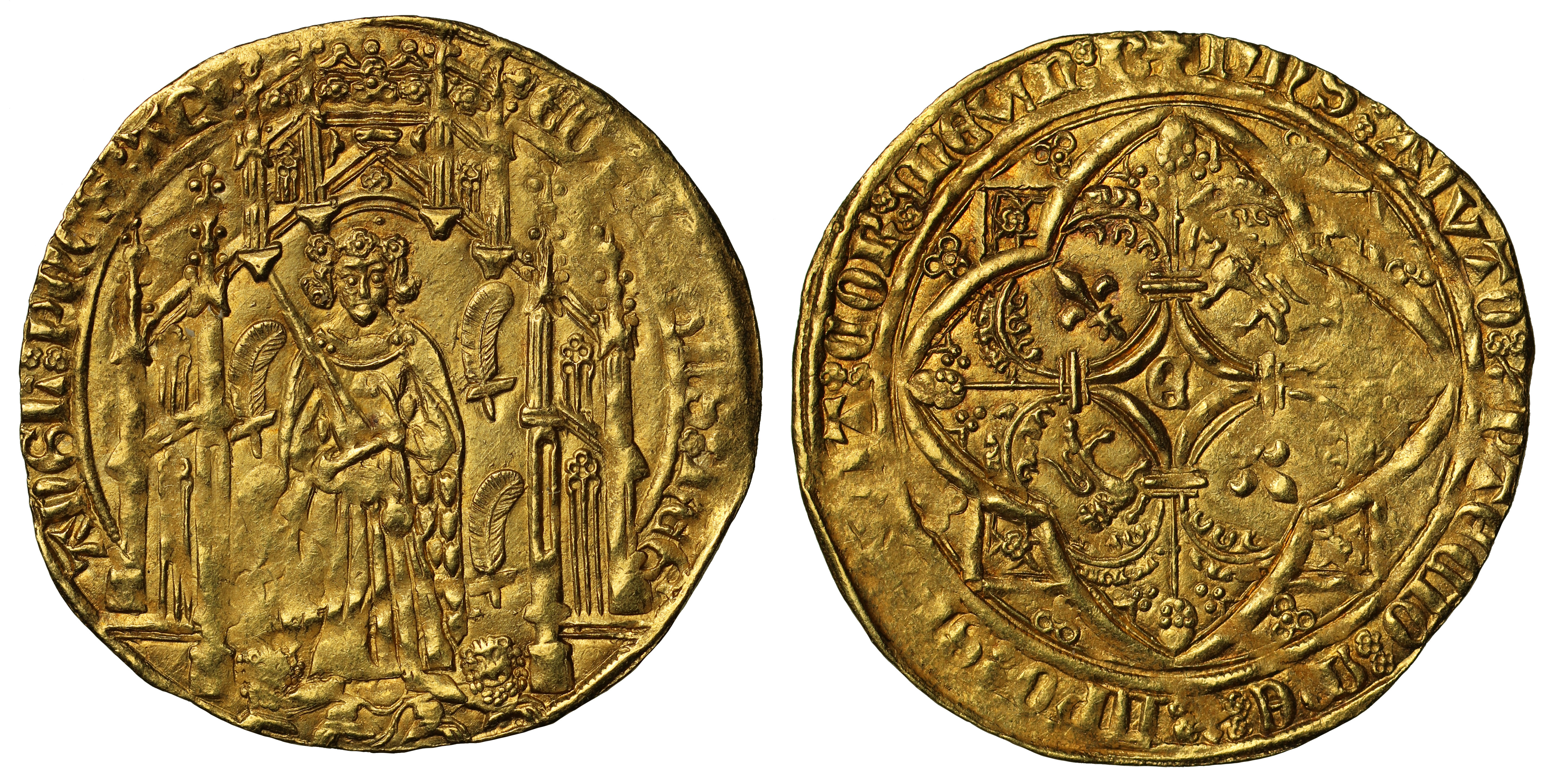 Edward the Black Prince (1362-72), gold Noble Guyennois a la E or Pavillon D’Or, variety without tressure of arcs on obverse, second issue (c.1363-4), Bordeaux Mint, robed Prince standing over two opposing lions, flowers in hair, pointing finger and holding upright sword, four feathers surrounding bending right, all within Gothic portico, Latin legend and beaded borders surrounding, double voided quatrefoil stops, additional voided quatrefoil at start and end of legend, *ED’** PO** Gn’S** REG’ AnGL** PnCS** AQ*, rev. Gothic E at centre of cross quernee, lis and lion in angles, large trefoils in spandrels, Latin legend and beaded borders surrounding, +DnS** AIVTO** Z** PTECIO** Me** Z** IIPO** SPAVIT** COR** mEVm** B, 4.50g (Elias 154b; cf.SCH 53-4; AGC 161A 3/a R2; S.8126). Struck a little off-centre, weak in parts of legend, otherwise very fine with a bolder portrait, and very rare, graded by NGC as MS62.