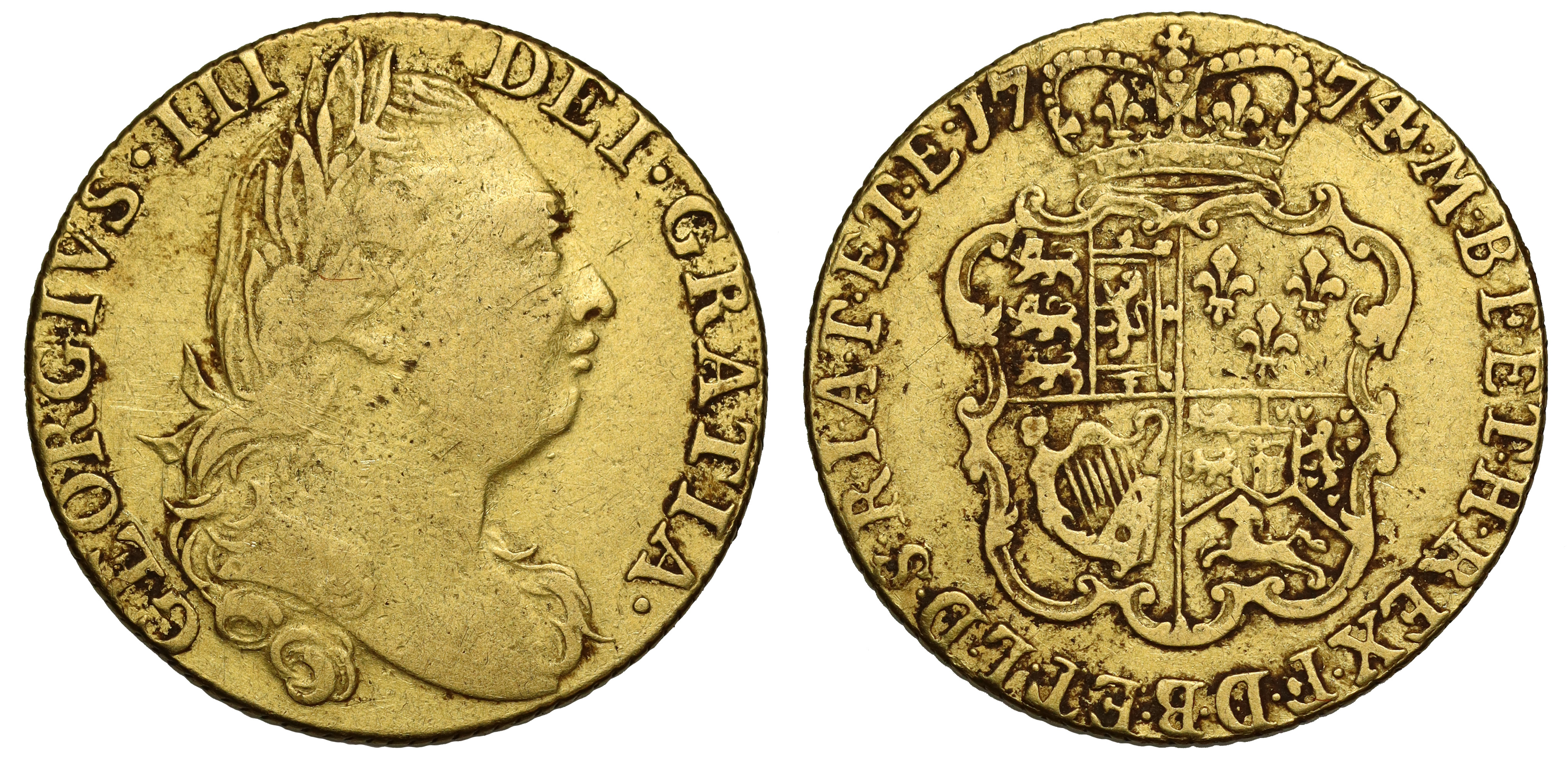 George III (1760-1820), gold Guinea, 1774, fourth laureate head right, GEORGIVS .III DEI.GRATIA., rev. crowned quartered shield of arms, date either side of crown, M.B.F. ET. H. REX. F.D. B.ET. L. D. S. R. I. A. T ET. E., 8.30g (Farey 1140; Bull EGC 687; MCE 379; S.3728). Toned with residual dirt in legends, fine.