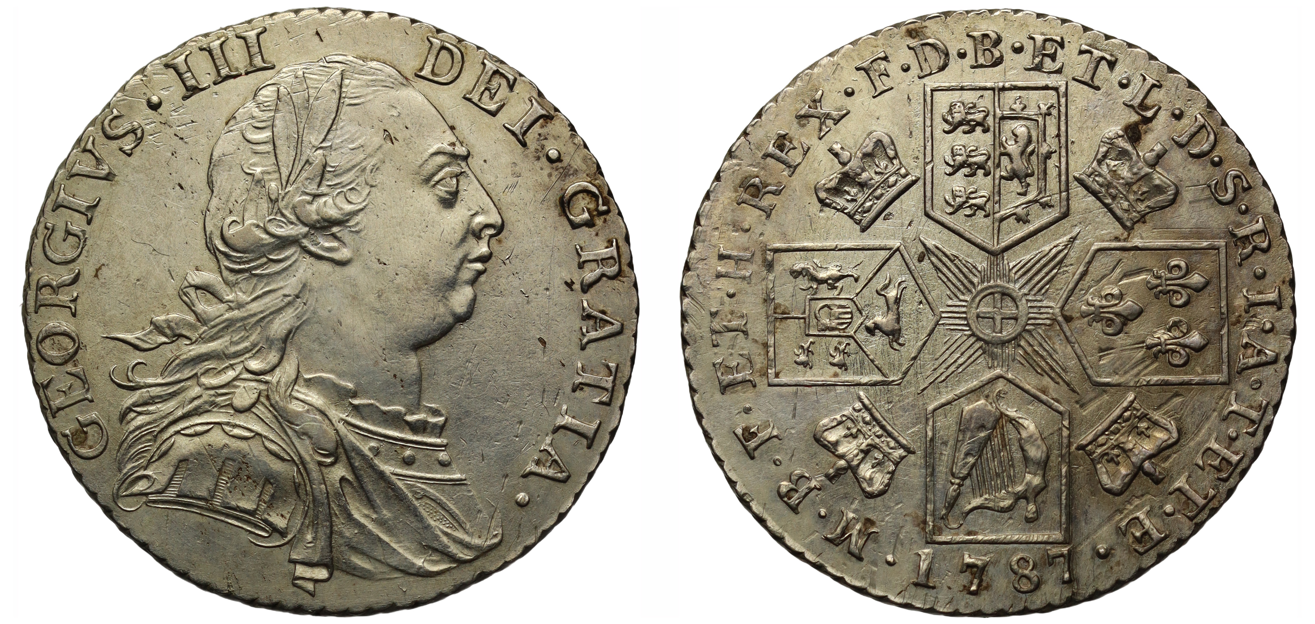 George III (1760-1820), silver Shilling, 1787, variety without hearts and no stop over head, laureate and draped bust right, legend surrounding, GEORGIVS. III. DEI. GRATIA., rev. cruciform shields, without semée of hearts in Hanoverian arms, crowns in angles, garter star at centre, date at bottom, legend surrounding, M.B.FE. ET. H. REX. F.D. B.ET. L. D. S. R. I. A. T ET. E., 5.99g (Bull 2133; ESC 1218; S.3744). Of bright appearance with some flecking and a partial tone to reverse, otherwise practically extremely fine and rare.