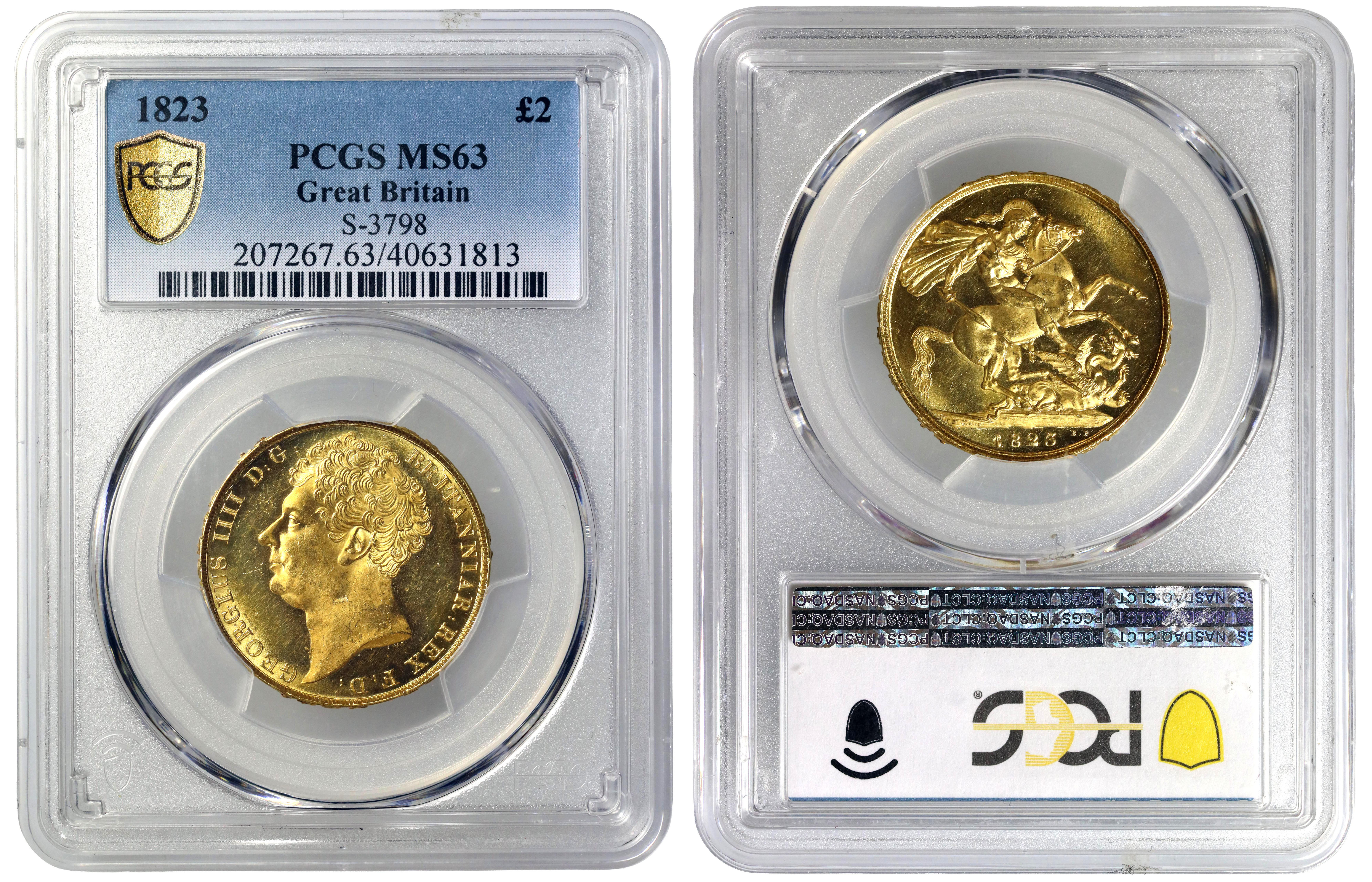 g George IV (1820-30), gold Two Pounds, 1823, bare head left, J.B.M. below truncation for engraver Jean Baptiste Merlen, abbreviated Latin legend and toothed border surrounding, GEORGIUS IIII D:G: BRITANNIAR: REX F:D:, rev. St. George and dragon right, W.W.P. below broken lance on ground-line for Mint Master William Wellesley Pole, date in exergue, initials B.P. to upper right of exergue for engraver Benedetto Pistrucci, edge engraved in raised letters, DECUS ET TUTAMEN. ANNO REGNI IV., 15.96g (Schneider 635; Hill T6; Bull EGC 945; MCE 470; S.3798). Brilliant almost proof-like, slabbed and graded by PCGS as MS63, with certificate from Royal Mint Collector Services.