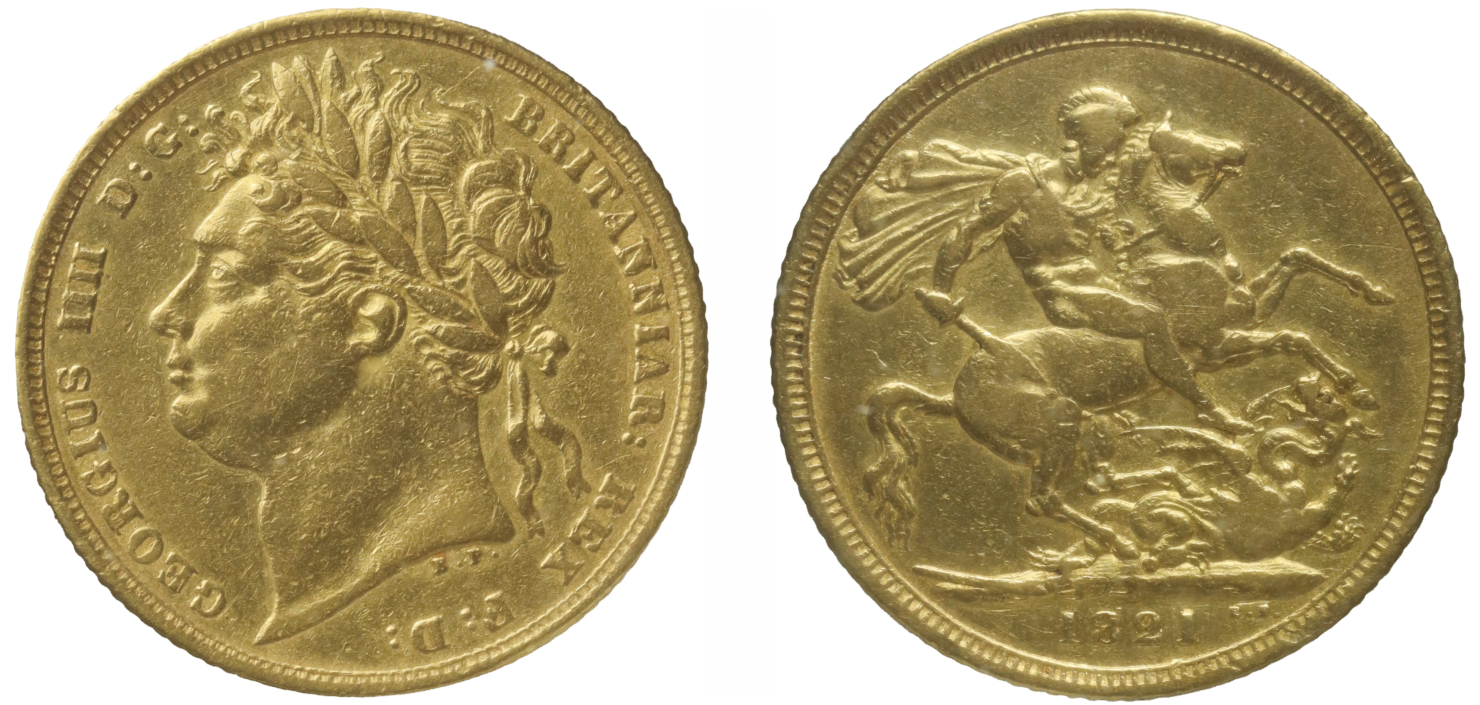 g George IV (1820-30), gold Sovereign, 1821, first laureate head left, some doubling in the B.P. initials below neck, legend surrounding, GEORGIUS IIII D: G: BRITANNIAR: REX F:D:, rev. St George and dragon right, date in exergue, B.P. to upper right of exergue for designer and engraver Benedetto Pistrucci, raised WWP on ground line below lance for Master of the Mint William Wellesley Pole (Bentley 12; Hill 5; Bull EGC 959; MCE 471; S.3800). Wear to high points, otherwise a bold fine, all housed in Royal Mint Collector Services capsule, card with certificate.