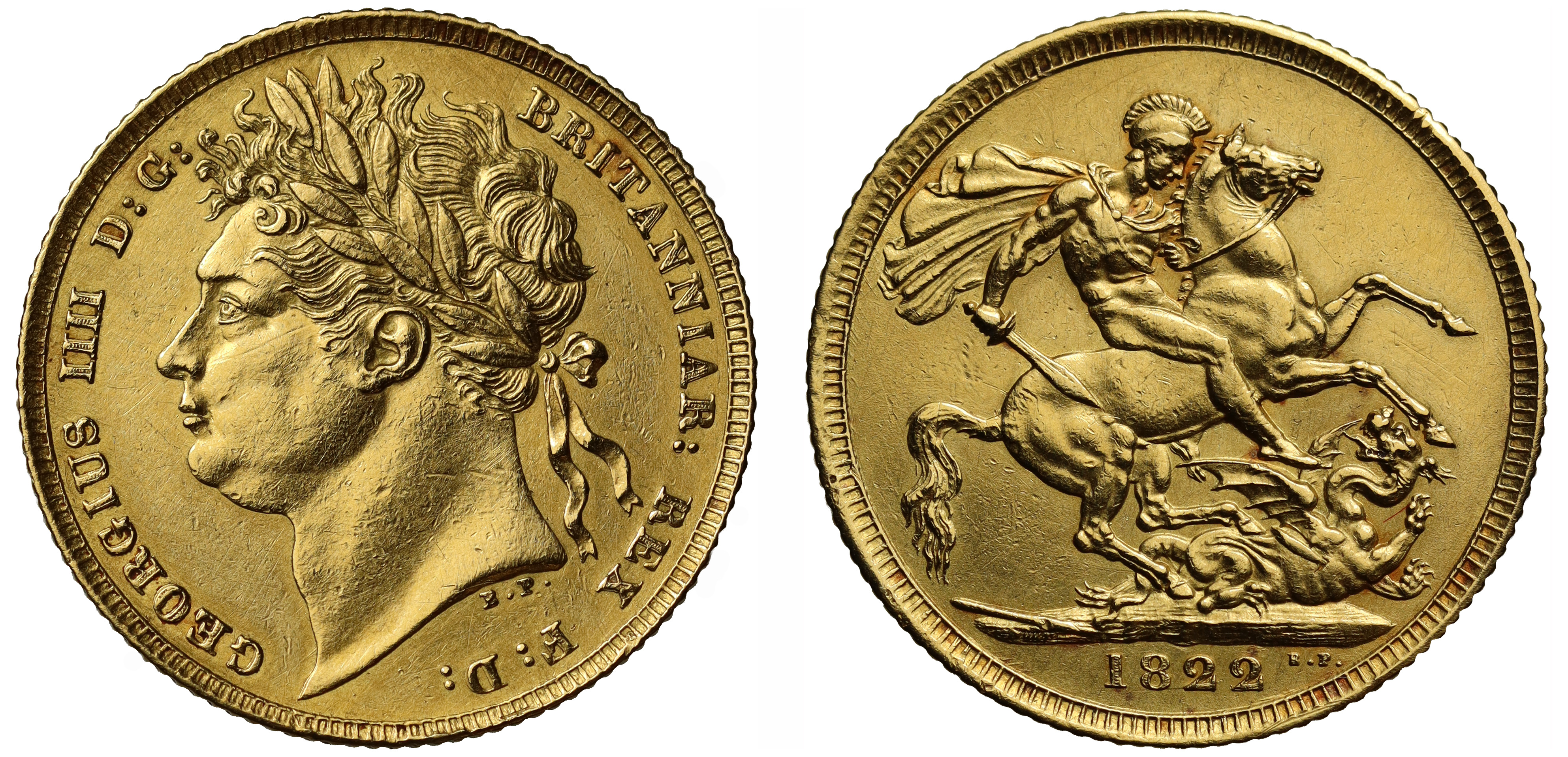 g George IV (1820-30), gold Sovereign, 1822, first laureate head left, B.P. below neck for Benedetto Pistrucci, legend and toothed border surrounding, GEORGIUS IIII D: G: BRITANNIAR: REX F:D:, rev. die axis slightly off-centre, St George and dragon right, date in exergue, B.P. to upper right of exergue for designer and engraver Benedetto Pistrucci, raised WWP on ground line below lance for Master of the Mint William Wellesley Pole, 7.97g (Bentley 13; Hill 6; Bull EGC 961; M.C.E. 472; S.3800). Toned, though once cleaned with tooled fields, old scratch smoothed on cheek, another area of scratches between horse front legs, otherwise very fine.