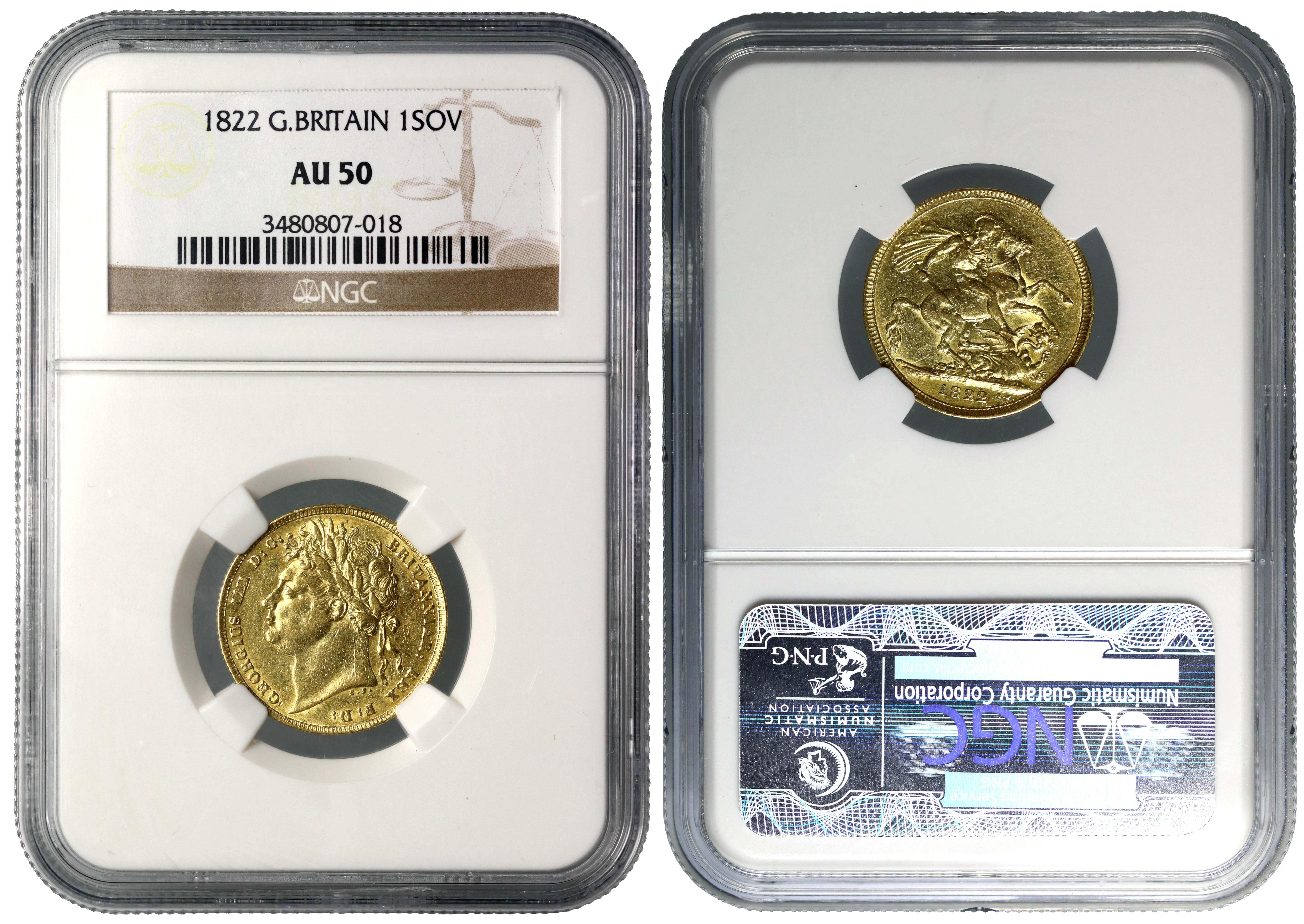g George IV (1820-30), gold Sovereign, 1822, first laureate head left, B.P. below neck for Benedetto Pistrucci, legend and toothed border surrounding, GEORGIUS IIII D: G: BRITANNIAR: REX F:D:, rev. die axis slightly off-centre, St George and dragon right, date in exergue, B.P. to upper right of exergue for designer and engraver Benedetto Pistrucci, raised WWP on ground line below lance for Master of the Mint William Wellesley Pole (Bentley 13; Hill 6; Bull EGC 961; M.C.E. 472; S.3800). Toned with wear and surface marks, slabbed and graded by NGC as AU50.