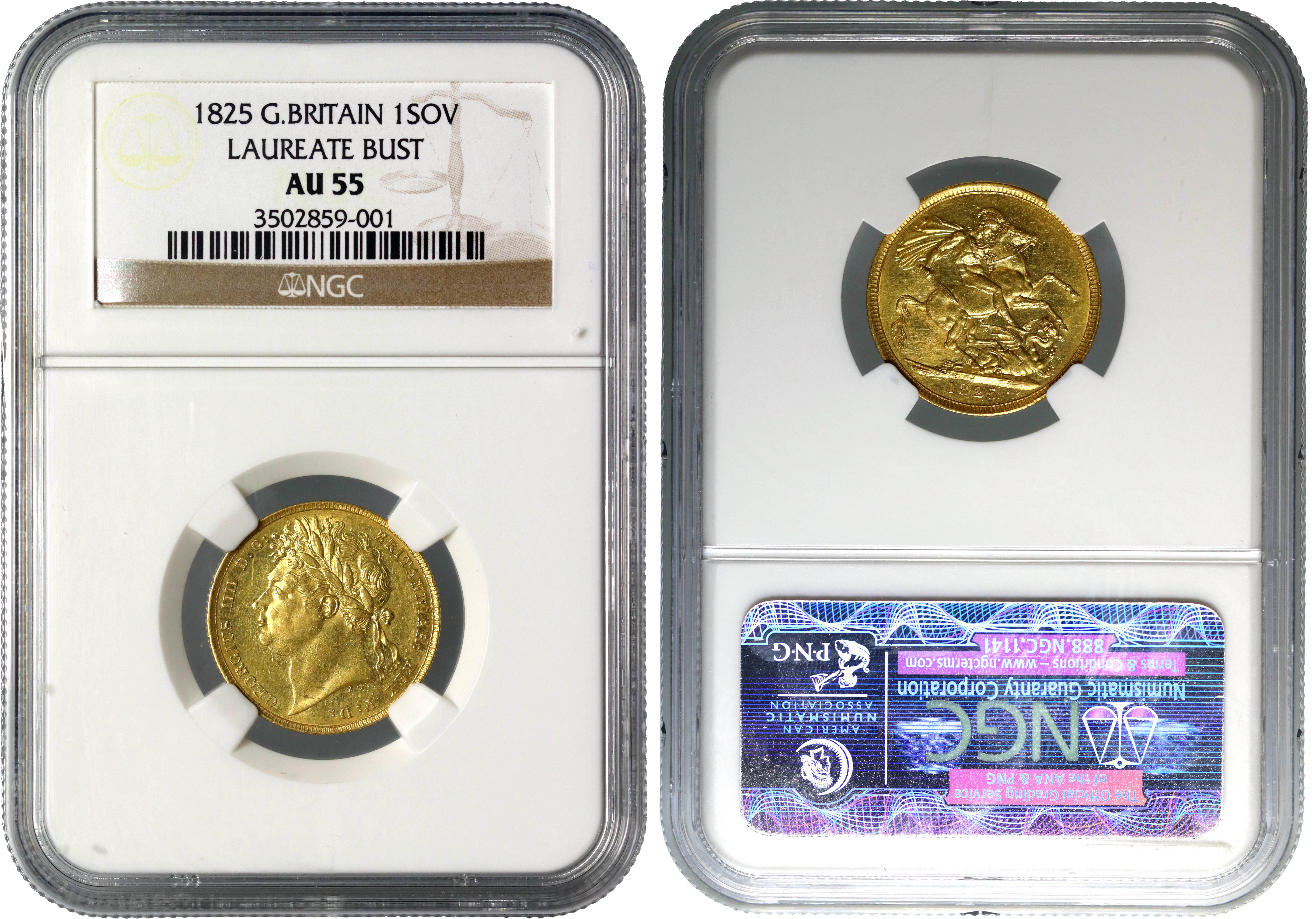 g George IV (1820-30), gold Sovereign, 1825, first laureate head left, B.P. below neck for Benedetto Pistrucci, legend and toothed border surrounding, GEORGIUS IIII D: G: BRITANNIAR: REX F:D:, rev. St George and dragon right, date in exergue, B.P. to upper right of exergue for designer and engraver Benedetto Pistrucci, raised WWP on ground line below lance for Master of the Mint William Wellesley Pole (Bentley 952; MCE.485; Hill 9 R3; EGC.994 R3; S.3800). Toned with some brilliance, hairlines and surface marks, slabbed and graded by NGC as AU55, very rare.