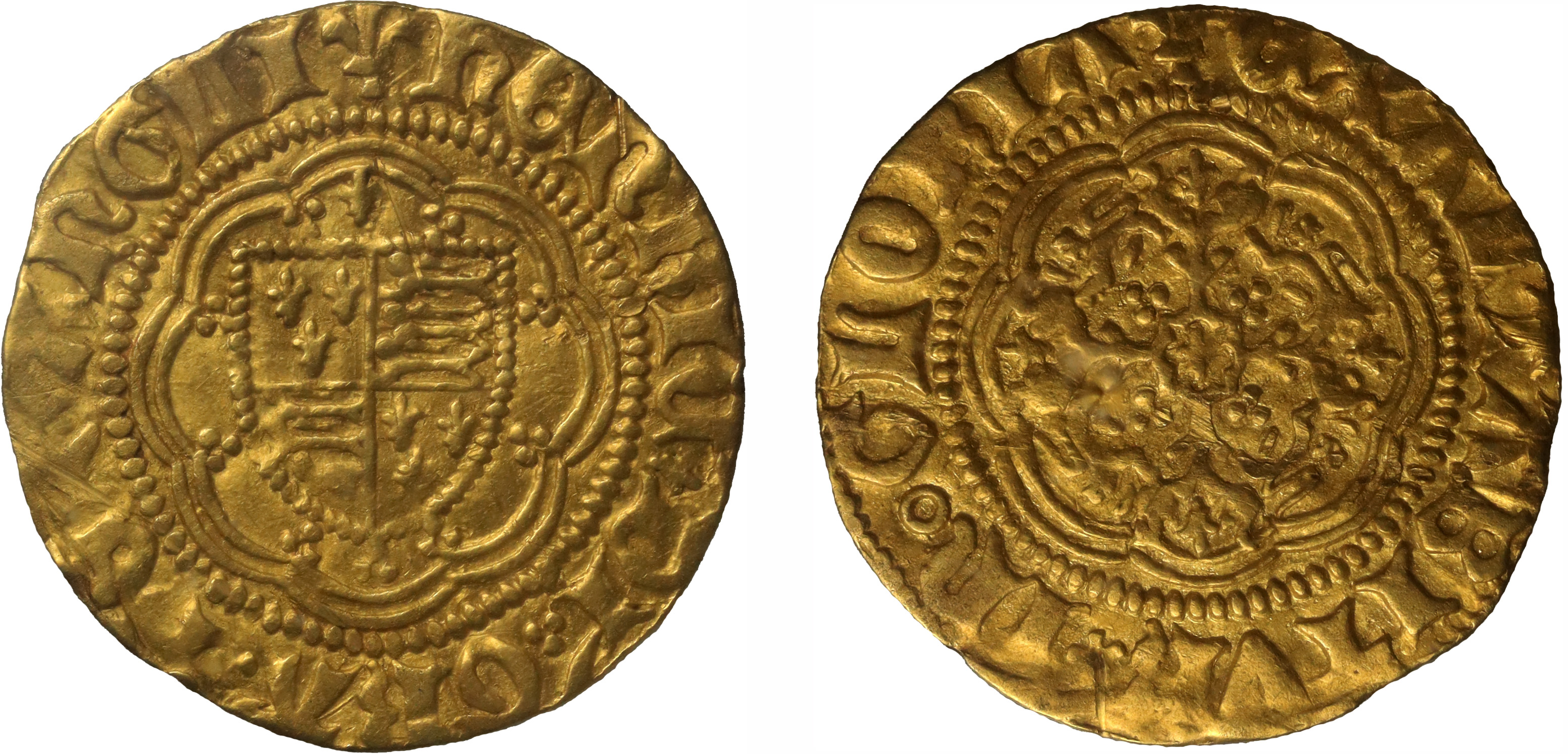 Henry VI, first reign (1422-61), gold Quarter-Noble, London Mint, Annulet Issue (c.1422-30), quartered shield, lis above, double linear tressure of eight arcs surrounding, trefoils on cusps, Latin legend and beaded borders surrounding, initial mark large lis both sides, reads + hЄnRIC’:. DI:. GRΛ:. RЄX:. ΛnGL, rev. lis at centre of ornate cross with small lis terminals, tri-pellets attached to inner compartment, lions in angles, double linear tressure of eight arcs surrounding, Latin legend mullet and annulet stops, beaded borders surrounding, + ЄXΛLTΛBITVR* Ino GLORIΛ, 1.68g (Schneider 295; Whitton 1; N.1420; S.1815). Toned, with light crease across reverse, otherwise very fine.