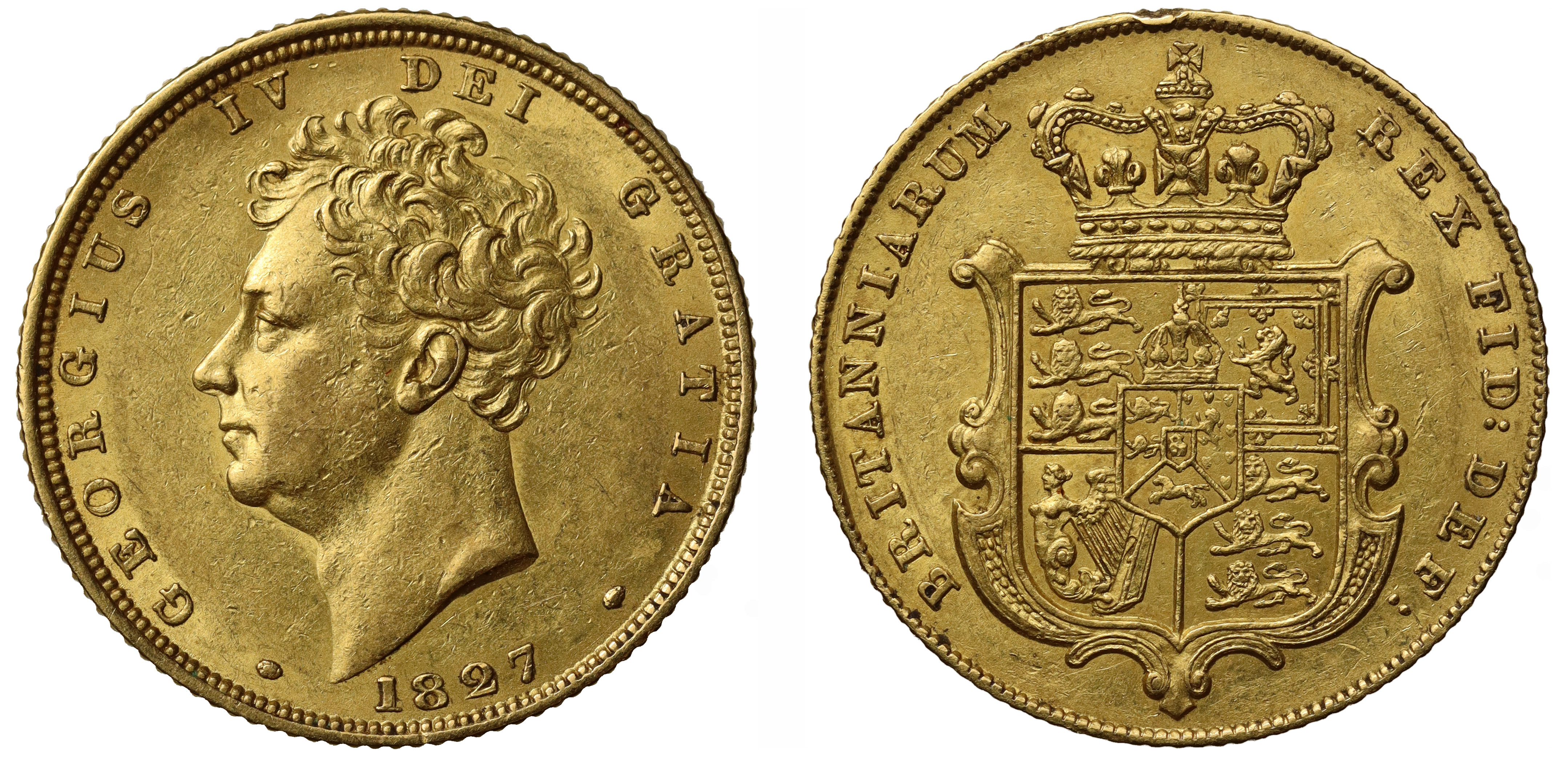 g George IV (1820-30), gold Sovereign, 1827, second bare head left, date below neck, Latin legend and toothed border surrounding, .GEORGIUS IV DEI GRATIA., rev. crowned quartered shield of arms, BRITANNIARUM REX FID: DEF:, edge milled, 7.98g (Bentley 20; Hill 12; S.3801). Toned with surface marks, reverse with rim nick, very fine.