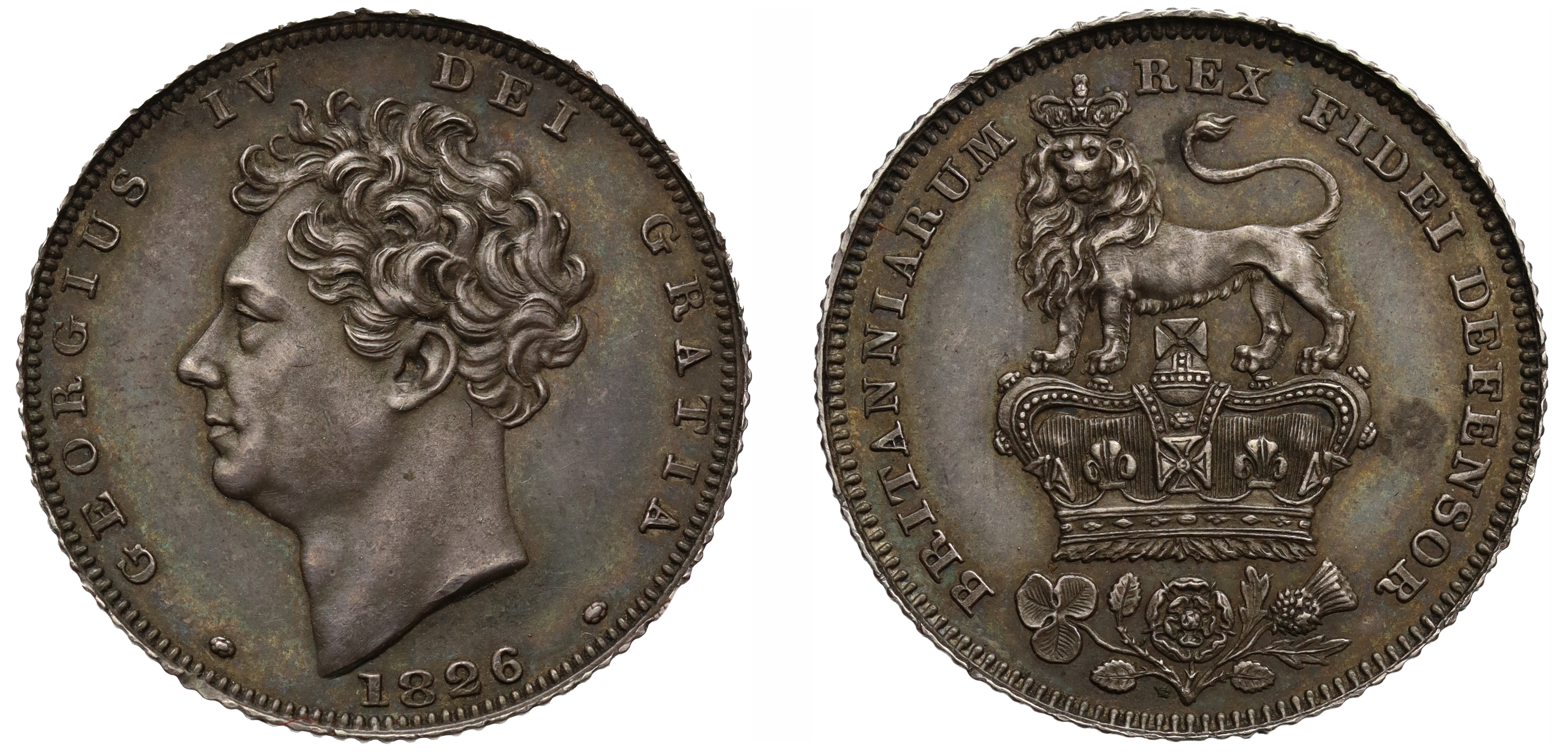 George IV (1820-30), silver Proof Sixpence, 1826, second bare head left, with extra tuft of hair by ear, date below, legend and toothed border surrounding, GEORGIUS IV DEI GRATIA, rev. inverted die axis, crowned lion standing left on large crown over emblems, legend commences lower left, BRITANNIARUM REX FIDEI DEFENSOR, 2.84g (Bull 2434 R2; Davies 270 dies 1+A; ESC 1662A; S.3815). Attractively toned, practically as struck, good extremely fine.