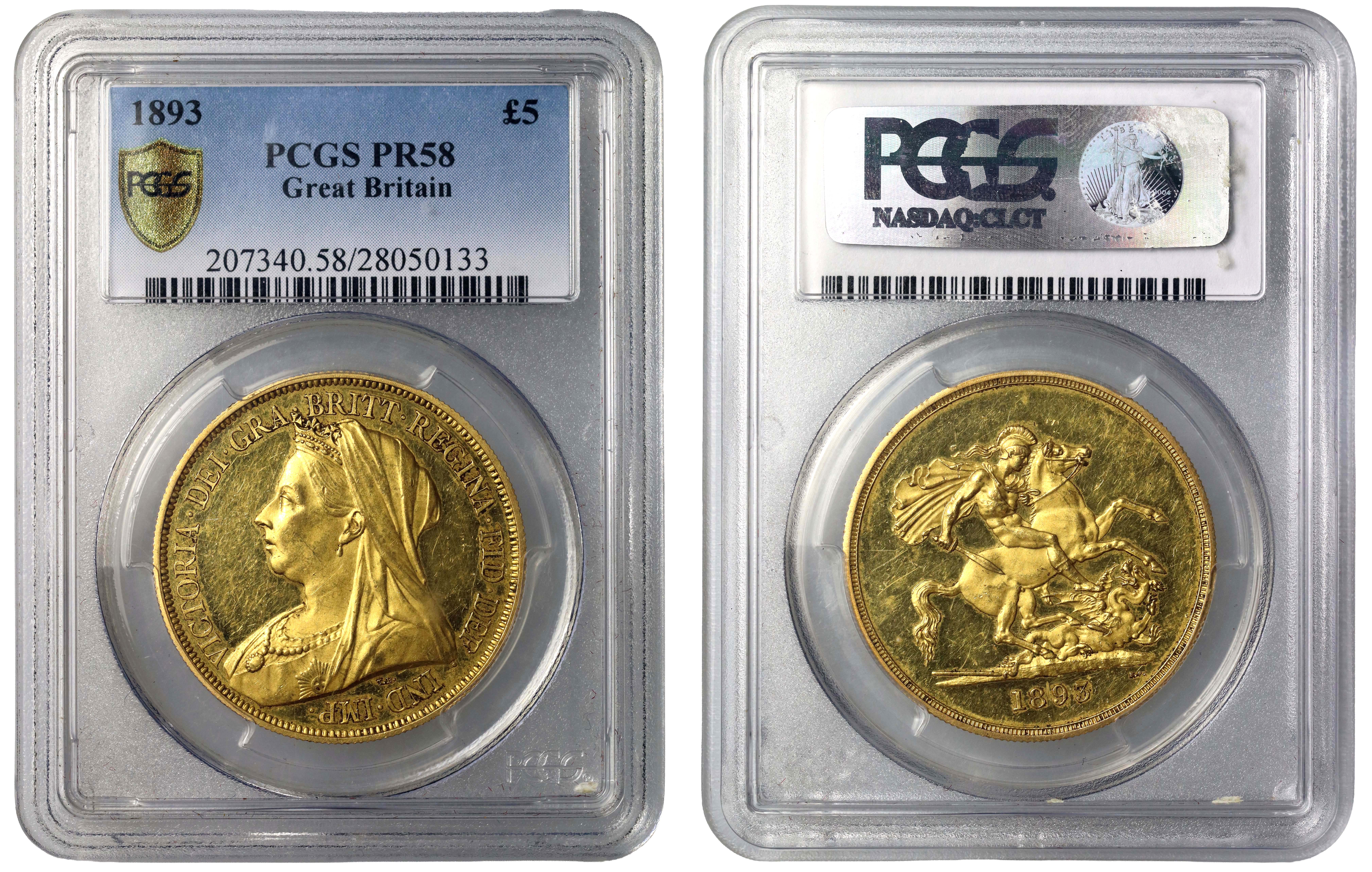 g Victoria (1837-1901), gold Proof Five Pounds, 1893, crowned, veiled bust left, T.B. initials below truncation for engraver Thomas Brock, Latin legend and toothed border surrounding, VICTORIA· DEI· GRA· BRITT· REGINA· FID· DEF· IND· IMP·, rev. St George and dragon right, date in exergue, B.P. to upper right of exergue (WR 287; Hill F34 S; Bull EGC 1376; L&S 108; S.3872). Toned with lots of ticks and surface marks, slabbed and graded by PCGS as PR58.